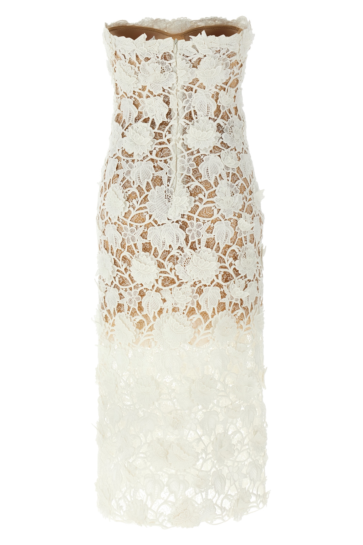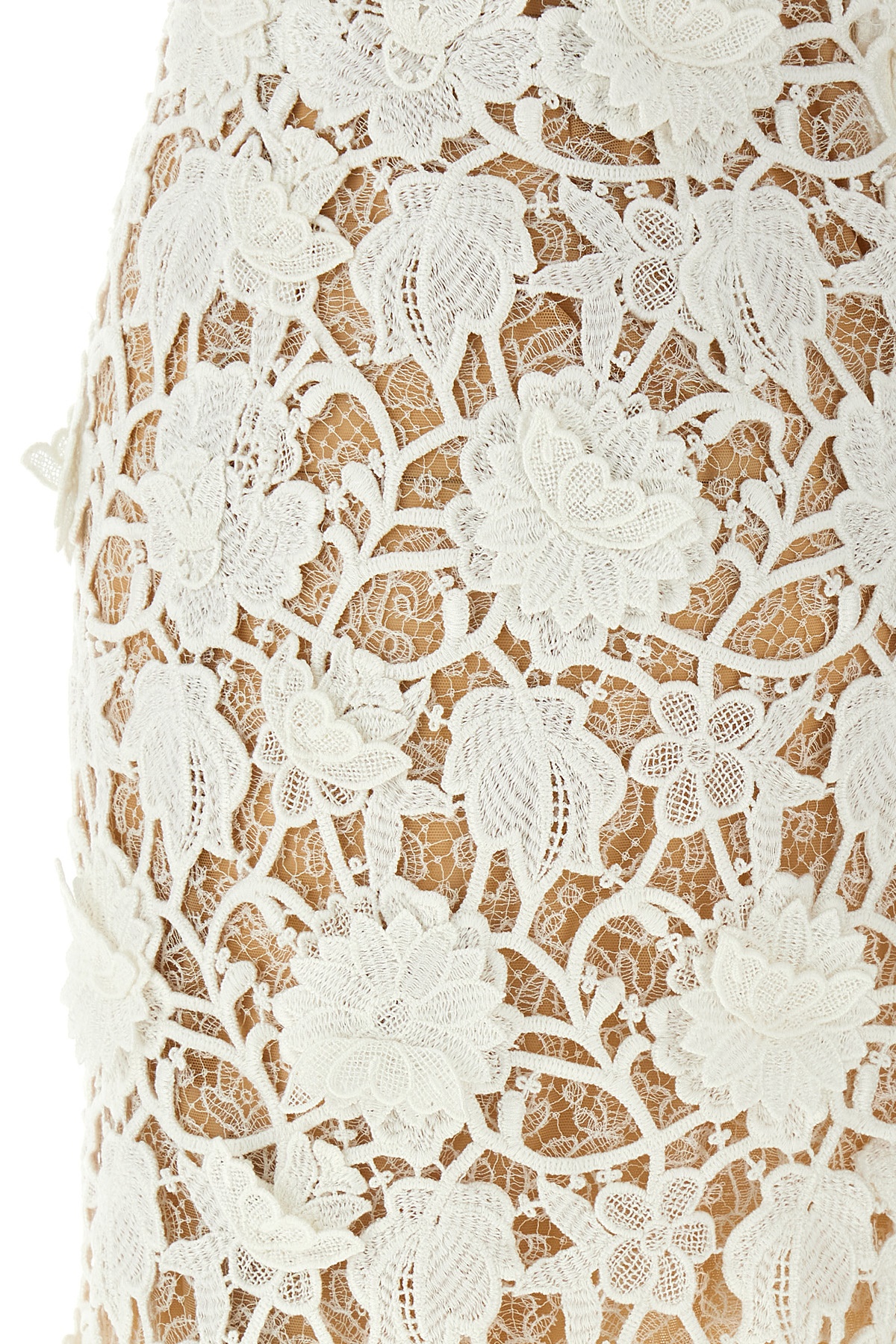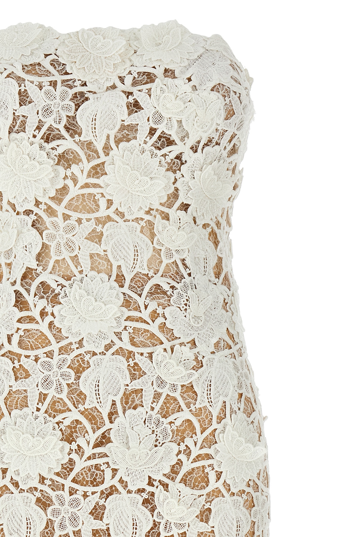 Macrame lace sheath dress with floral pattern, off-the-shoulder style with contoured corset inside, jagged hem, back zip closure, stretch tulle petticoat.
