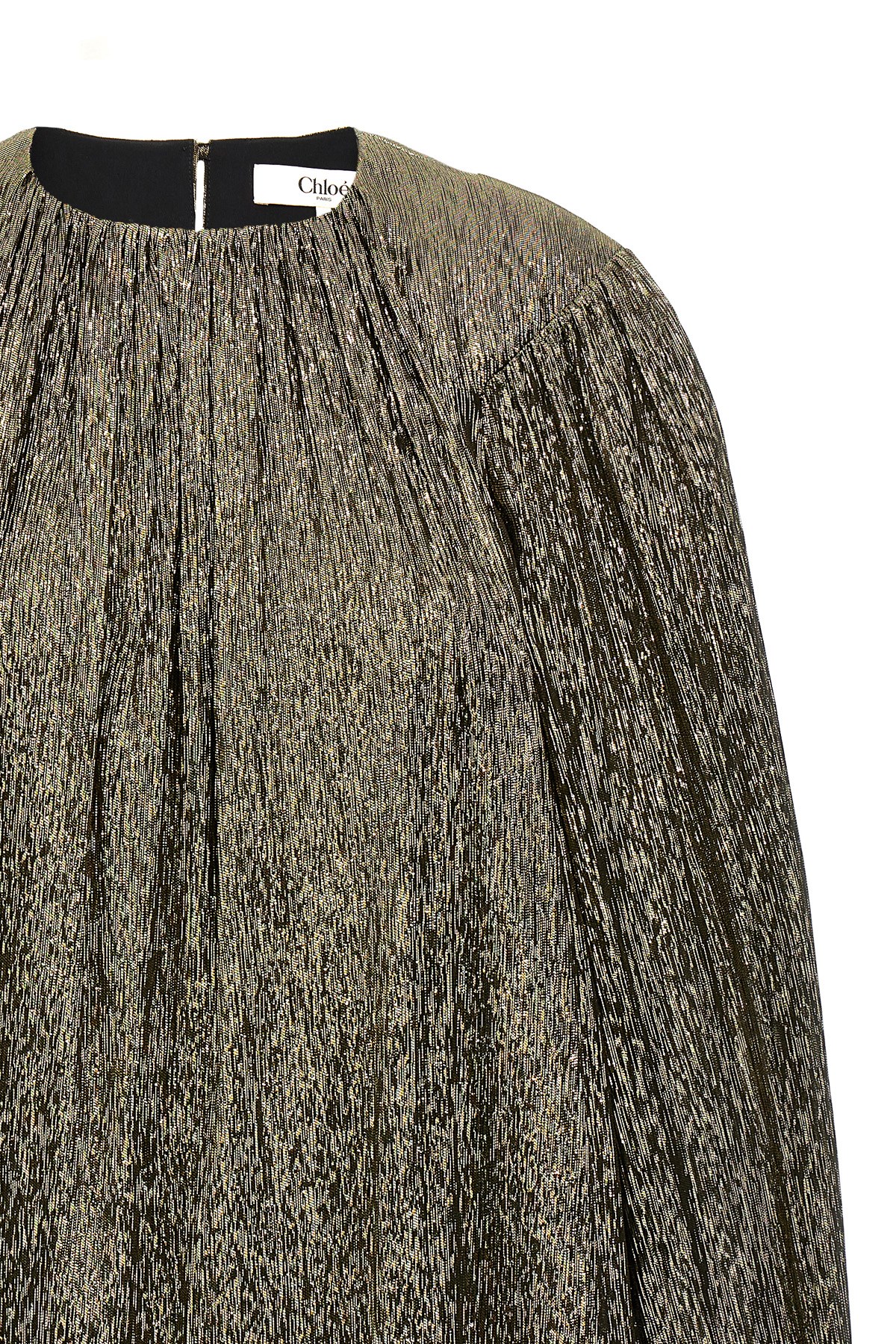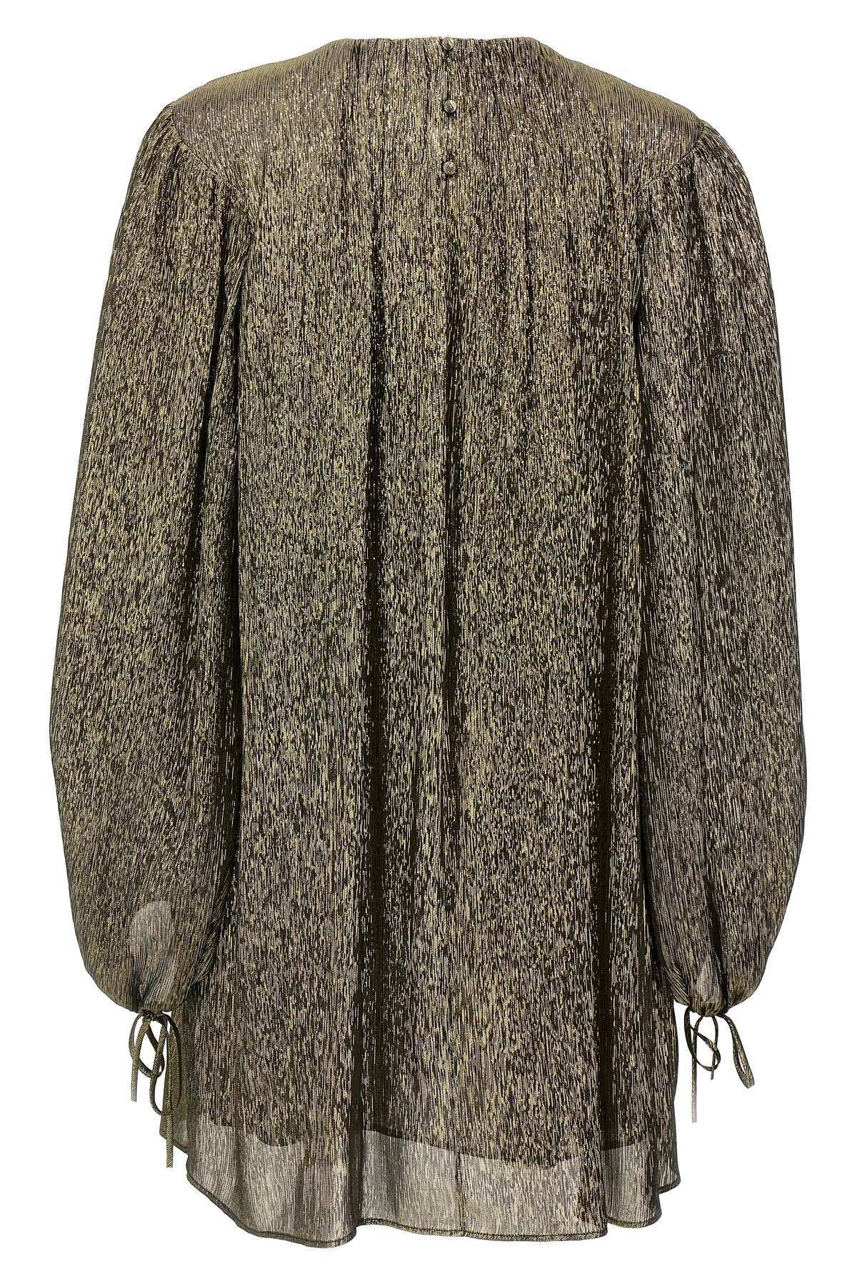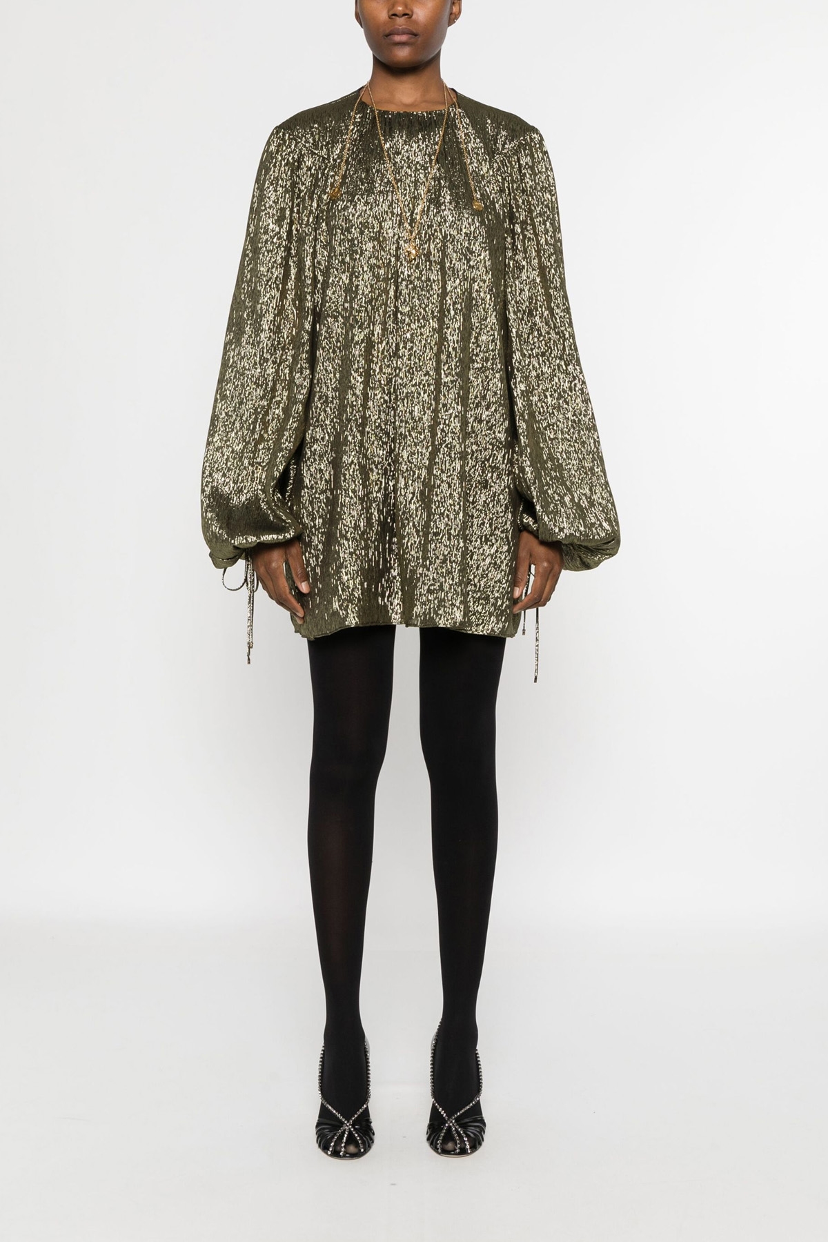 Lame silk mini dress, crew neck, loose fit, slightly puff long sleeves with lacing on the hem.