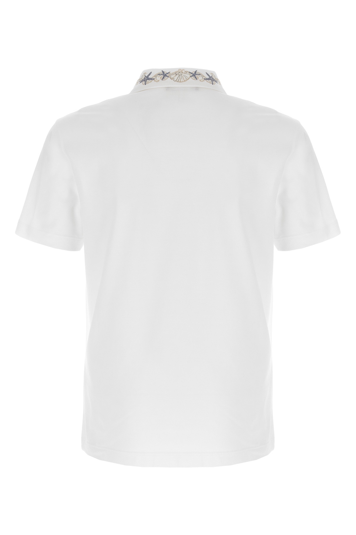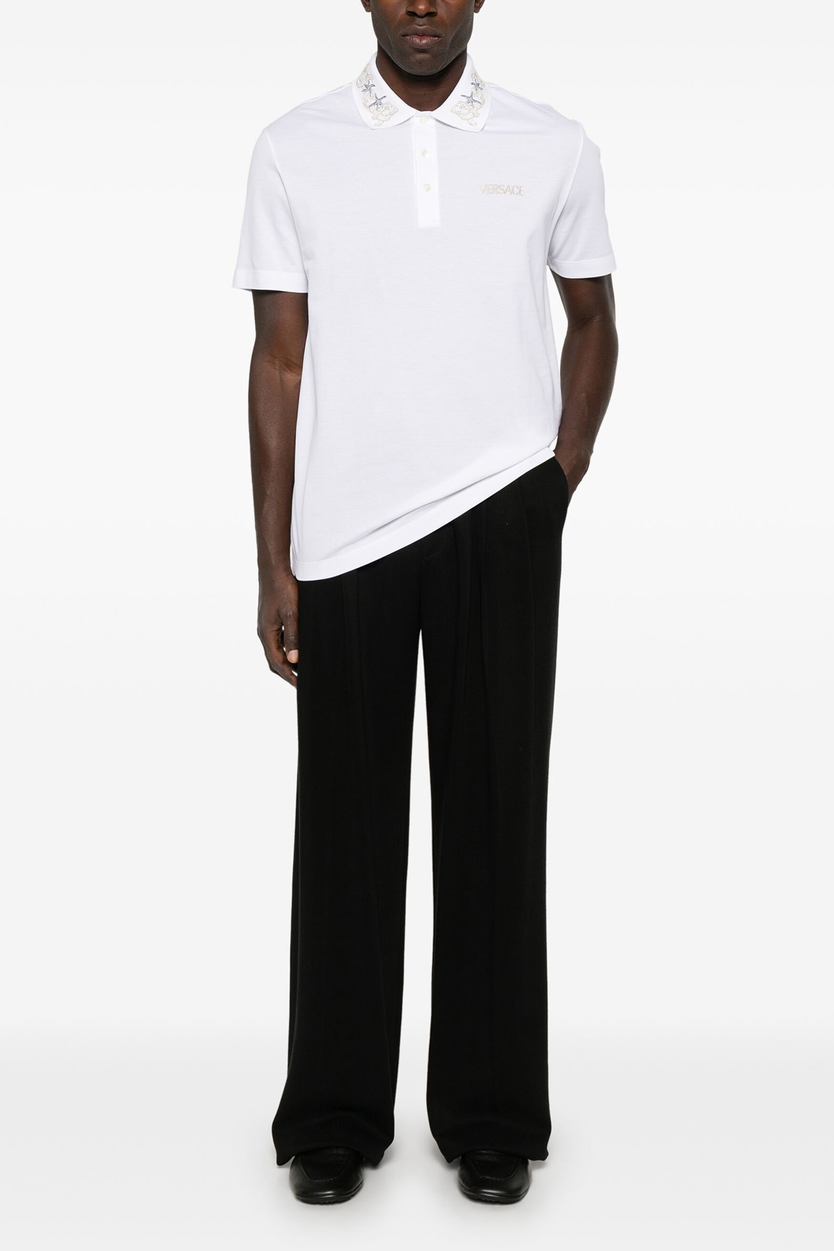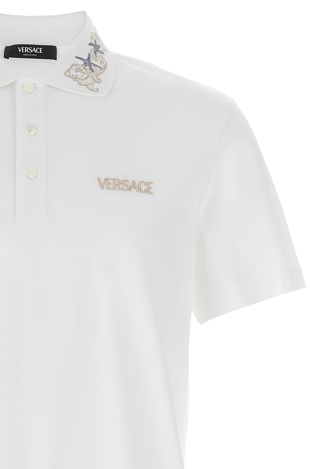 Cotton pique polo shirt with collar with Barocco Sea embroidery and buttons, front logo embroidery, and short sleeves.