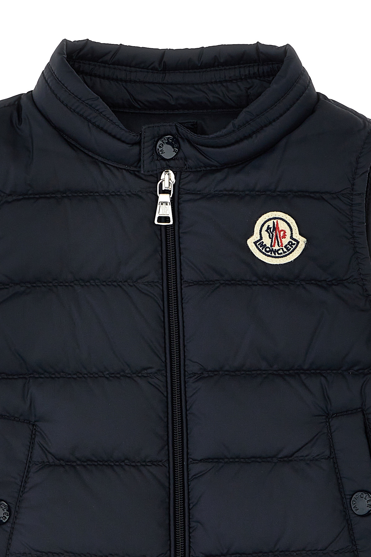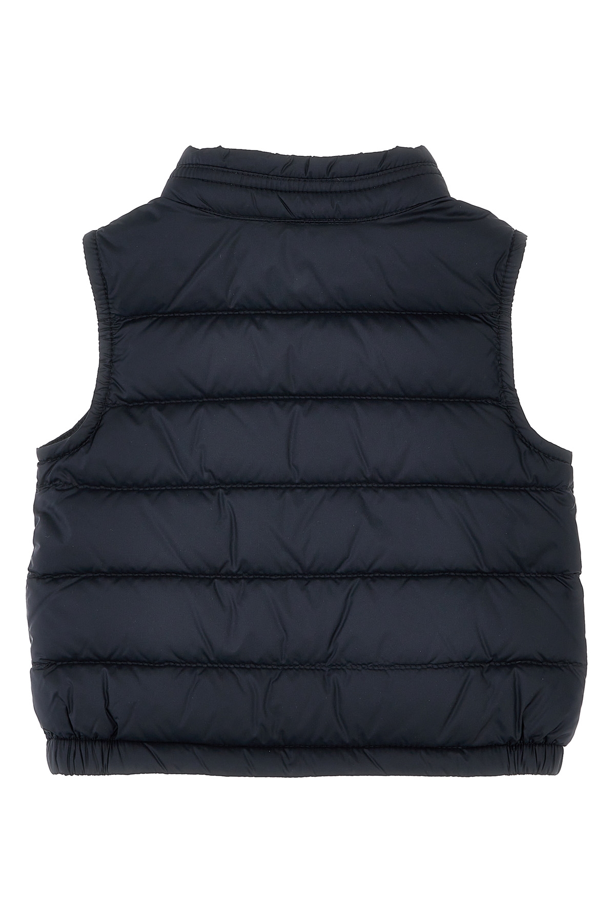 KIDS 'New Amaury' longue vest saison slightly padded with feather, front logo patch, high neck, zip closure, pockets, elastic at the hem, foldable. Midnight blue color. SUSTAINABLE: product made from recycled materials.