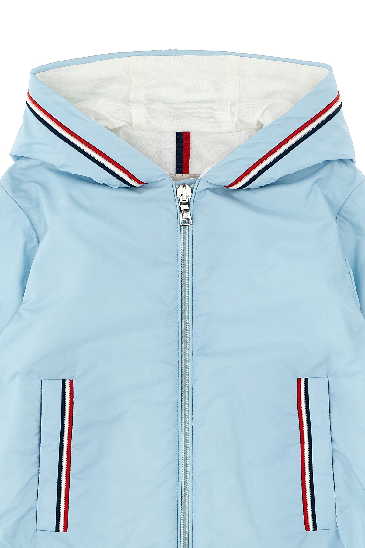 KIDS 'Granduc' jacket in recycled technical nylon, cotton jersey lining, hood, tricolor ribbon details, pockets, zip closure, long sleeves with elastic cuffs and logo patch, elastic on the hem. SUSTAINABLE: product made with recycled materials.