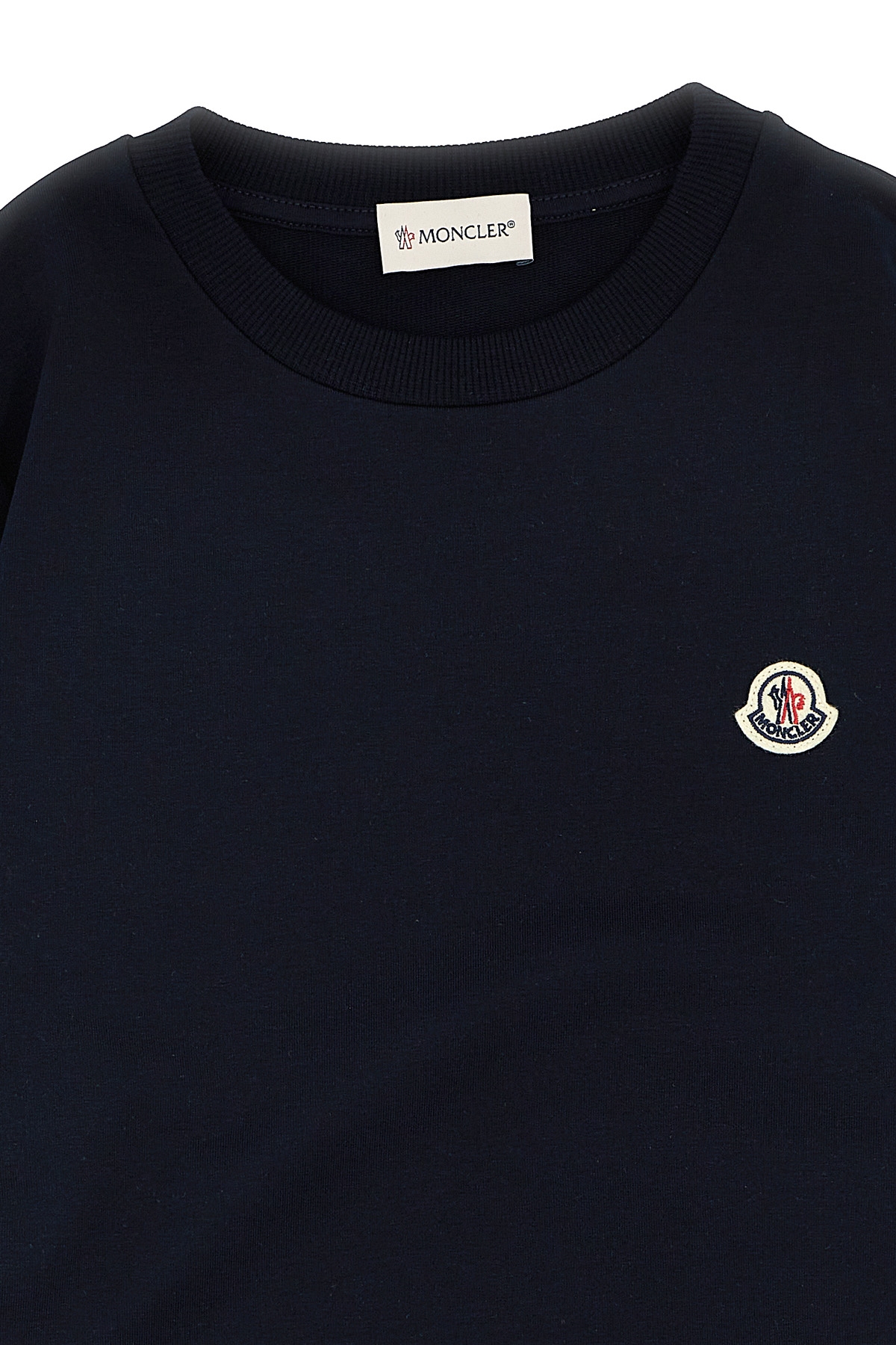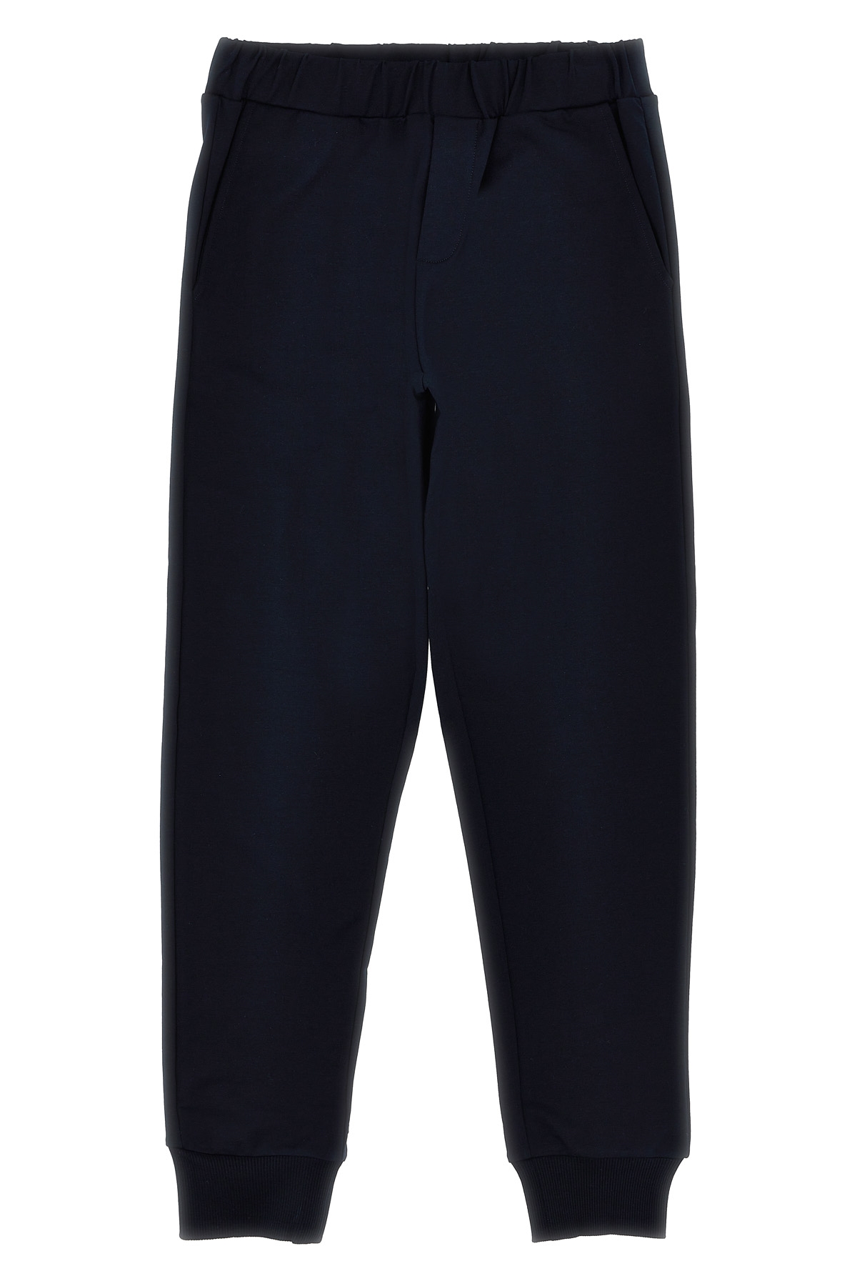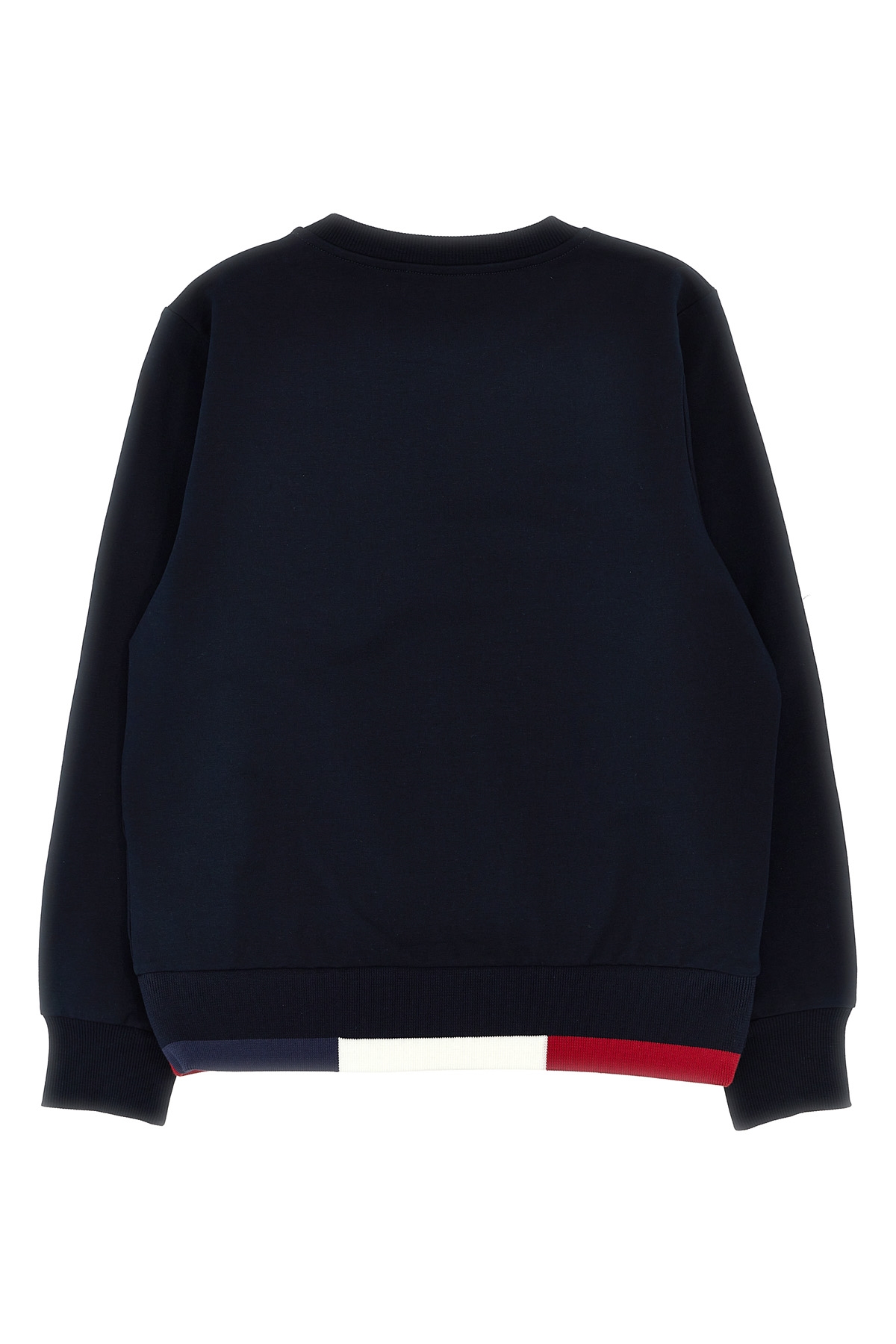 KIDS Cotton suit consisting of sweatshirt with front logo patch, crew neck, long cuffed sleeves, tricolor elastic on the hem and joggers with elastic waistband, pockets, ankle cuffs. Midnight blue color.