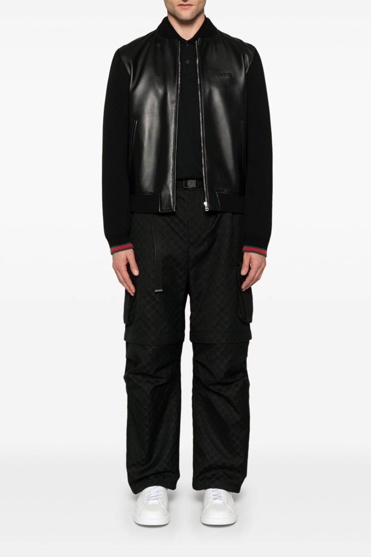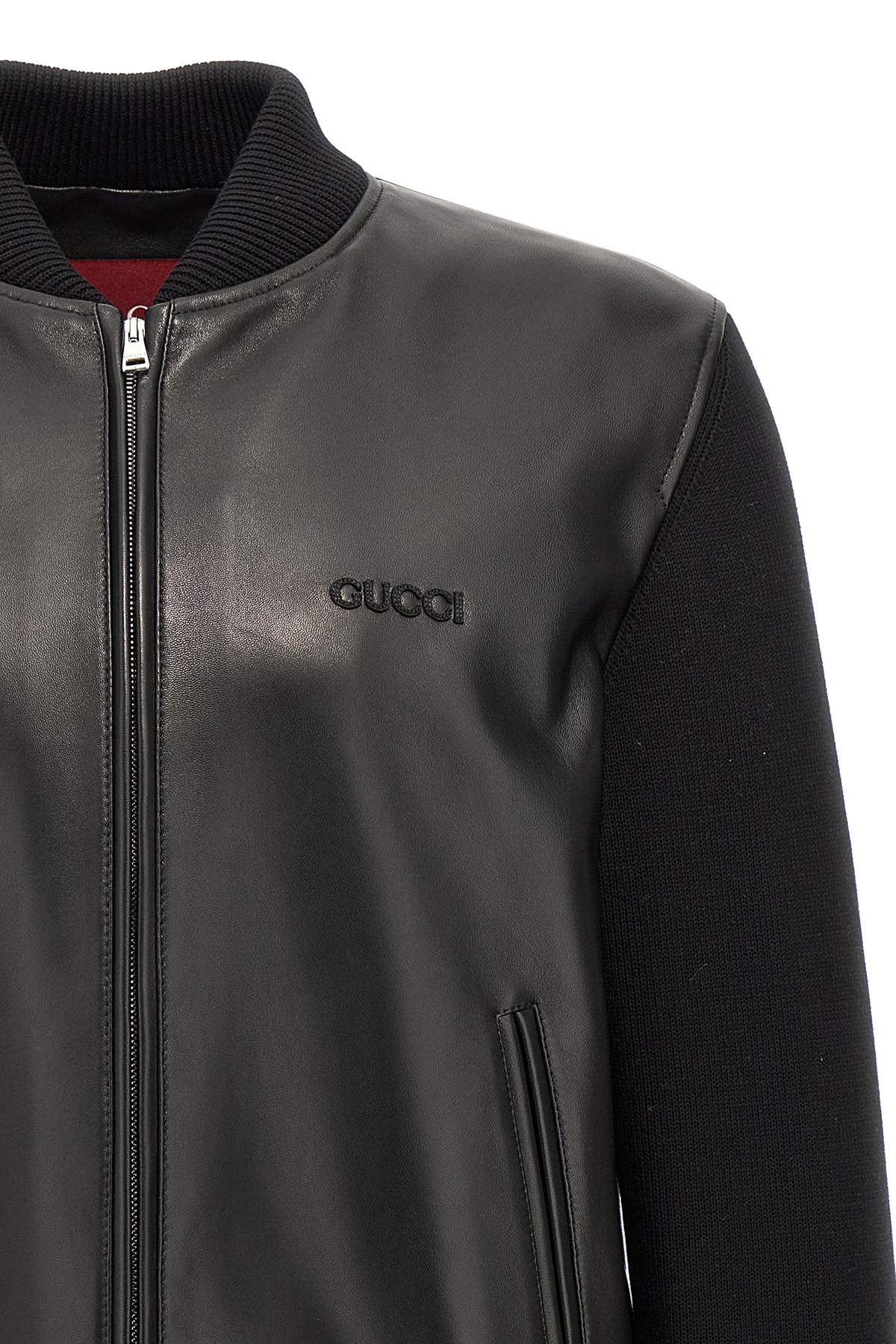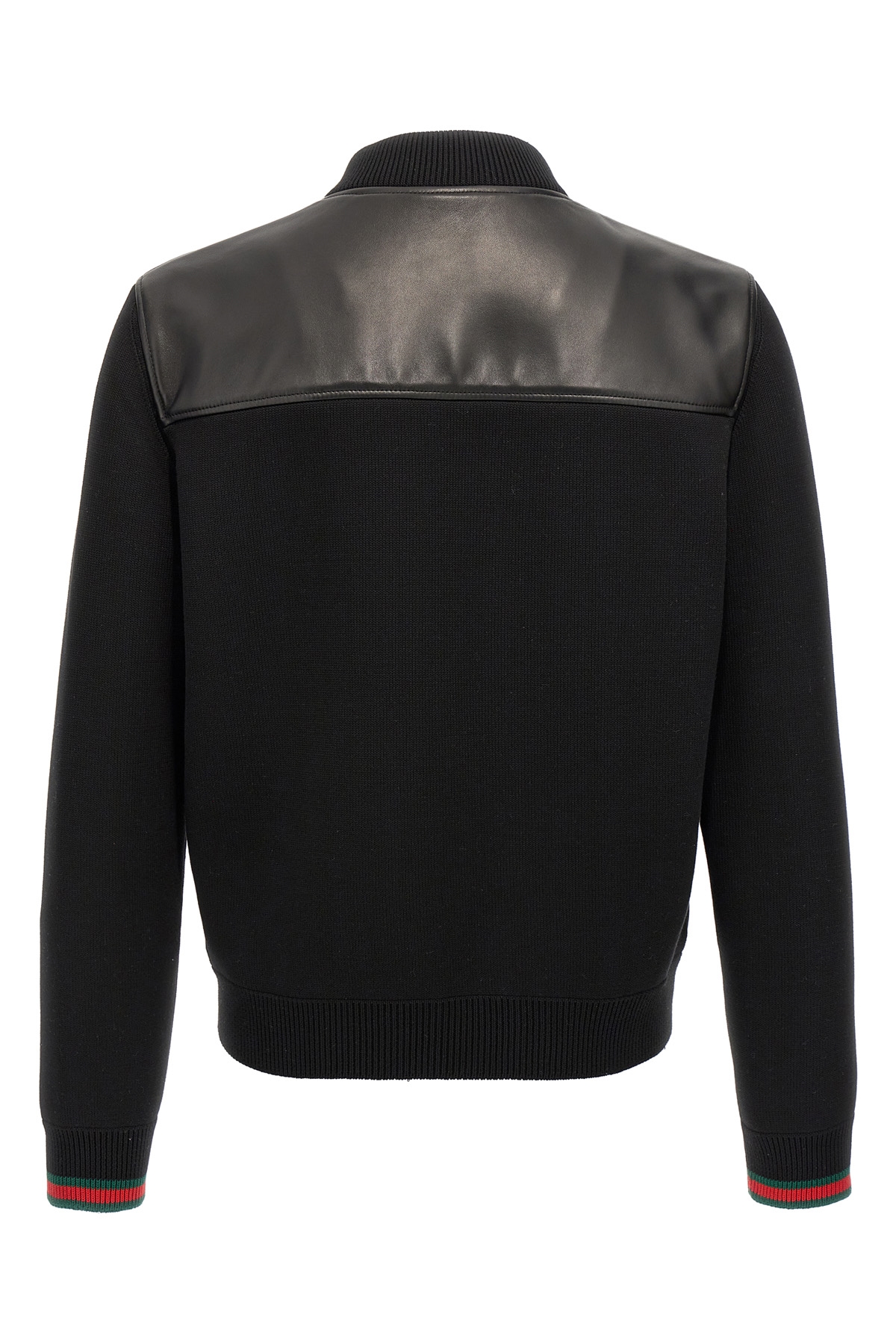 Two-material nappa and knitted bomber jacket, front logo embroidery, zip closure, pockets, long sleeves with Web ribbon cuffs.