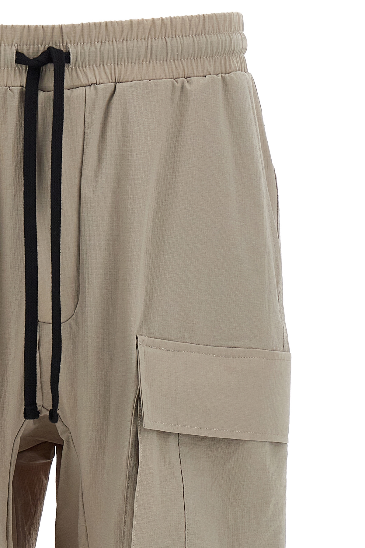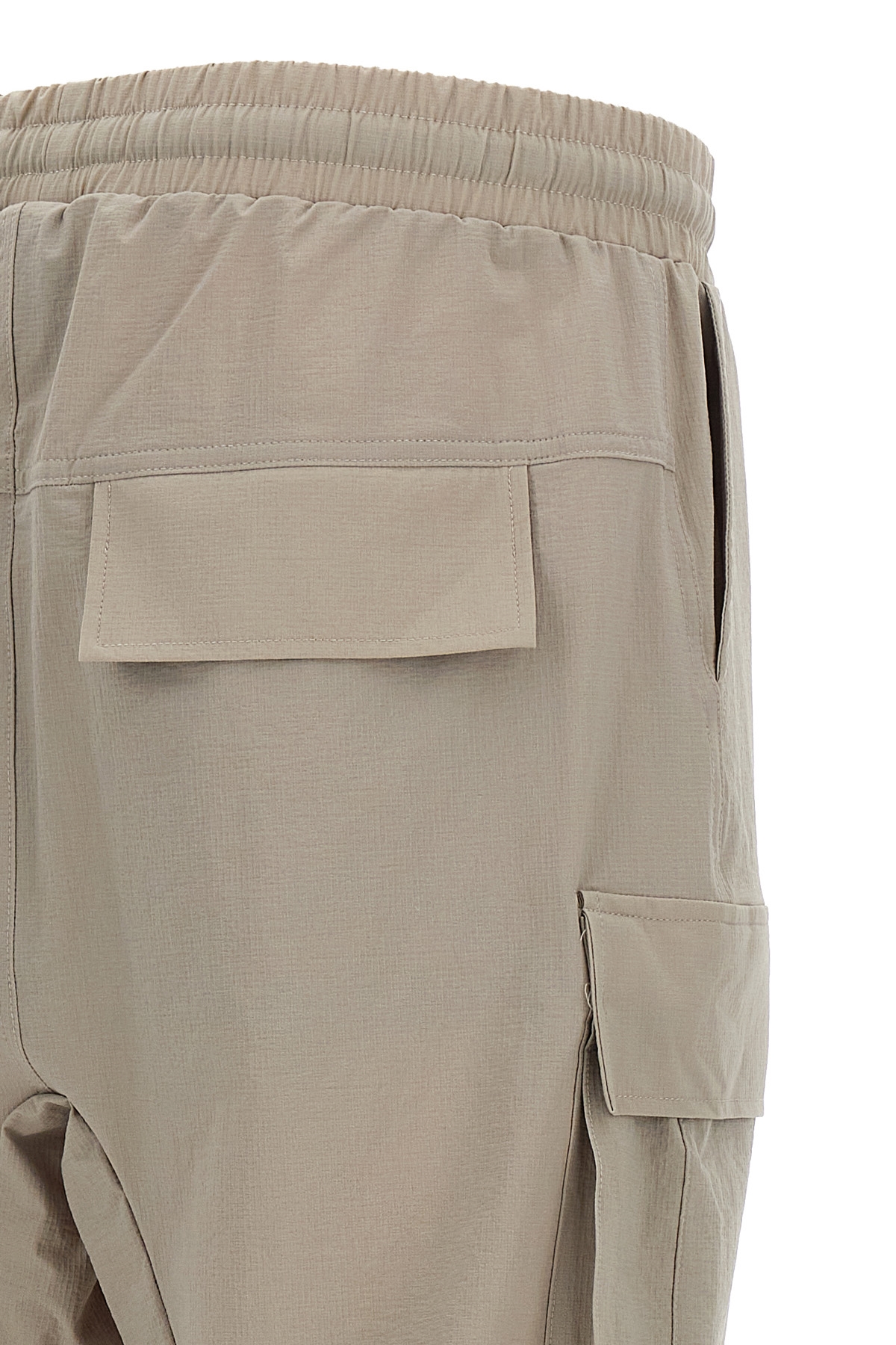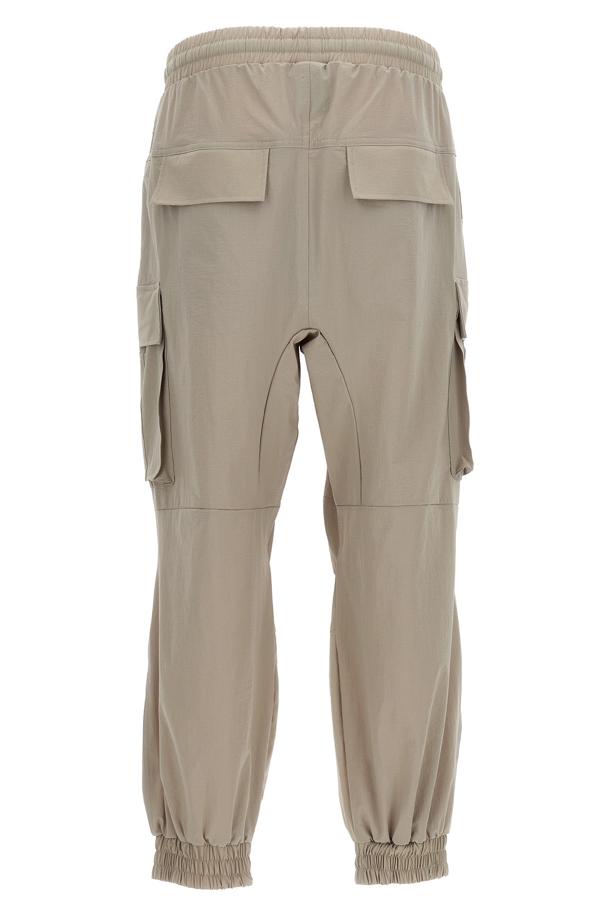 Stretch nylon cargo pants, elastic and drawstring at the waist, flap with buttons, pockets, elastic ankle.