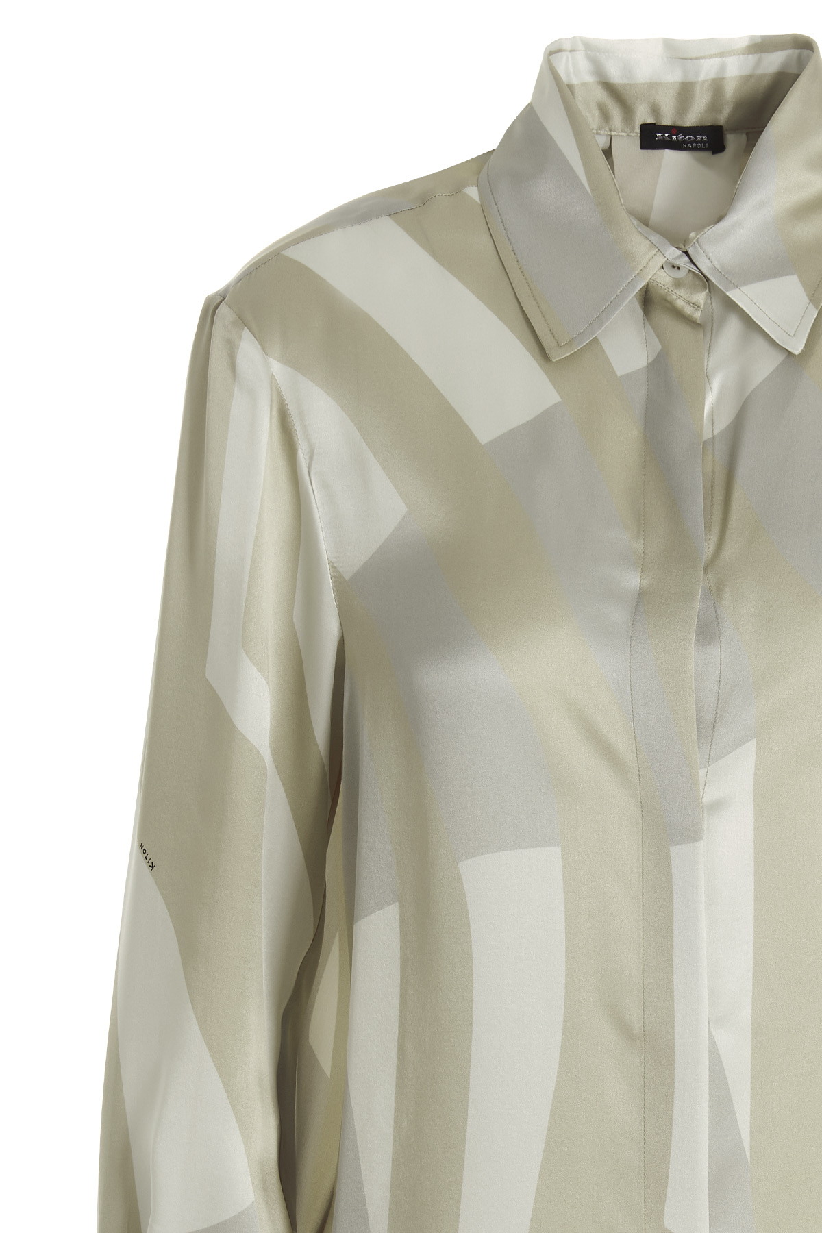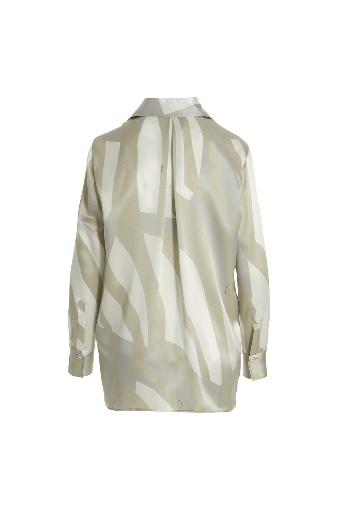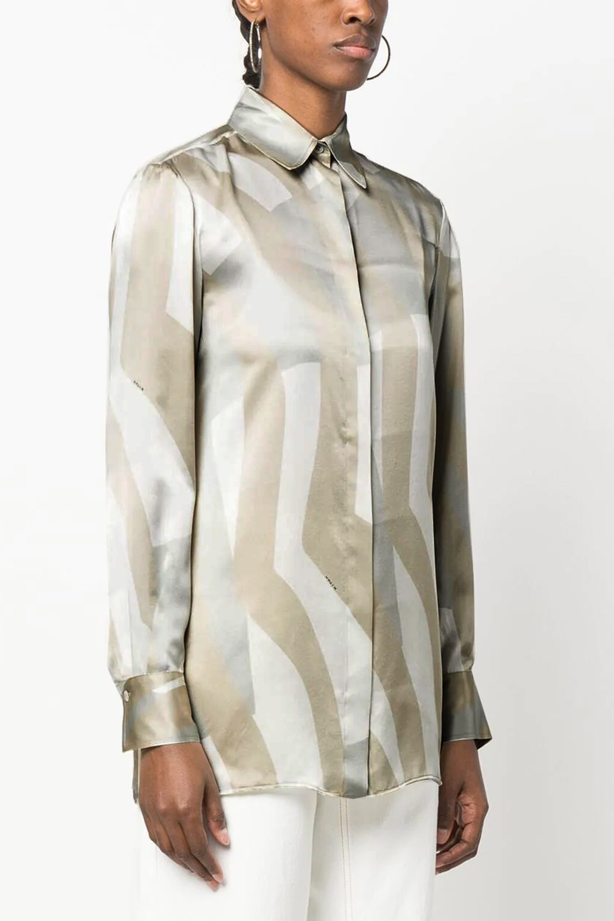 all-over print silk shirt with button closure, and long cuffed sleeves.