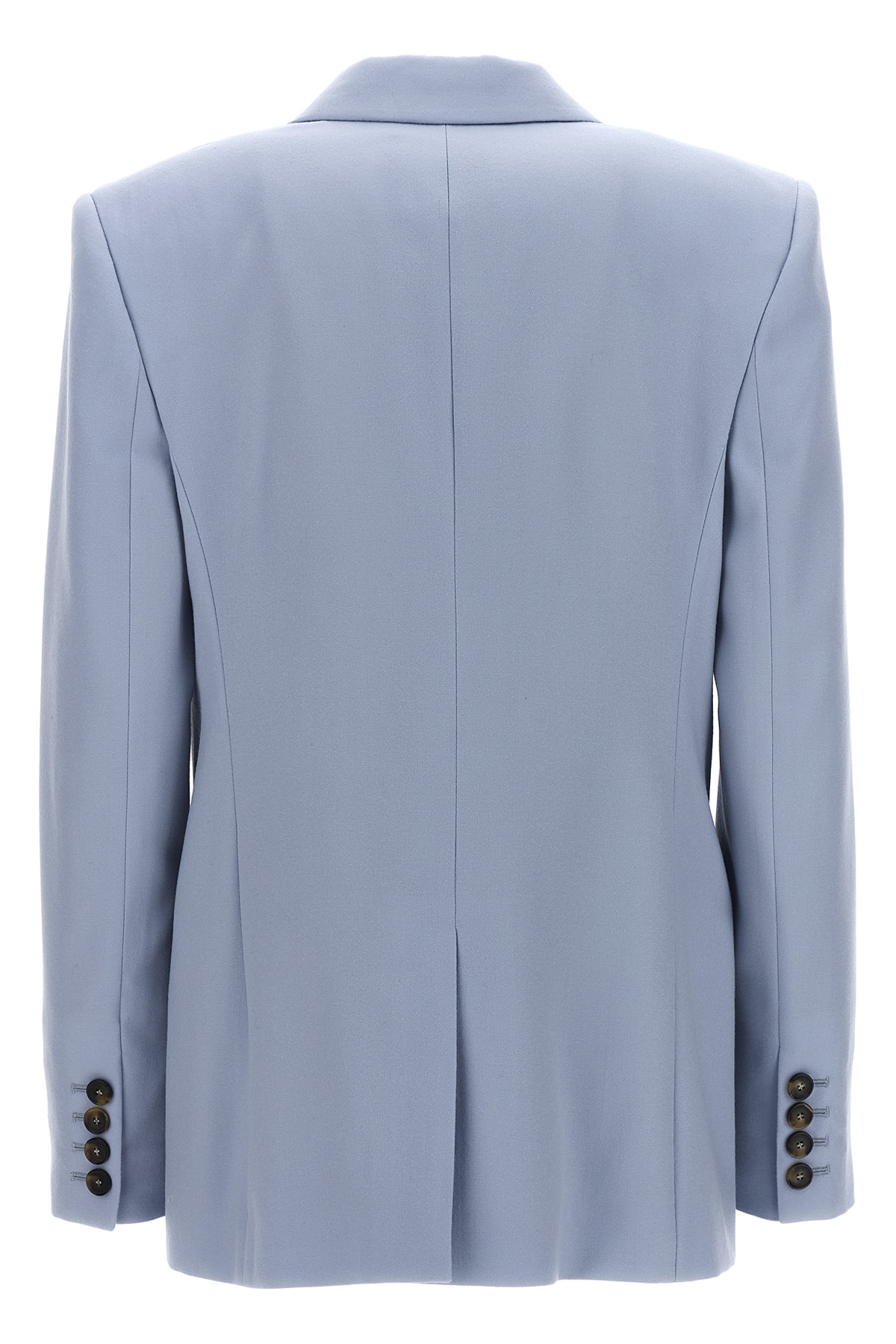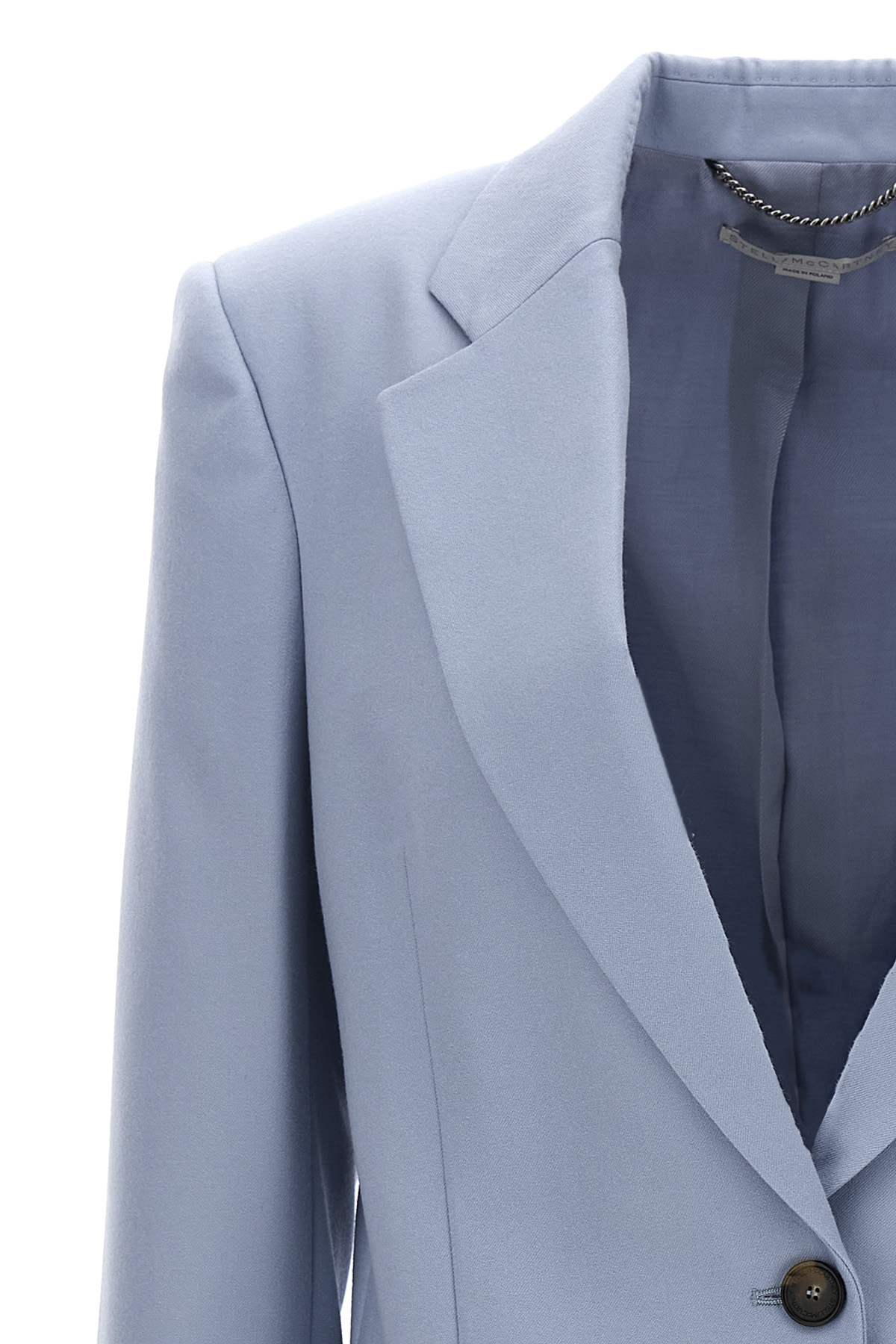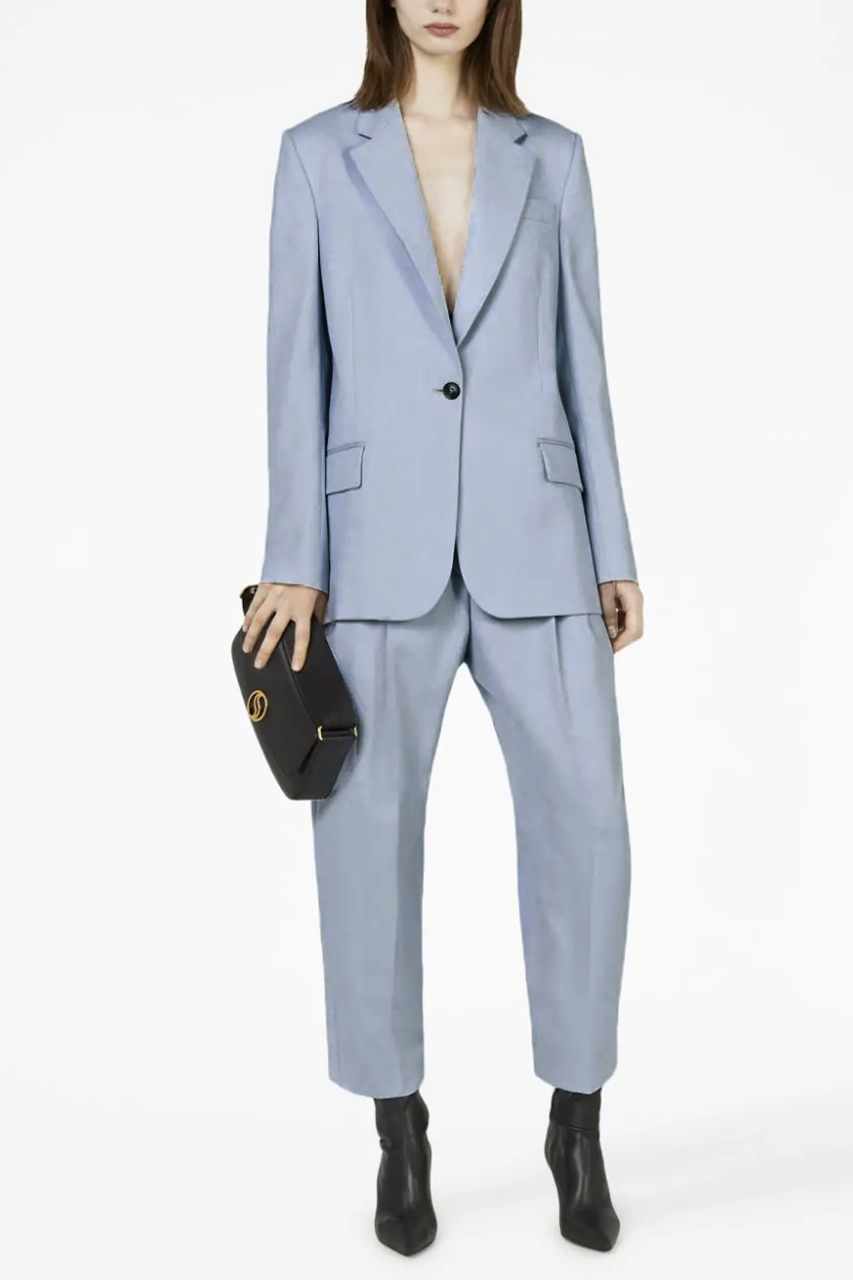 Boyfriend' single breast wool blazer jacket with button closure, pockets, long sleeves and a back split.