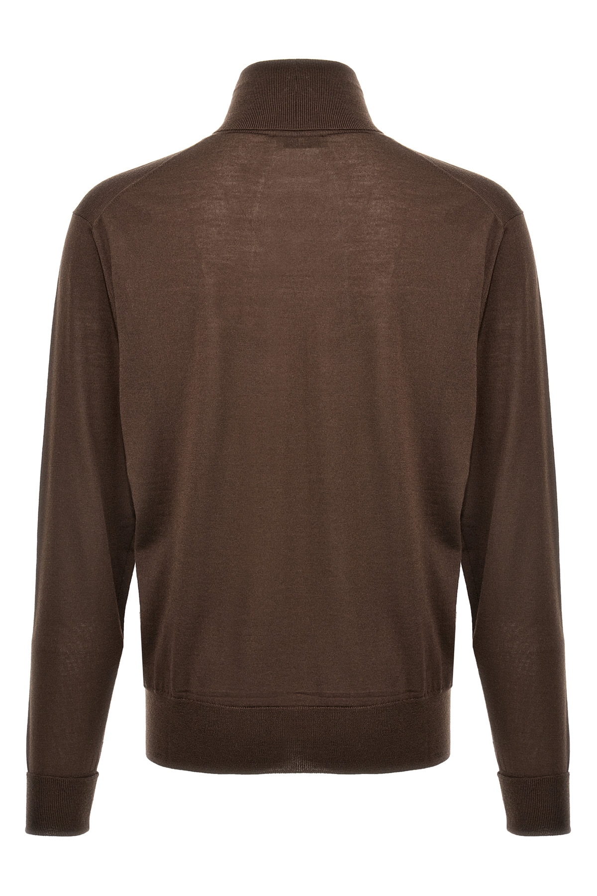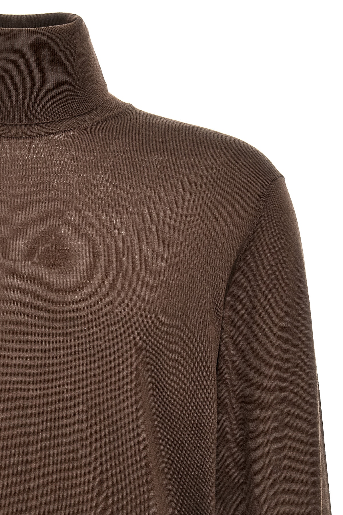 Merino wool turtleneck sweater with high neck, long sleeves with turned-up cuffs.