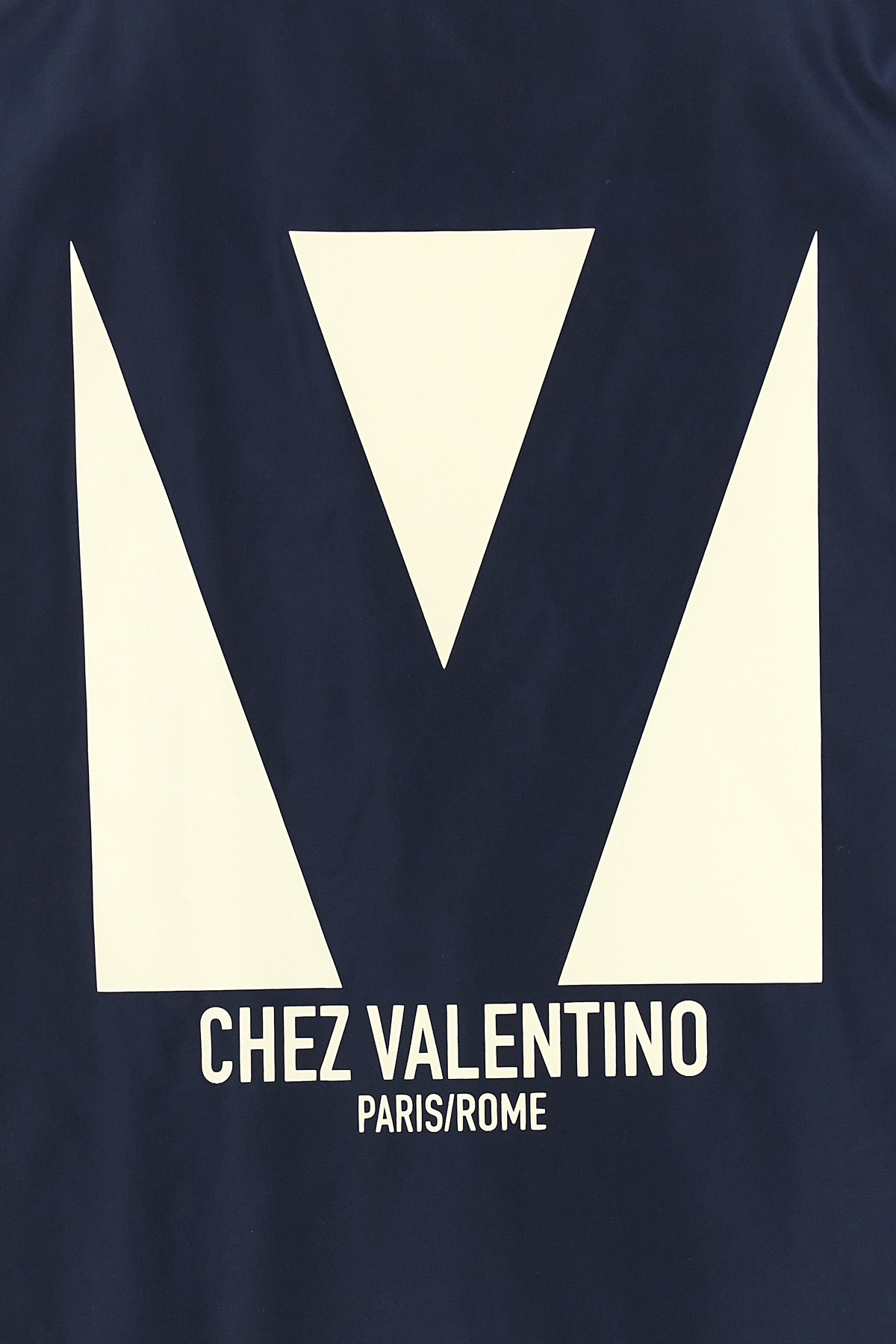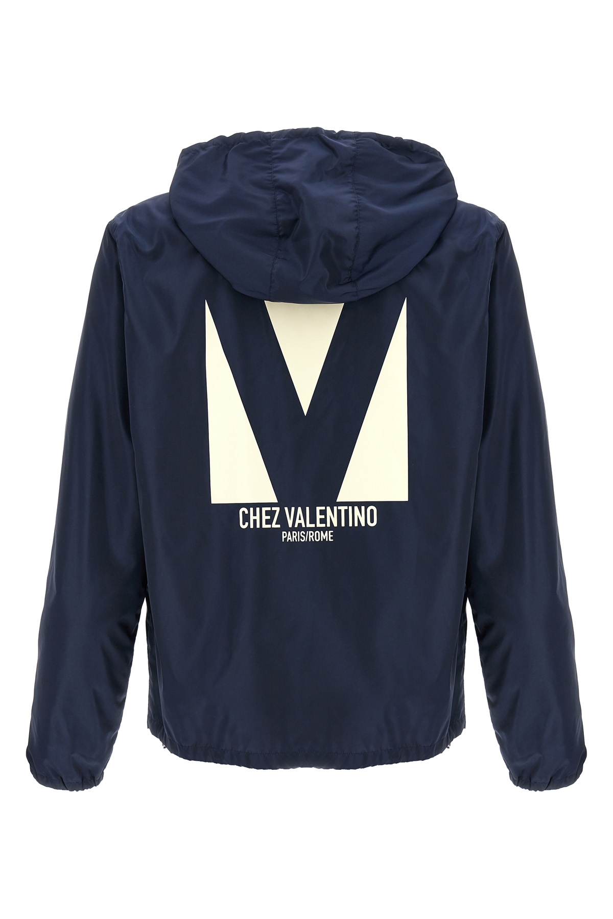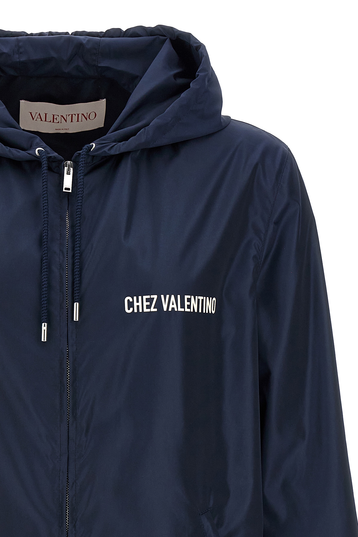 Nylon anorak with 'Chez Valentino' print on the front and back, hood with adjustable drawstring, zip closure, pockets, long sleeves with elastic cuffs, drawstring at the hem.