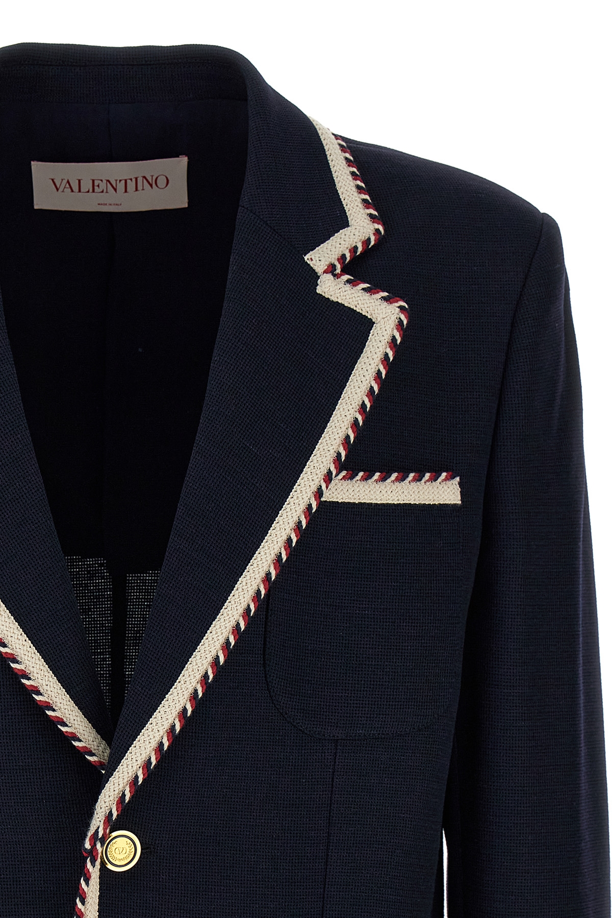 Single-breasted cotton jersey blazer with torchon piping, mirror lapels, button closure, pockets, long sleeves, back vent.