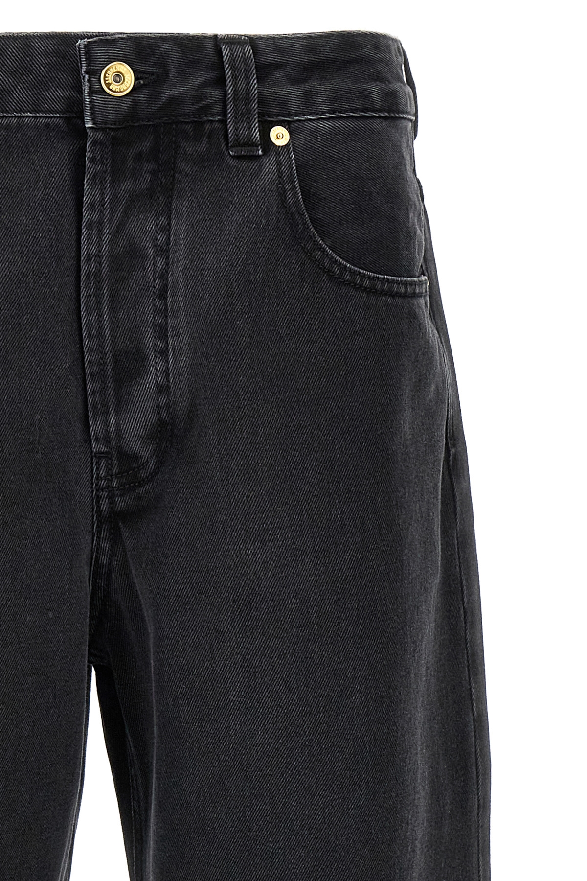 High-waisted cotton denim Le De-Nimes Large jeans with wide, straight leg, button closure, five pockets, and maxi leather logo label on the back.