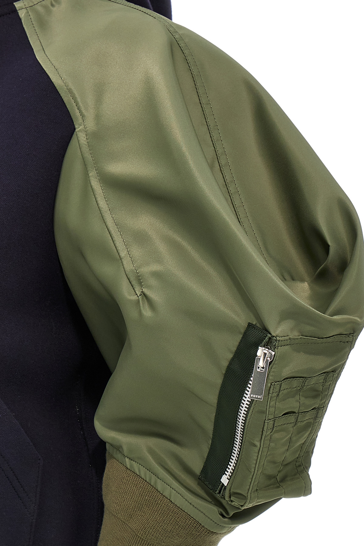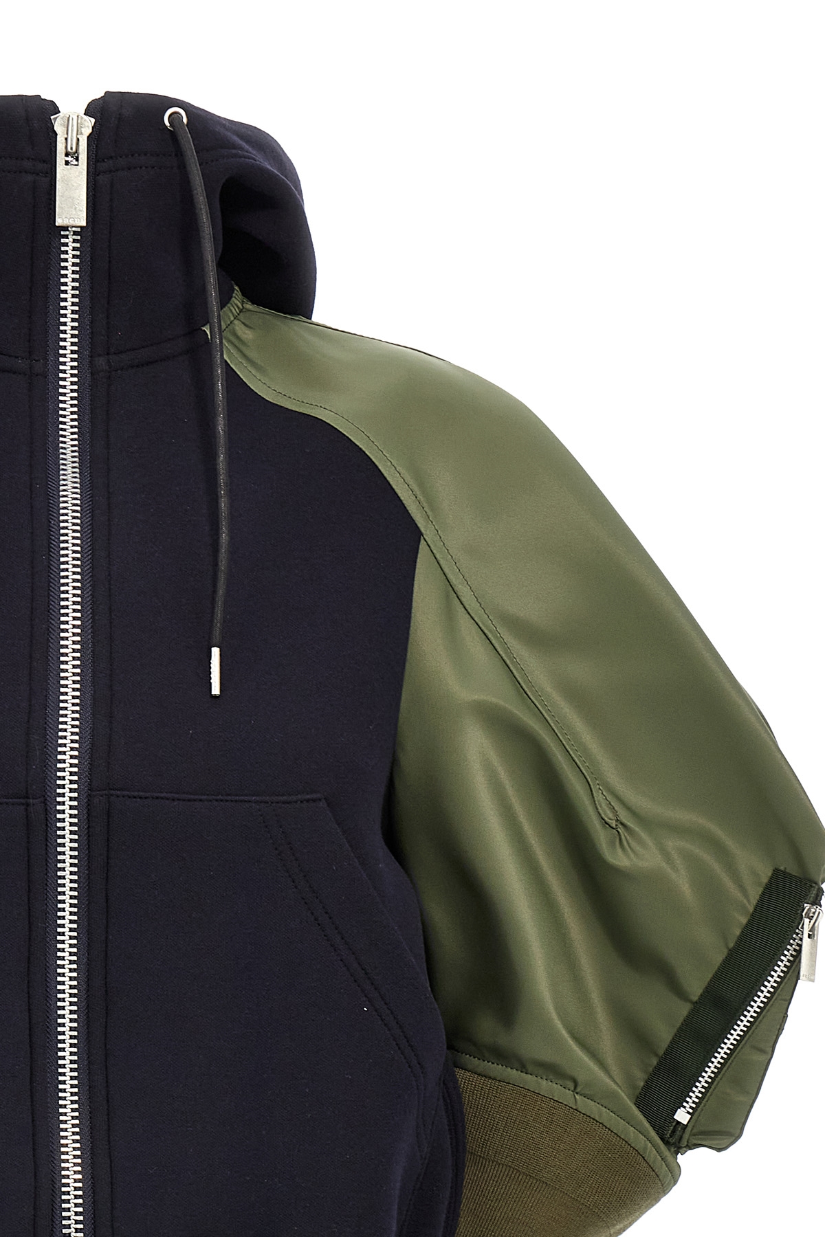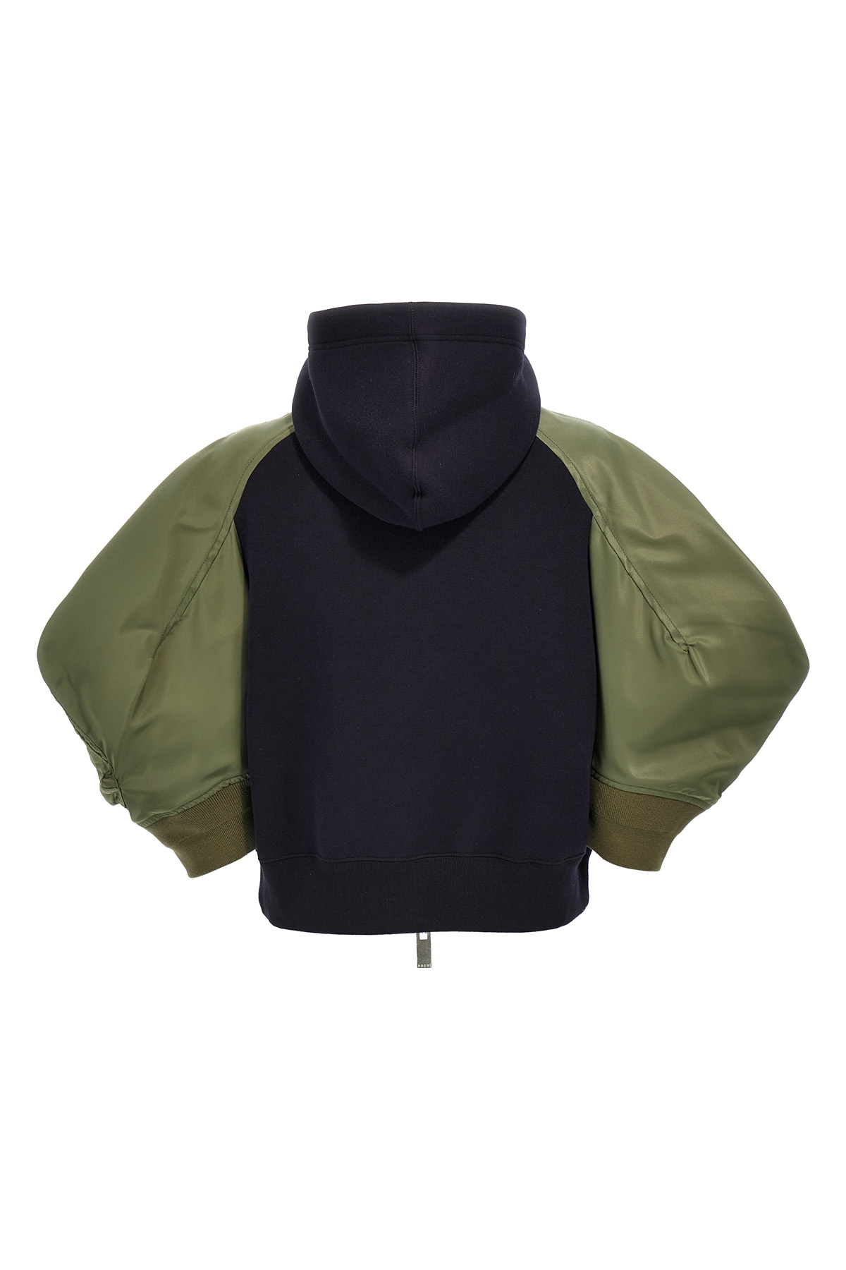 'Sponge' cotton blend hoodie with contrasting 3/4 puff sleeves in nylon with elastic cuffs, zip closure, pockets.