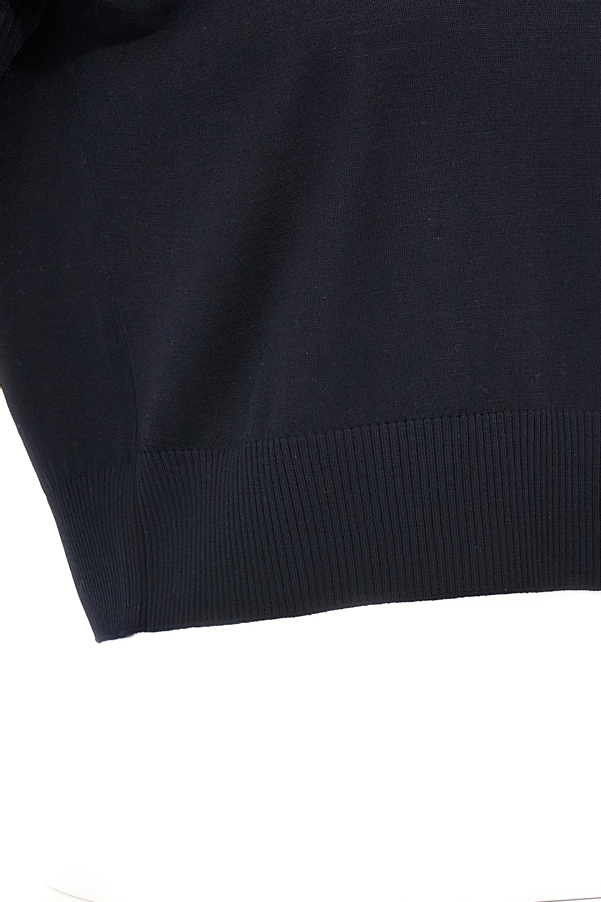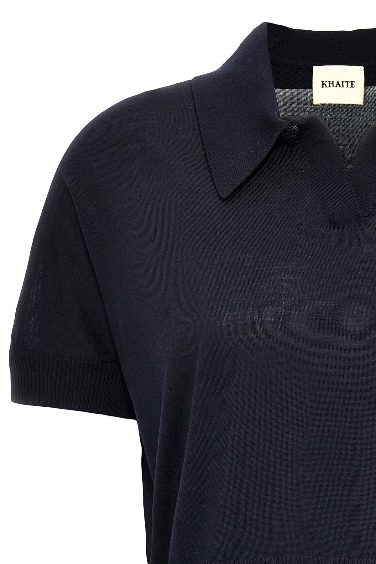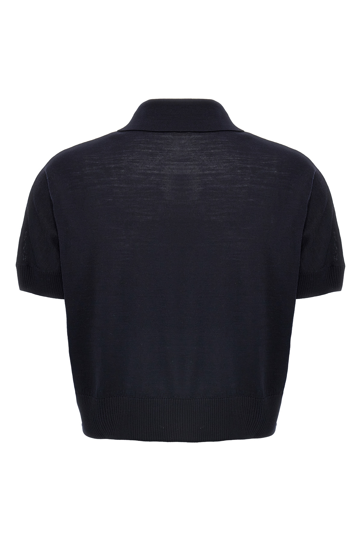 'Morgane' crop top in wool, collar, short sleeves. Midnight blue color.