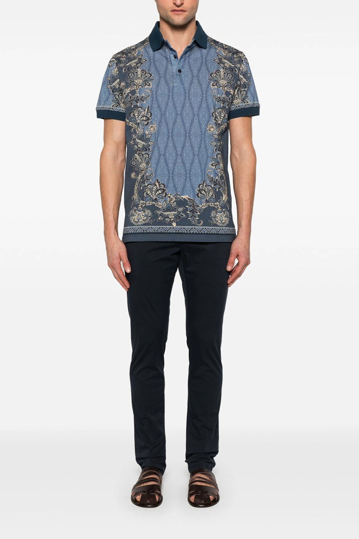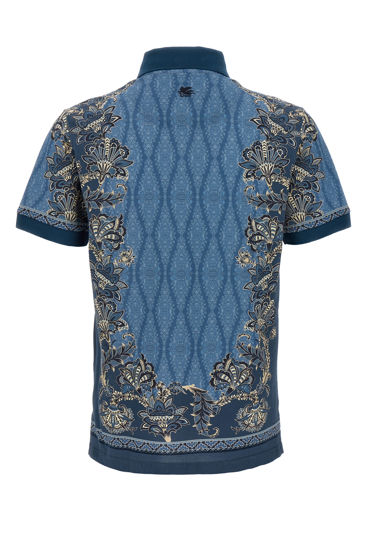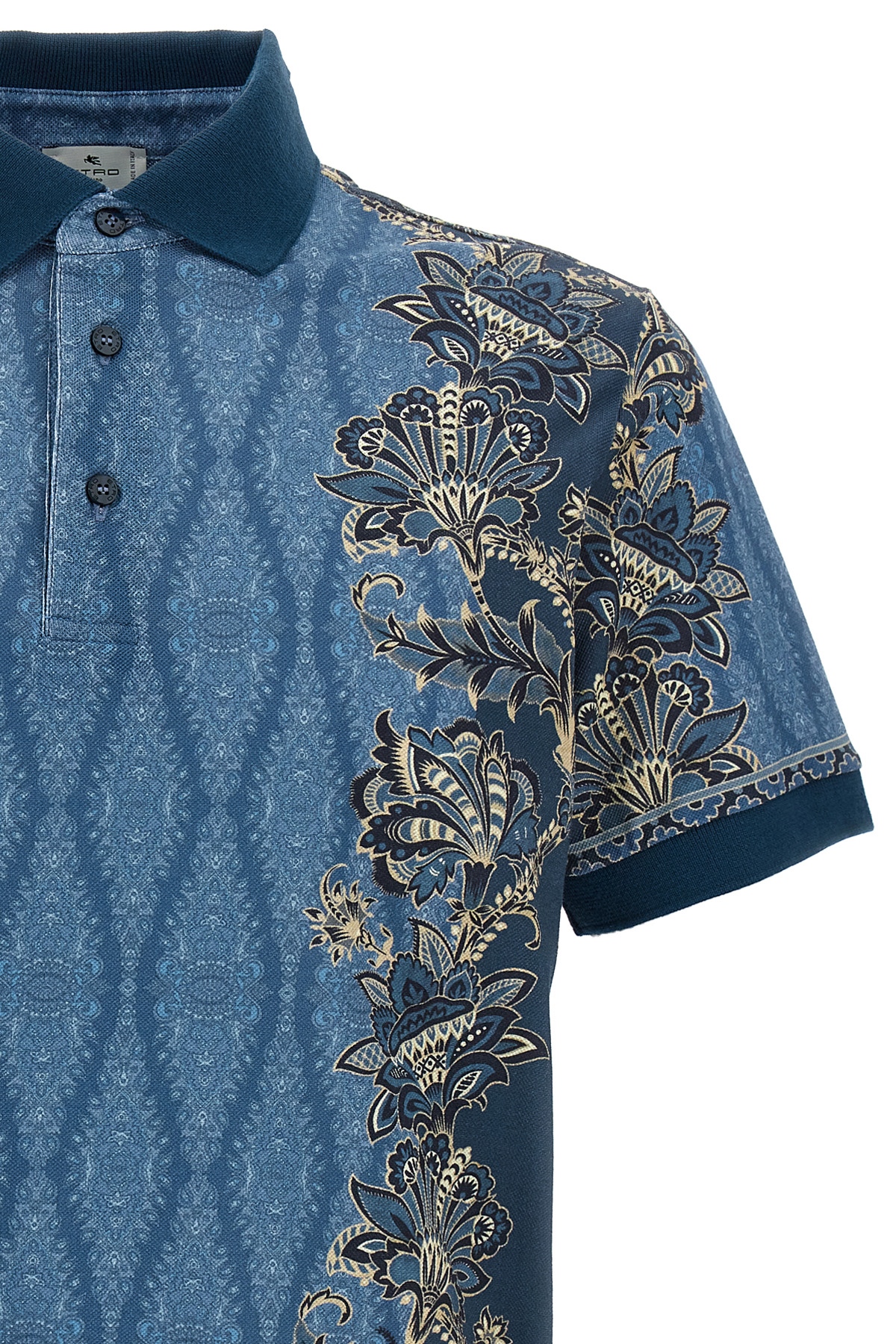 Pique cotton polo shirt with all-over maxi flower print and solid color details, back logo embroidery, collar and buttons, short sleeves, side splits.