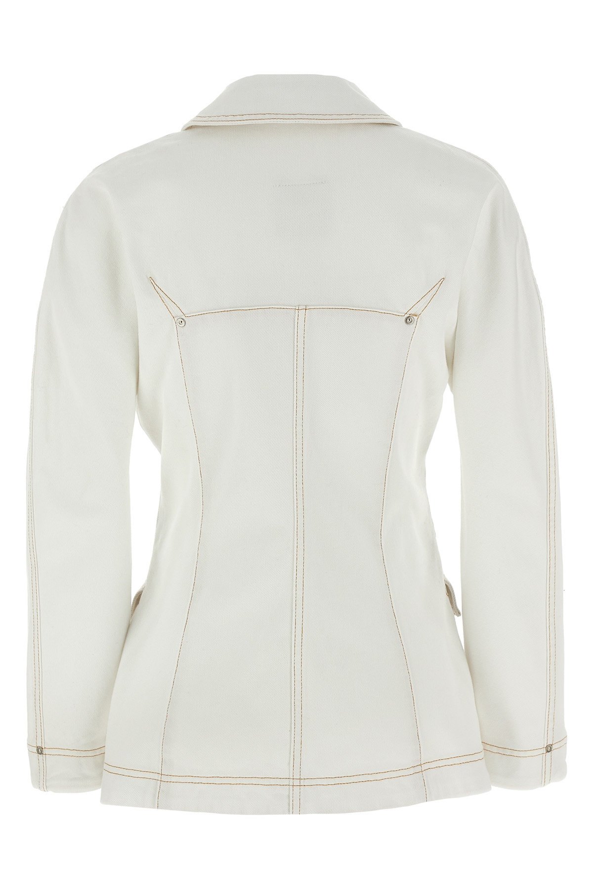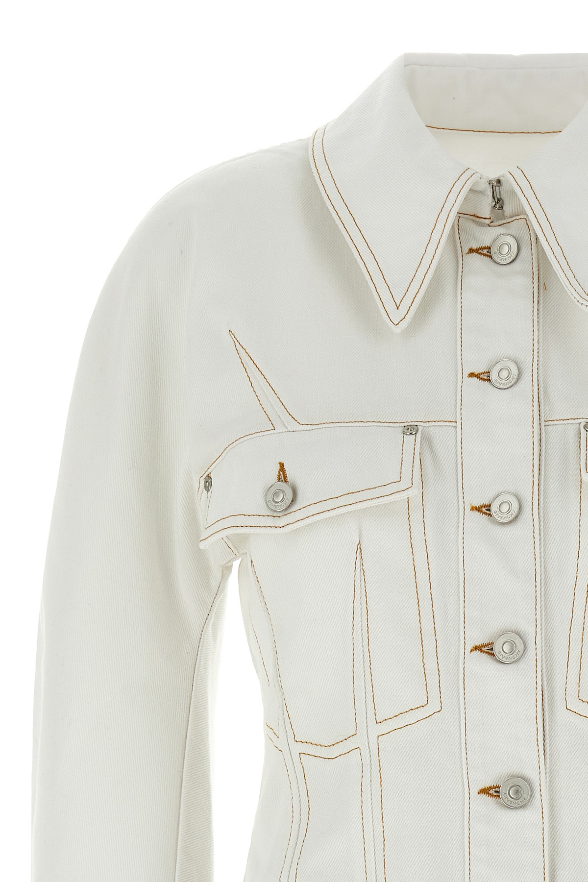 Cotton denim jacket with contrasting stitching, flared design, collar, button closure, pockets, long sleeves with cuffs, and metal details.