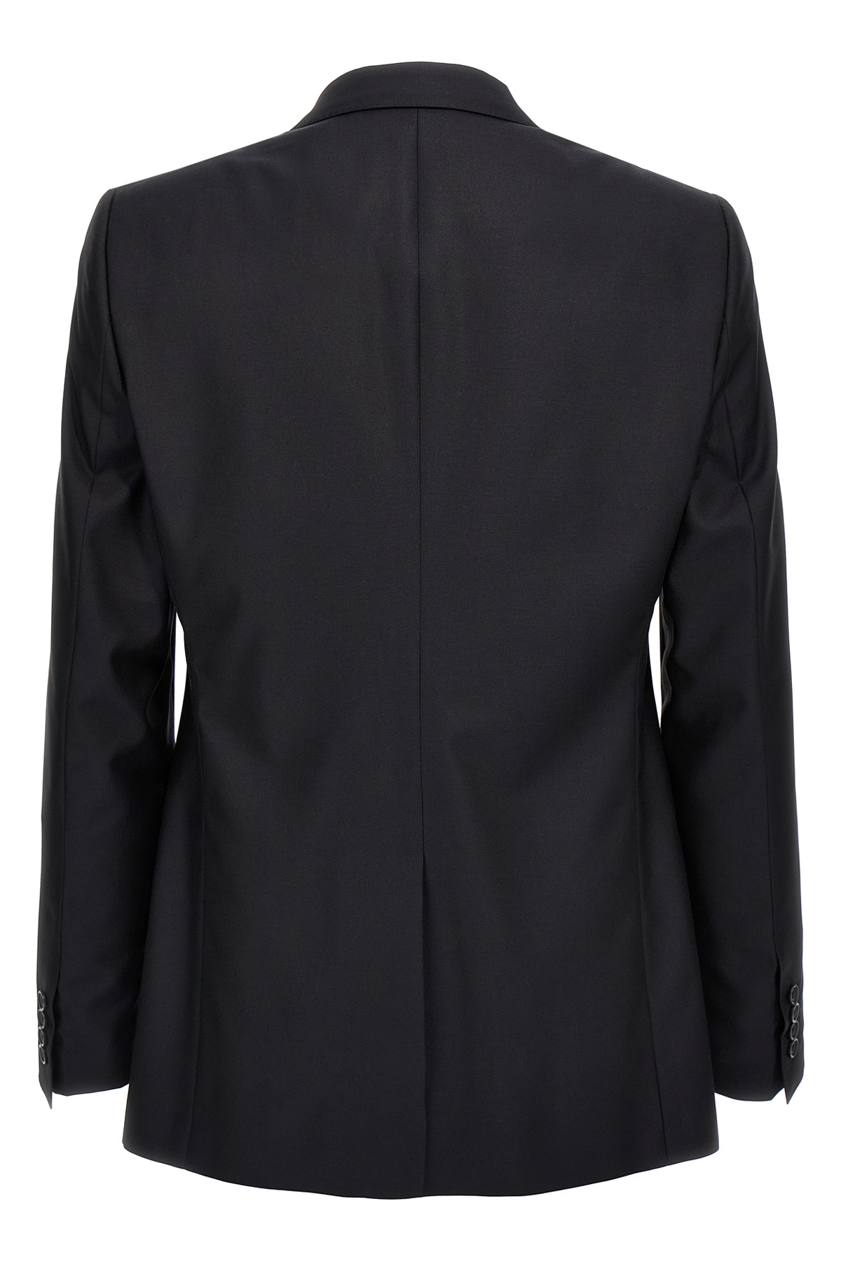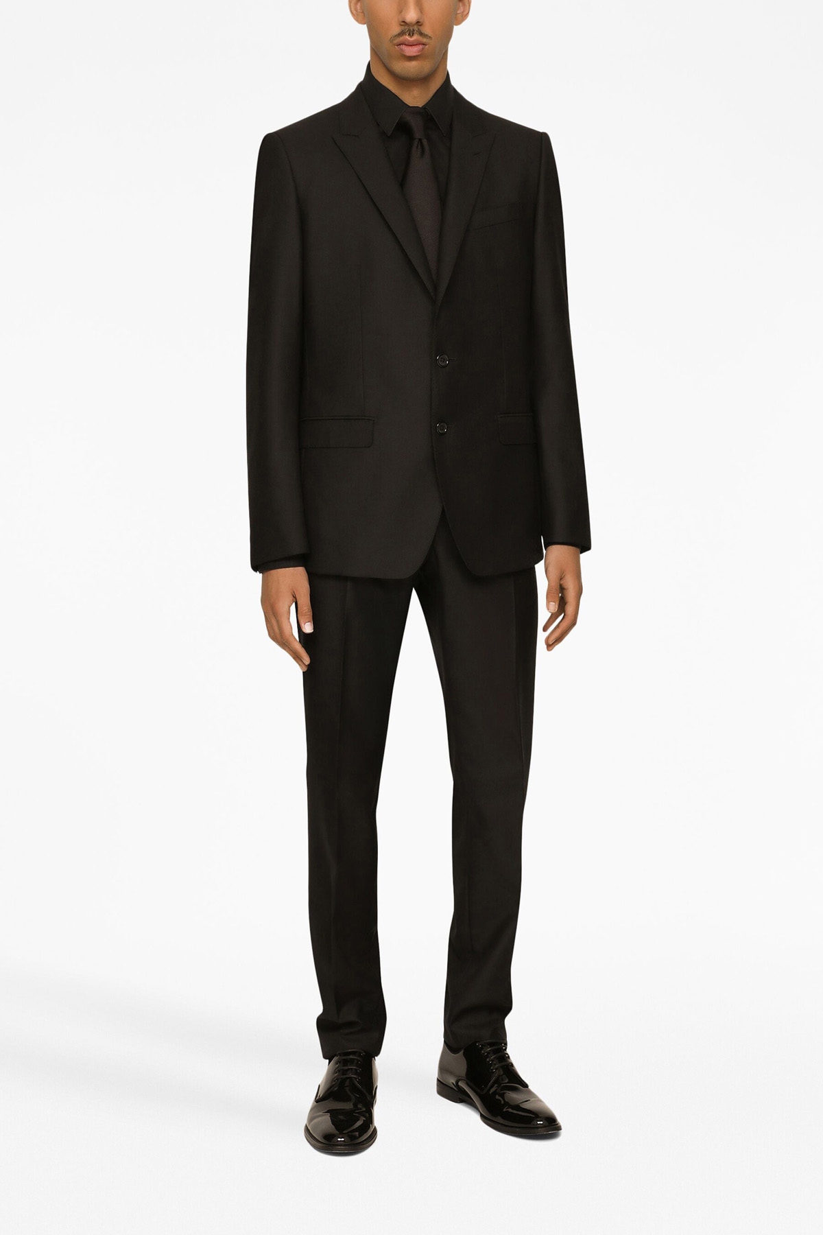 Single-breasted 'Martini' wool and silk canvas dress, jacket with peak lapels, pockets, back central split, long sleeves with padded shoulders, straight trousers, zip, button and hook closure, pockets.