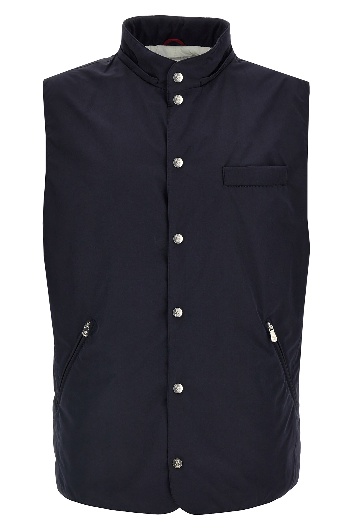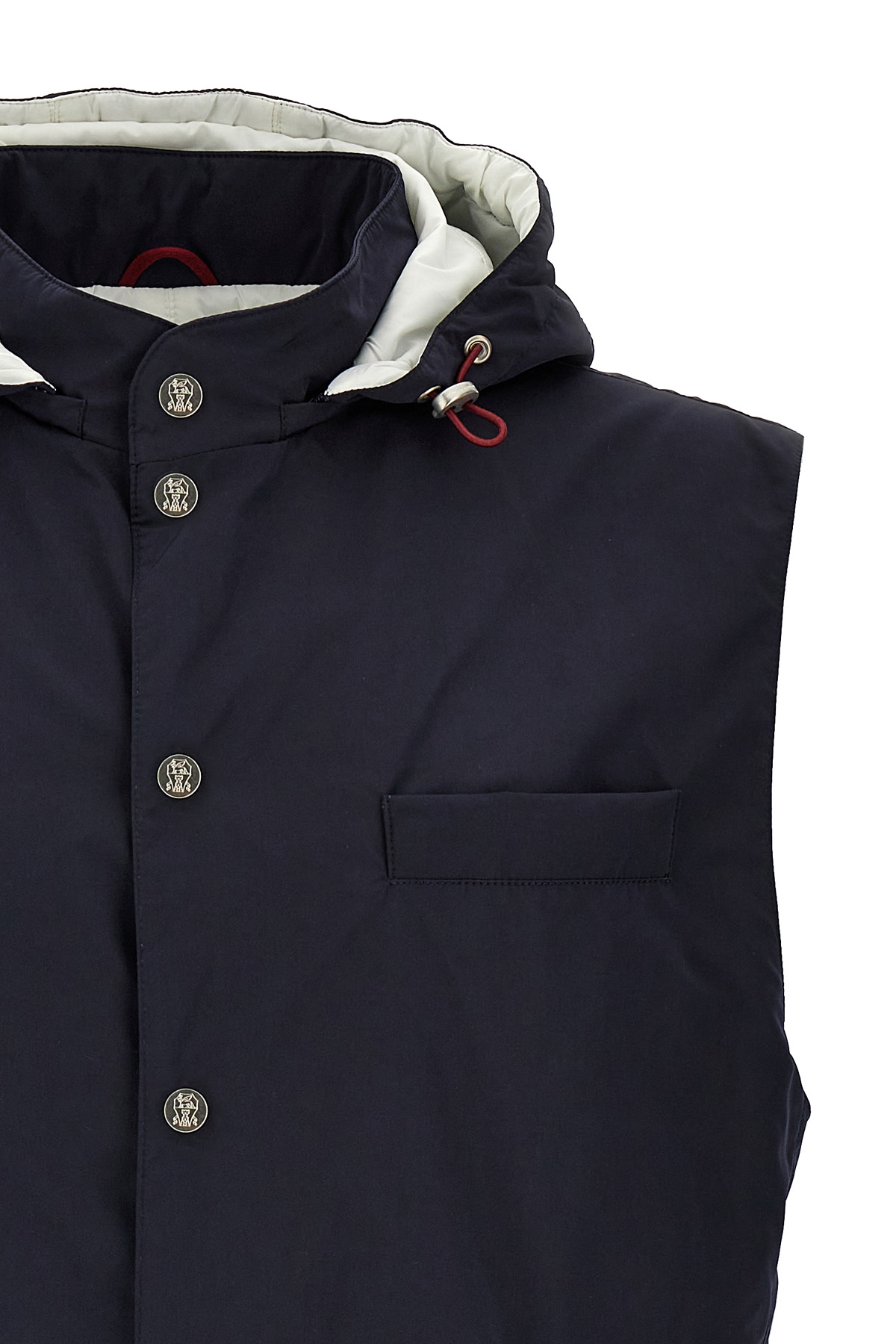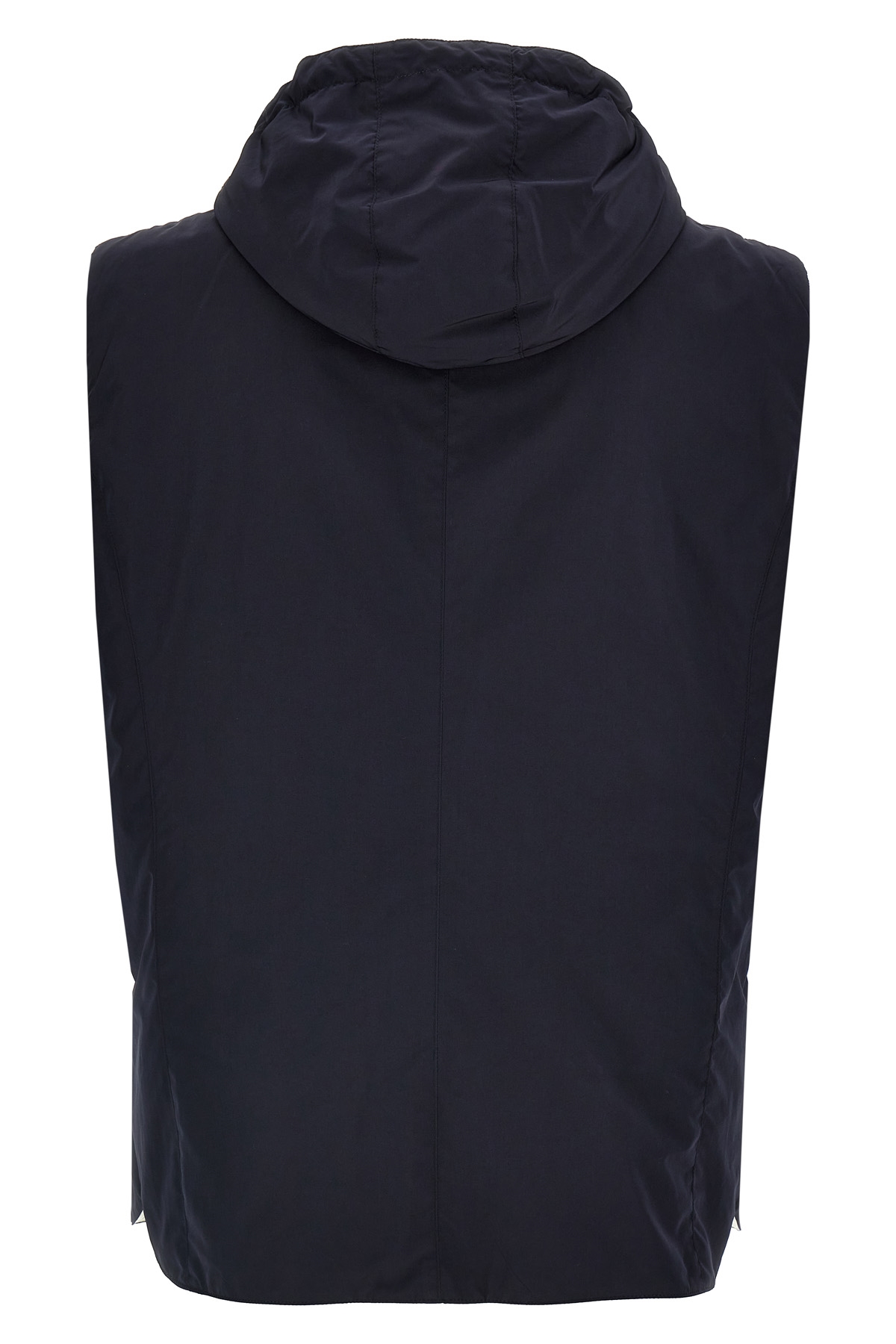 Water-repellent fabric vest, removable hood with adjustable drawstring, snap button closure, pockets.