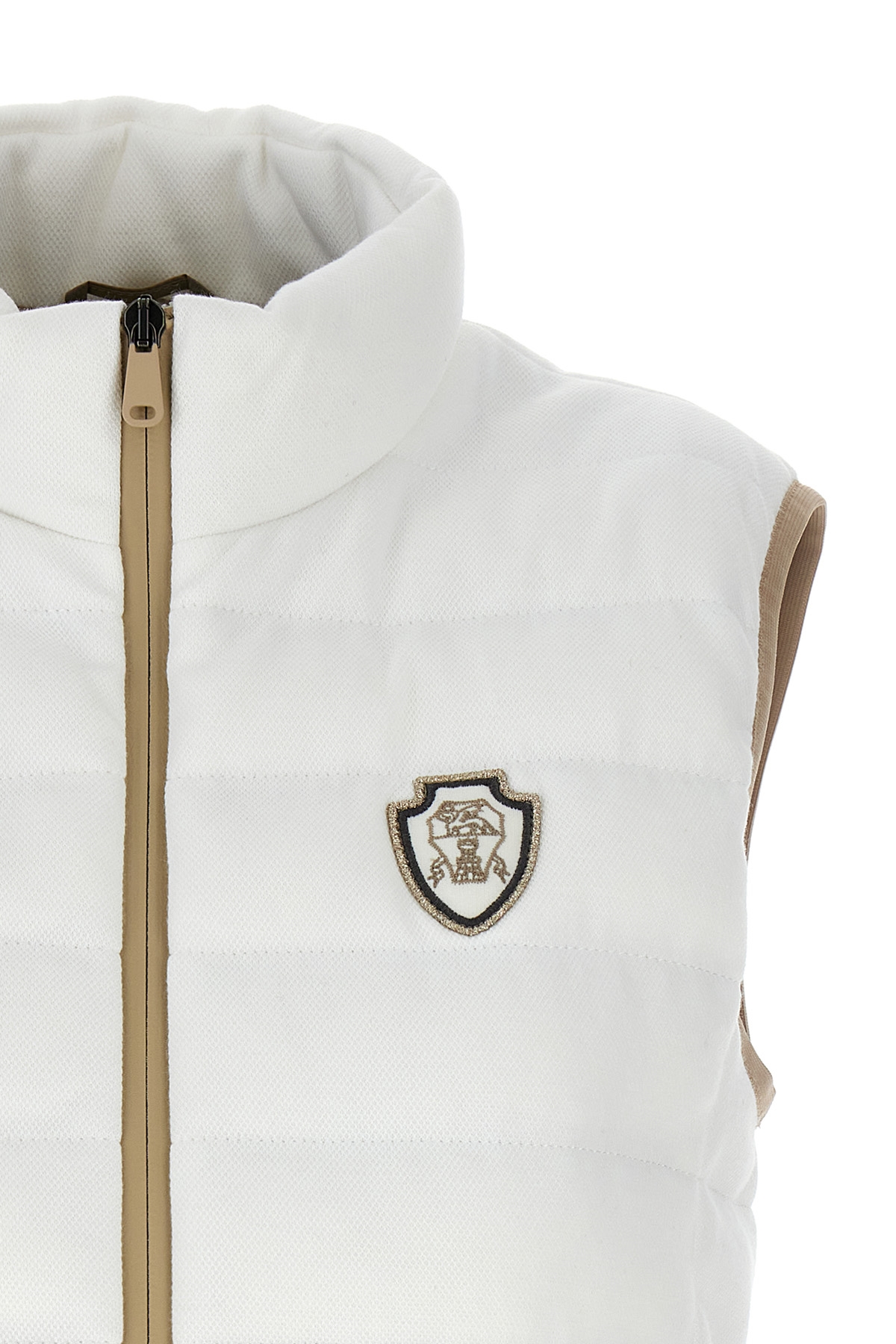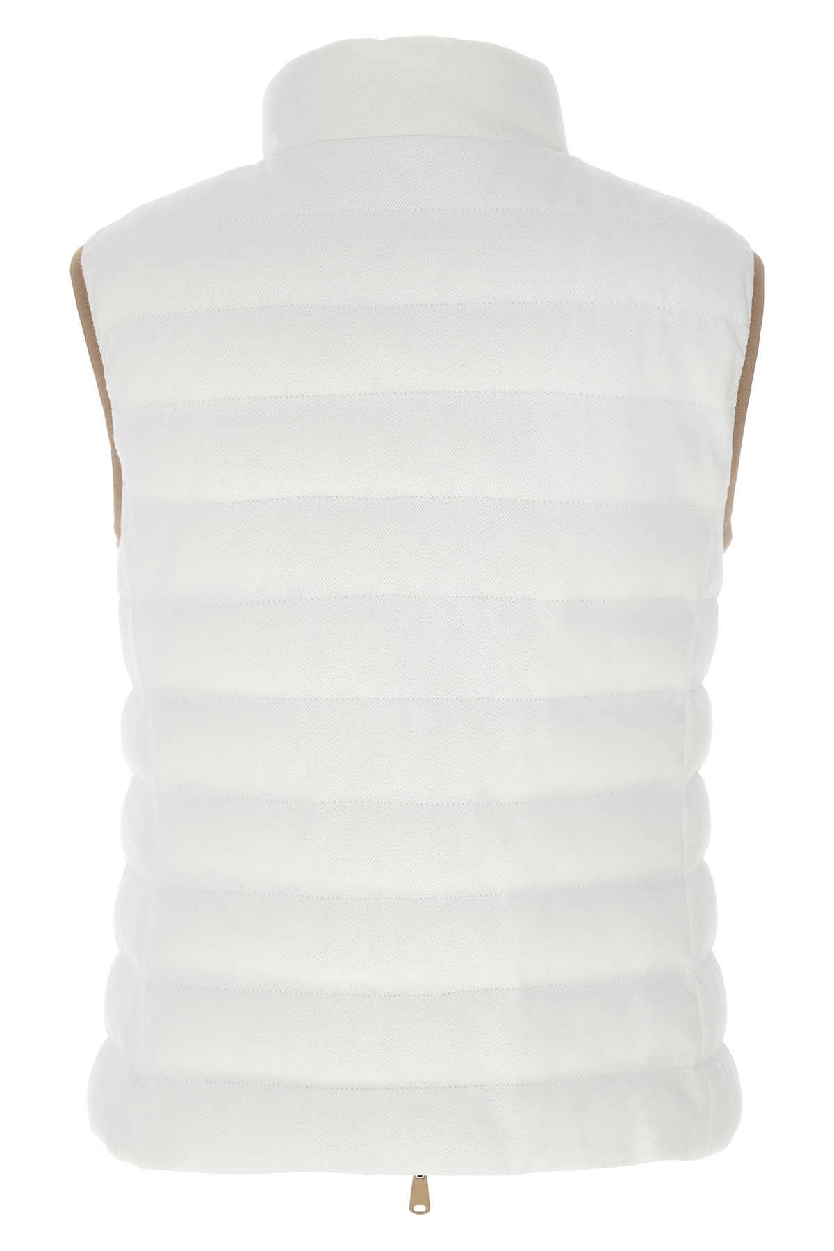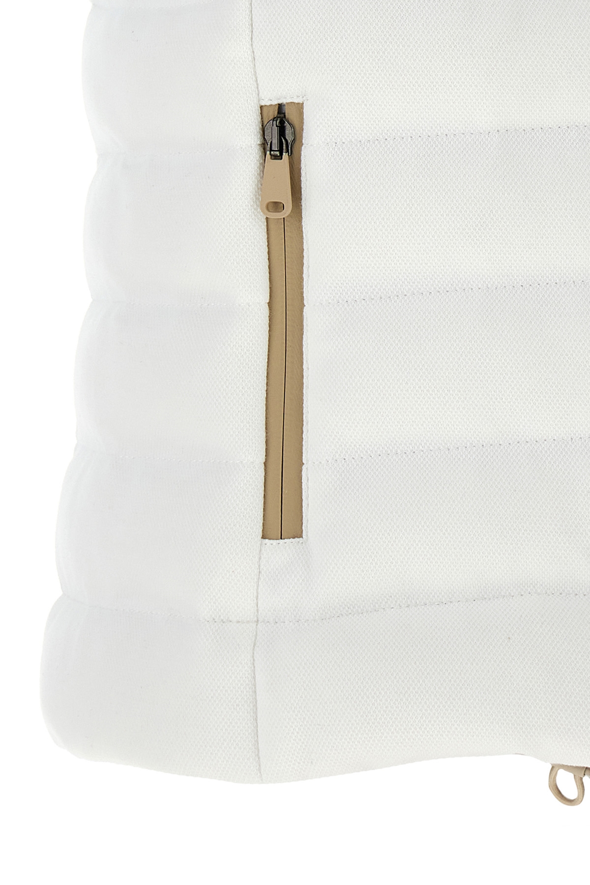 Goose down padded cotton vest with contrast details, front logo patch, pockets, zip closure, high neck.