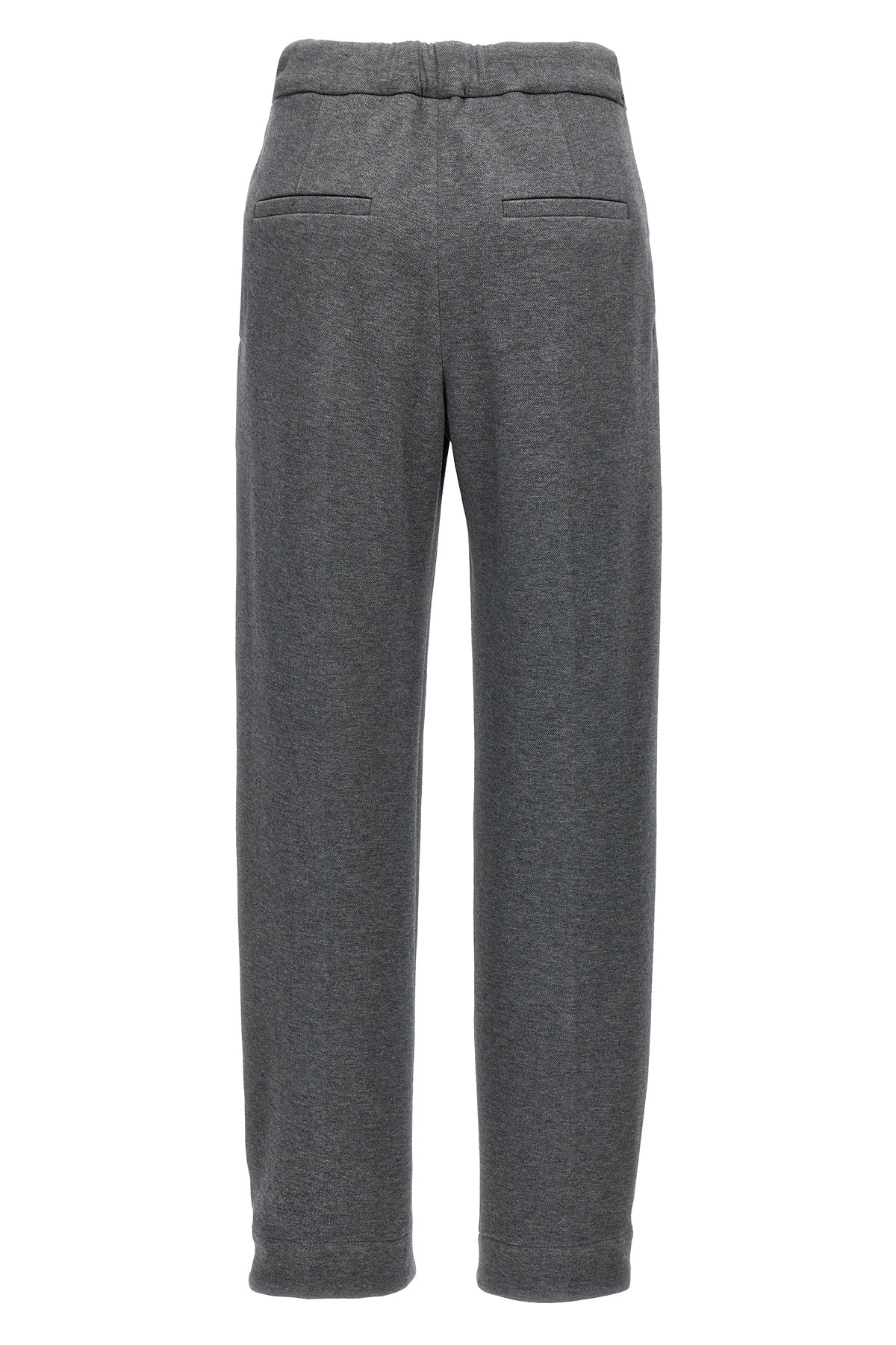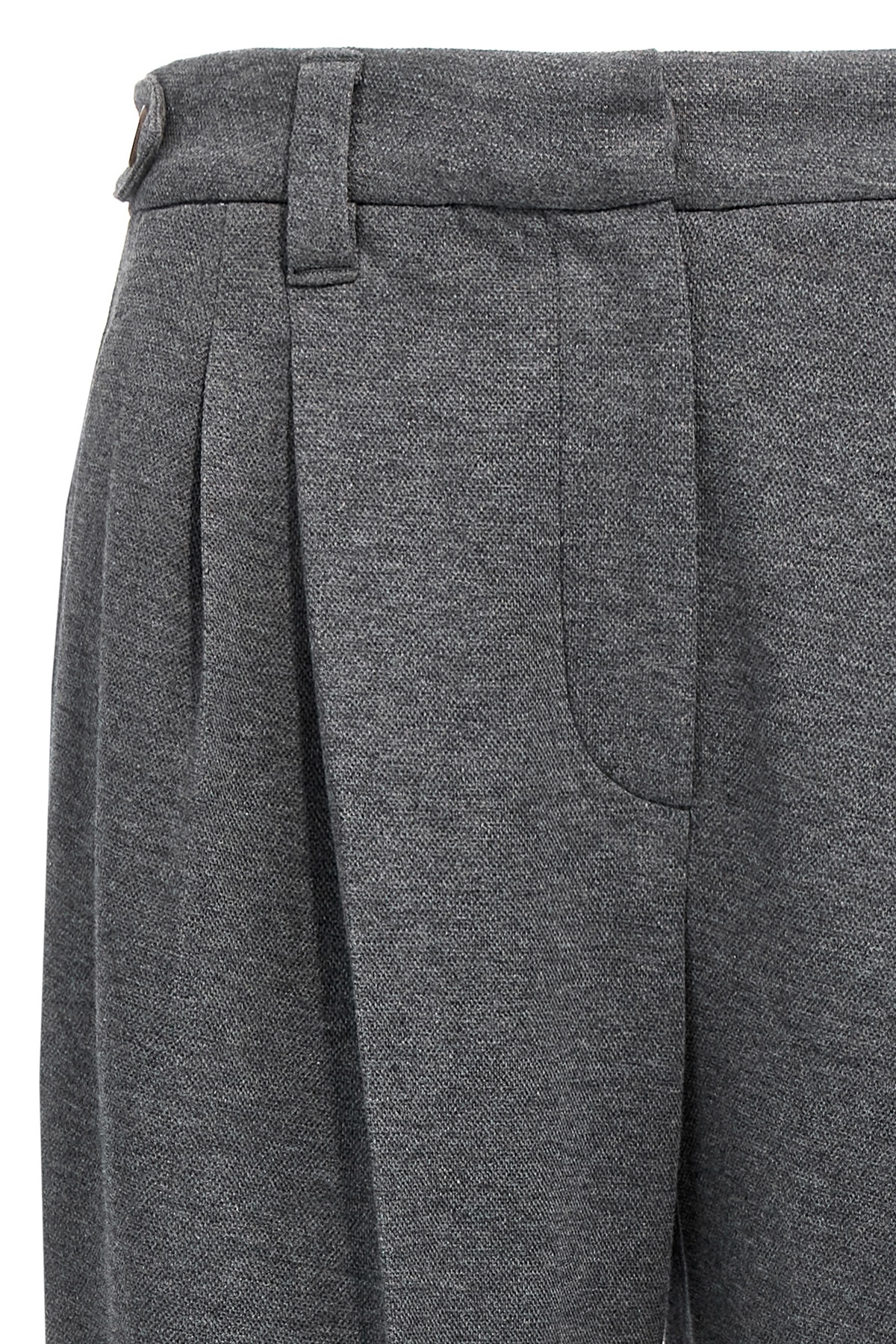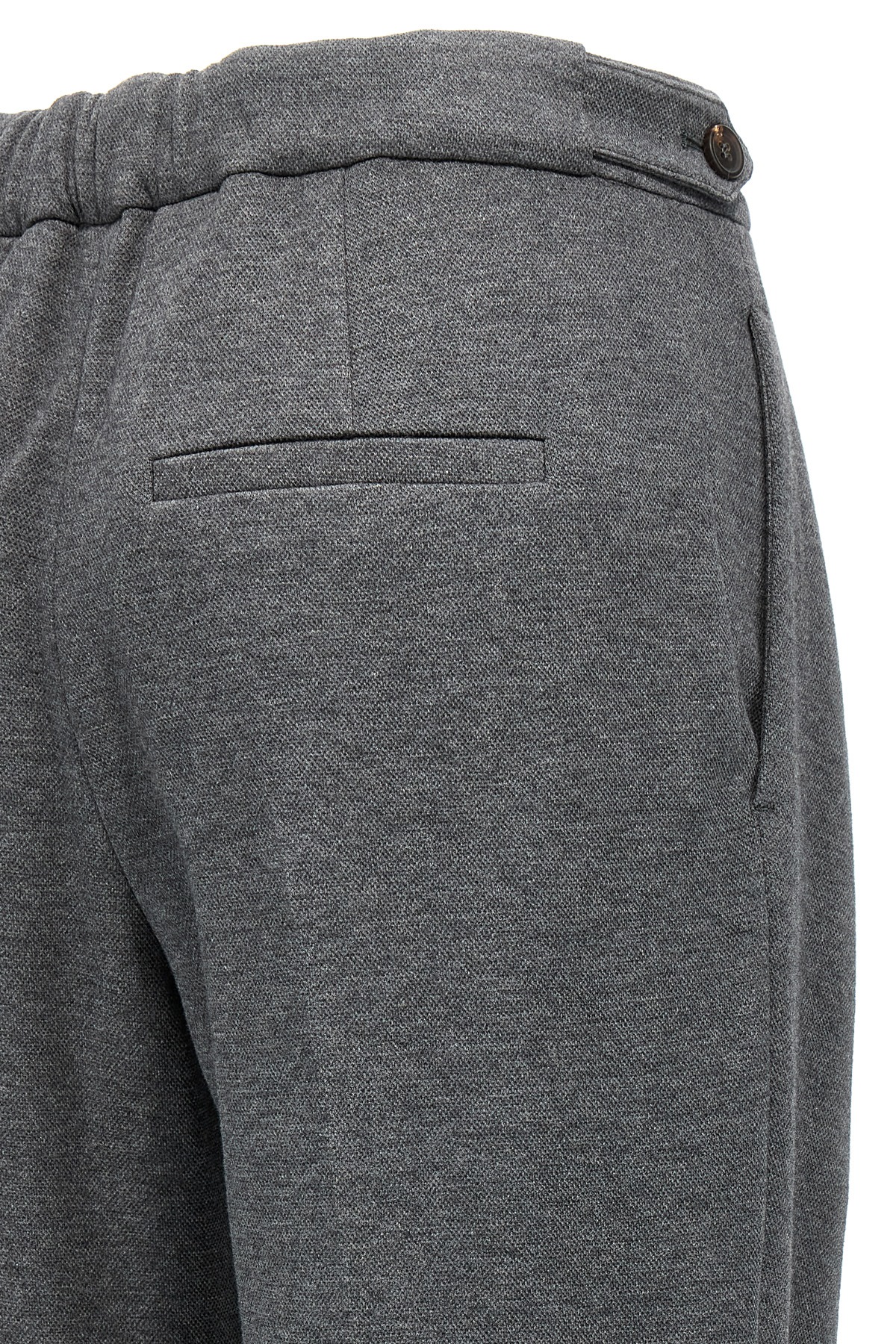 Melange cotton pique pants, front pins, hook and button zip closure, adjustable side straps, elastic back waistband, straight leg with stretched pleat and cuffs with cuffs on the bottom of the leg, pockets.