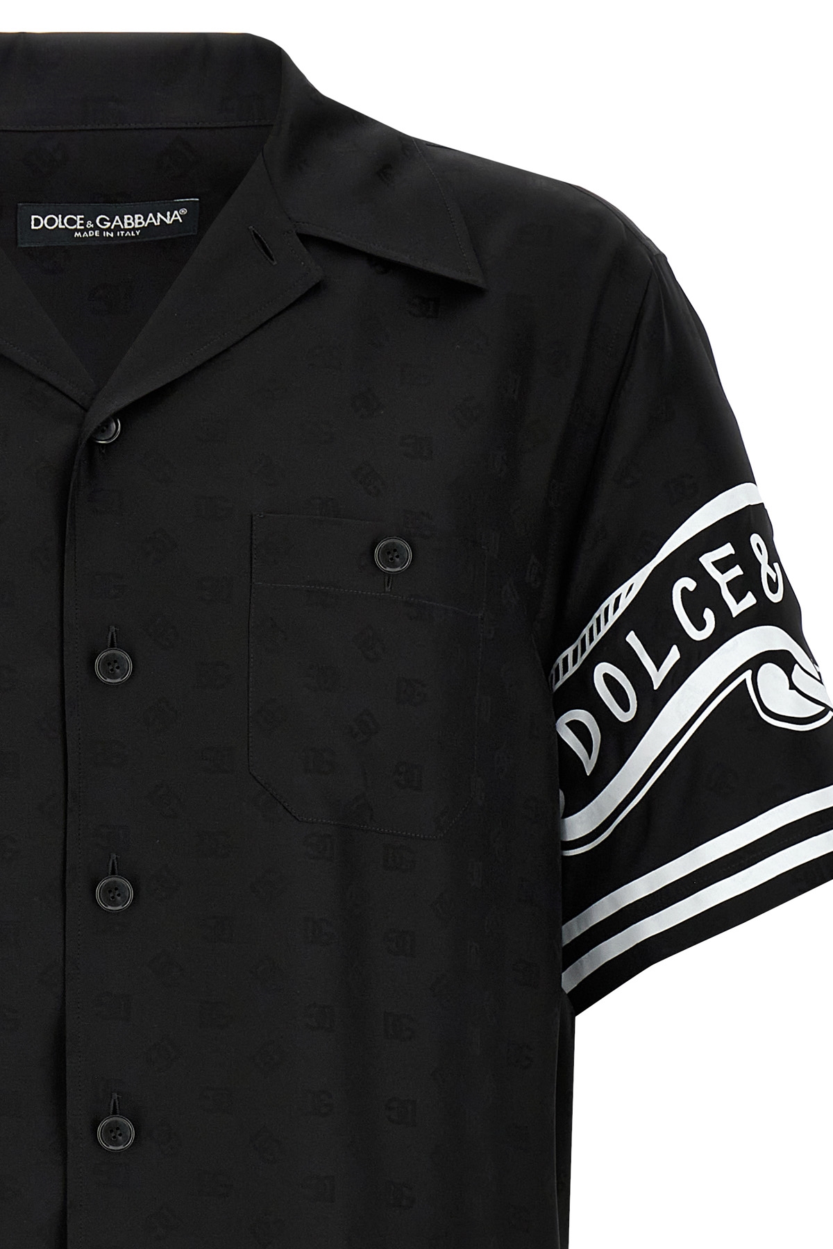 Silk twill shirt with bandana print and all-over jacquard logo, button closure, short sleeves, breast pocket, side slits.