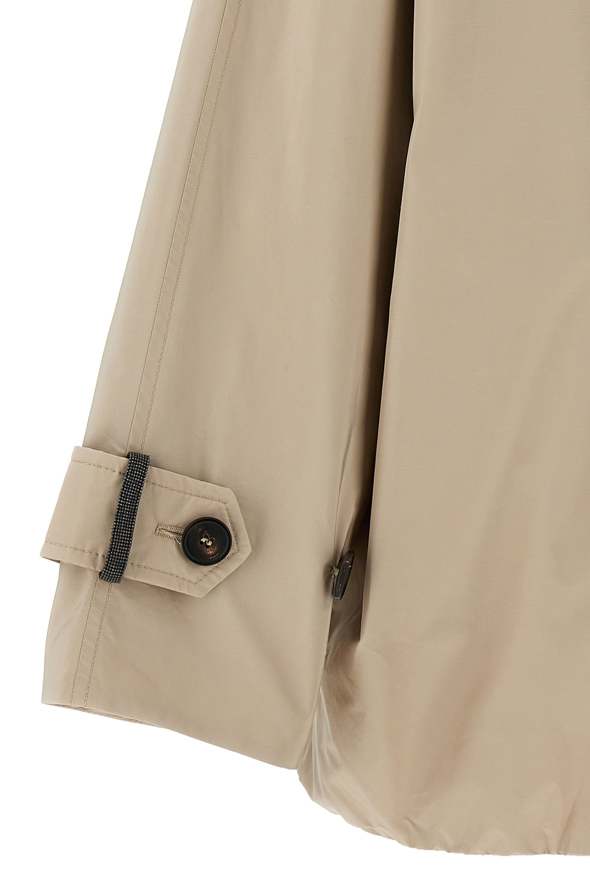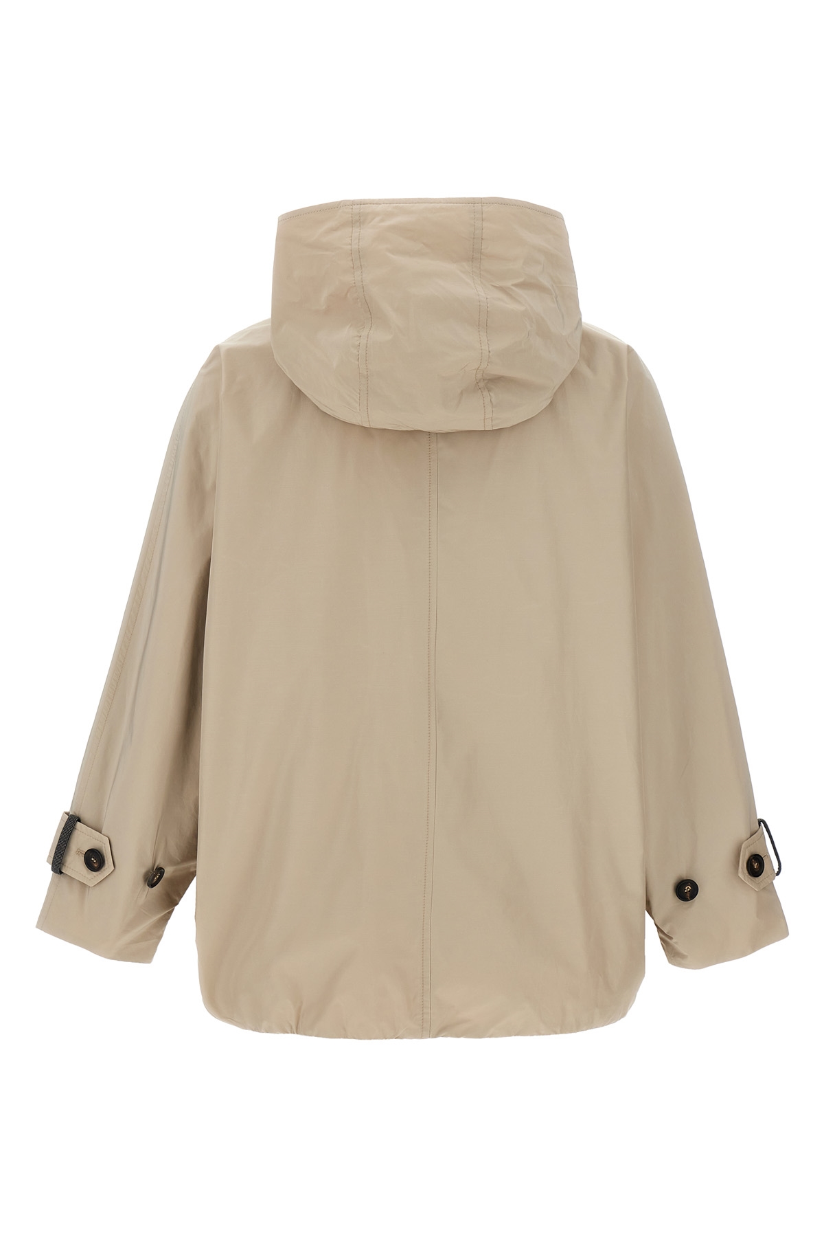 Double-breasted jacket in water-repellent technical fabric, baggy style with bat sleeves, hood, button closure, pockets, long sleeves with adjustable strap with Monile detail.
