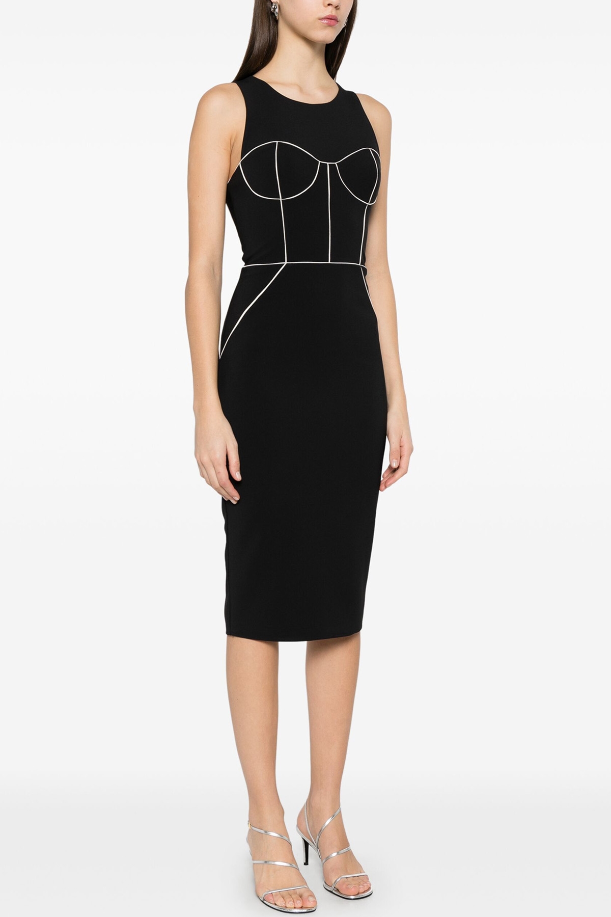 Sleeveless, stretch crepe dress with sheath dress with contrasting piping, trompe l'oeil bustier, satin lining, back zip closure, crew neck.