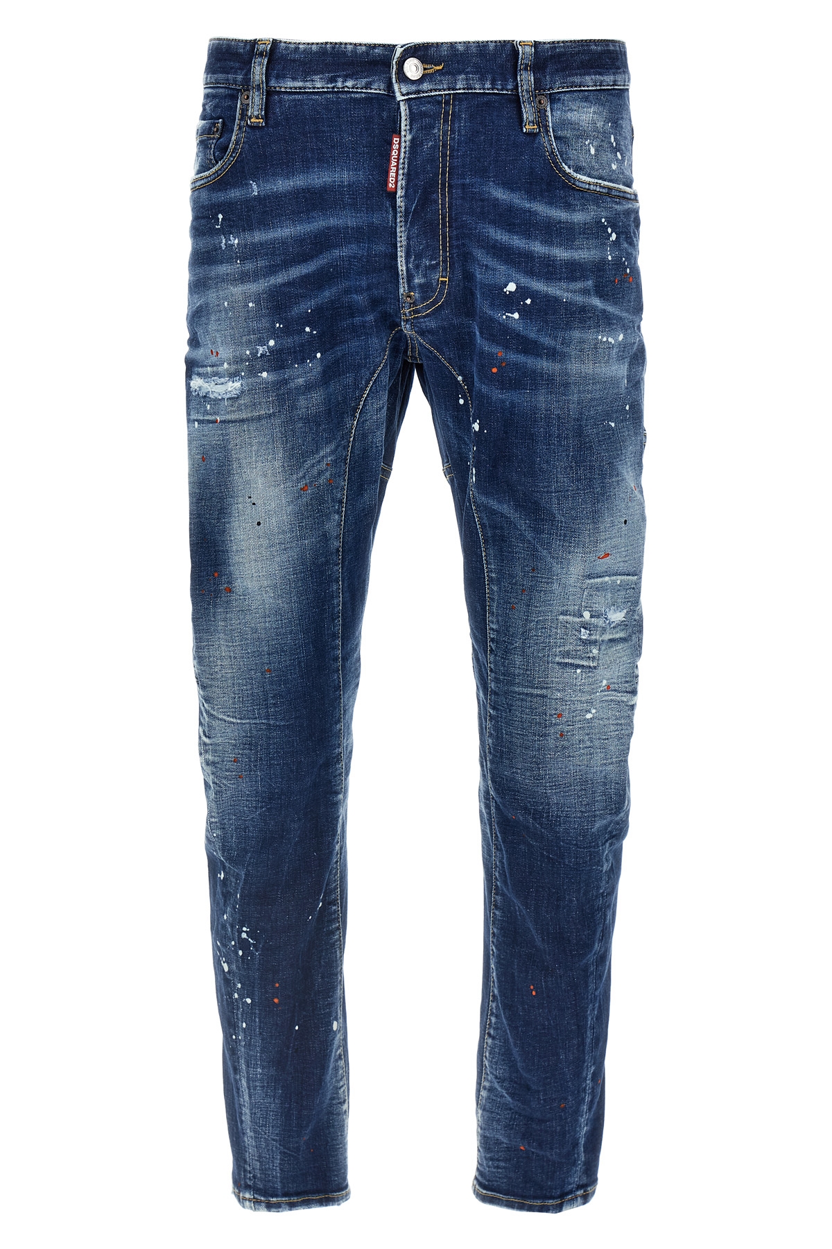 Tidy Biker' used-effect stretch cotton denim jeans with patent leather stains, button closure, five pockets, and leather logo label on the back.