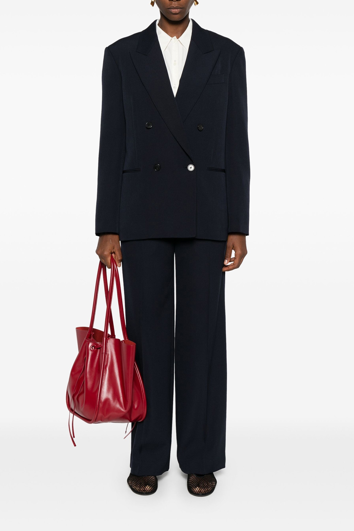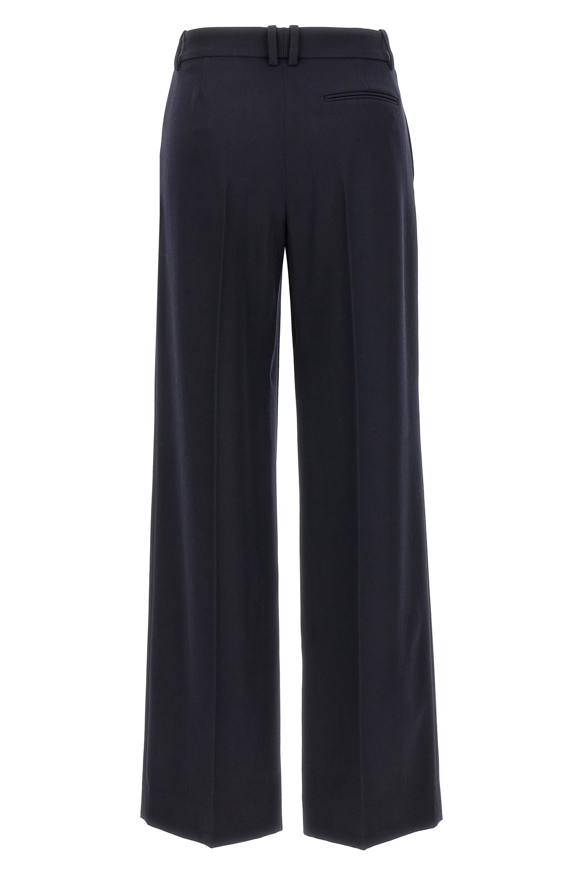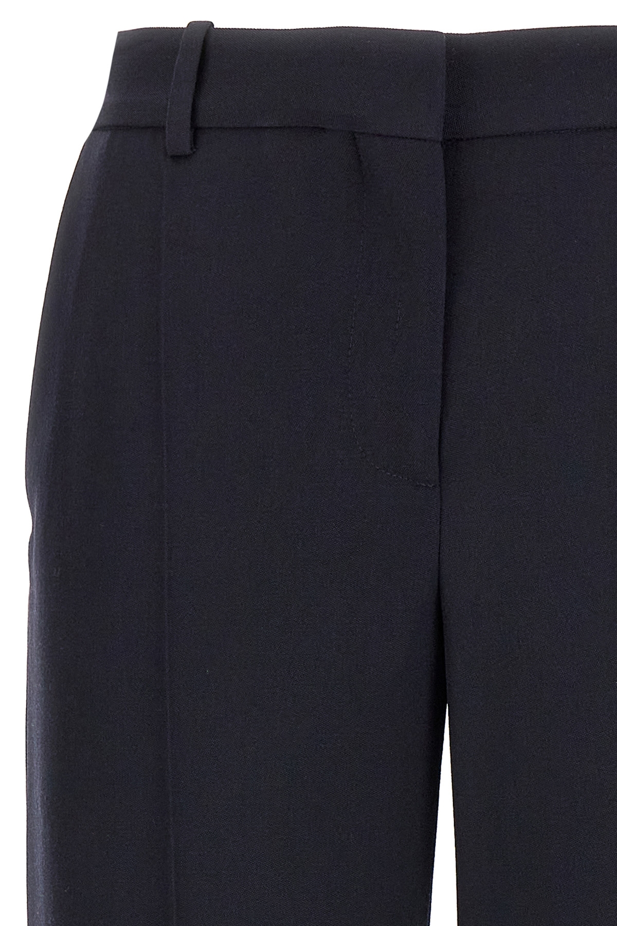 'Encore' wool pants, wide and straight leg with pressed pleat, hook and button zip closure, pockets.