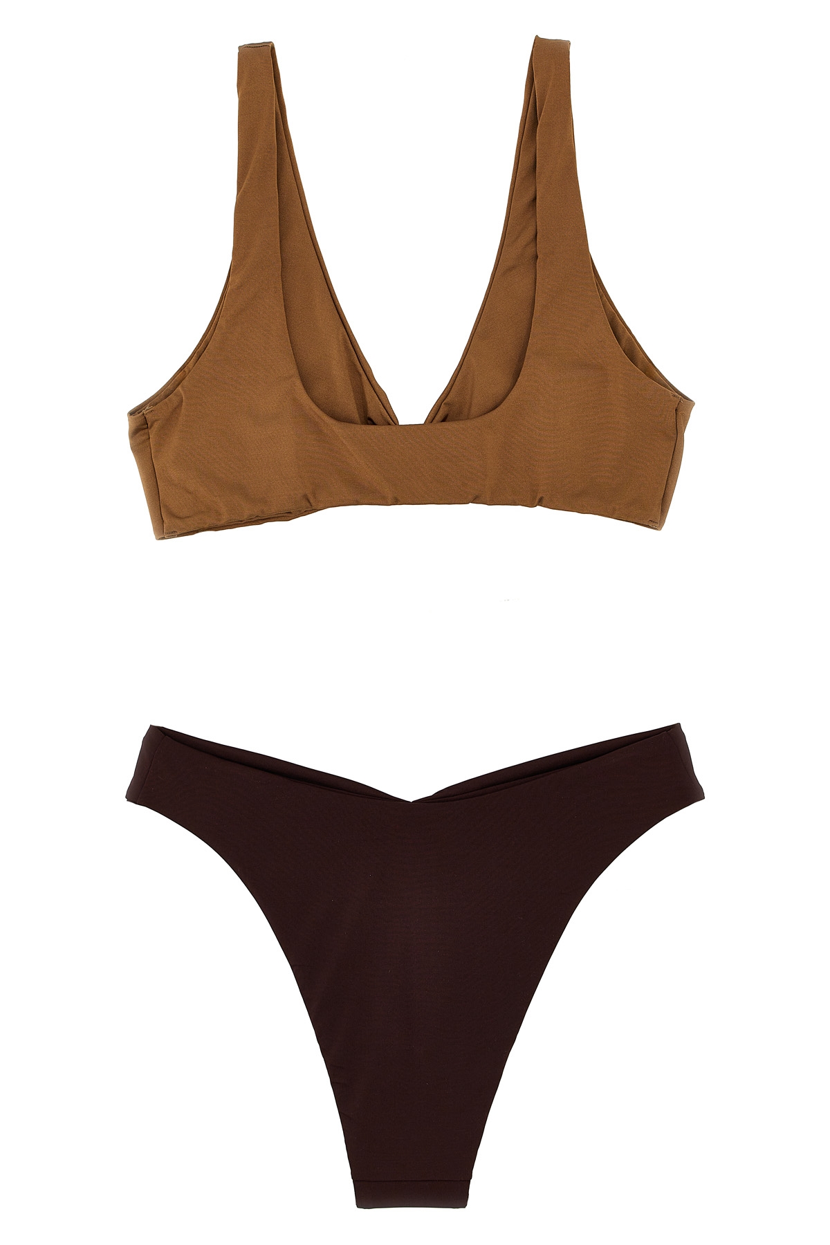 Bikini in two-tone glossy Lycra, top with front knot detail and removable metal logo, briefs with front curl.