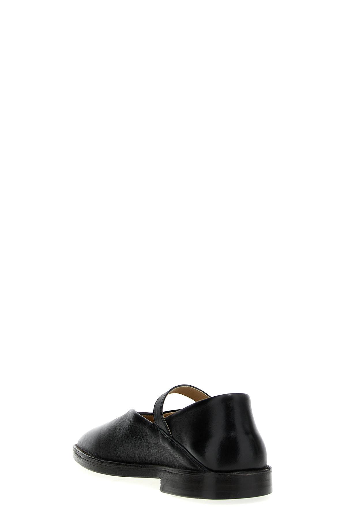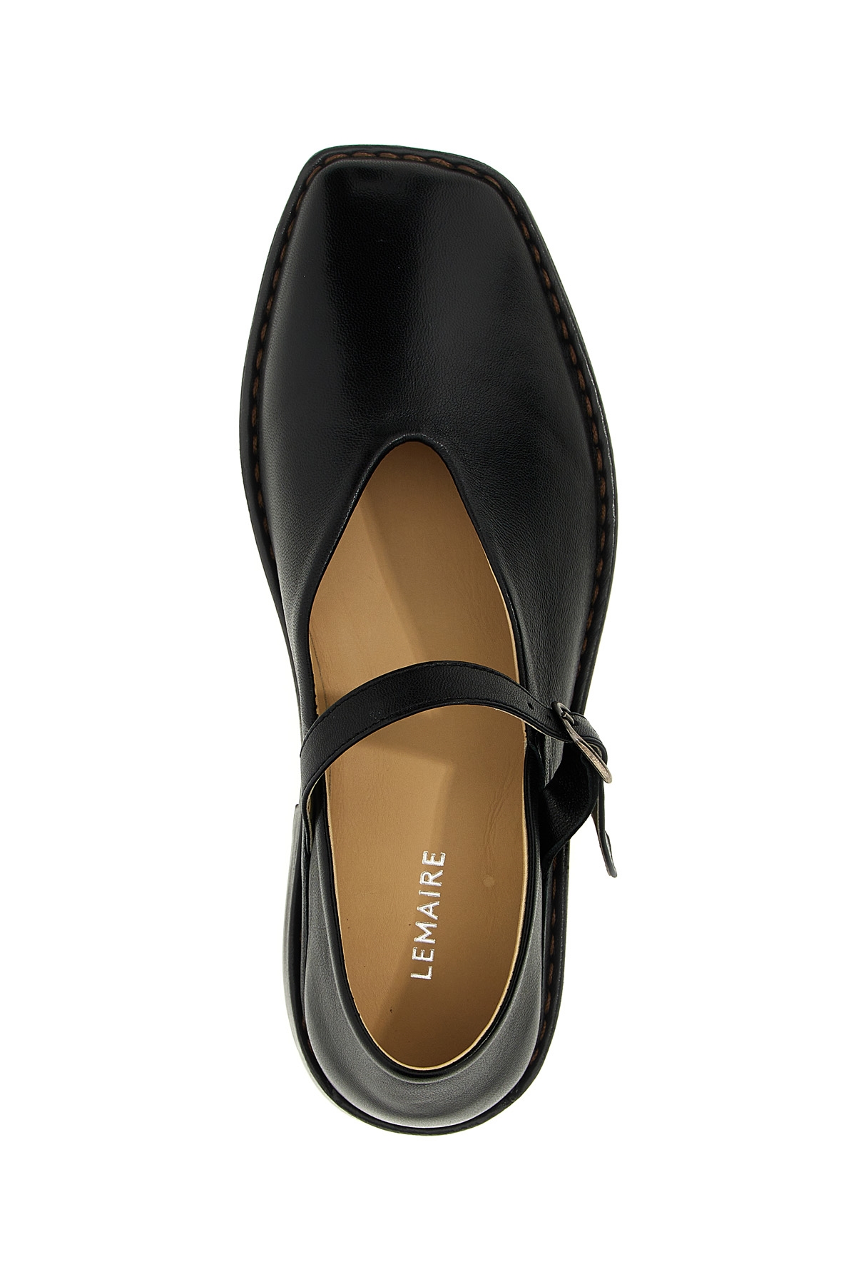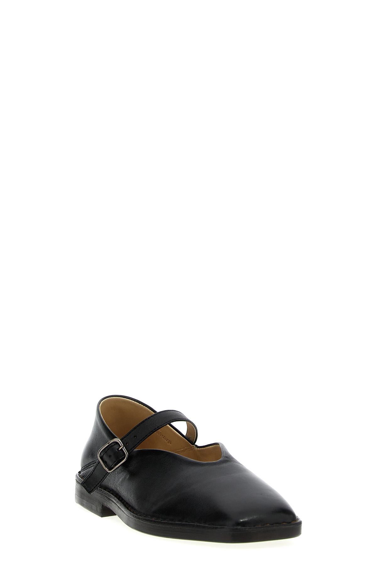 Leather ballet flats with square toe, adjustable strap, and leather sole.