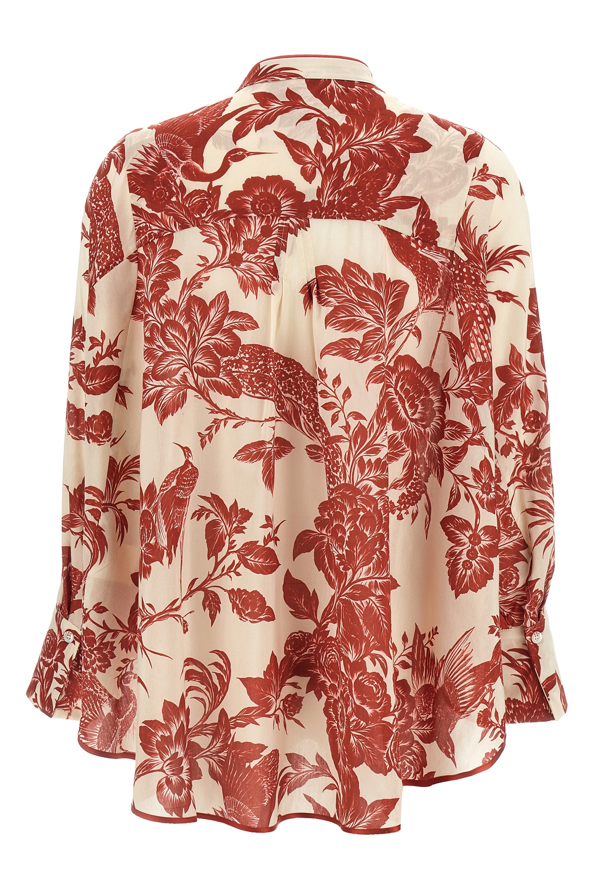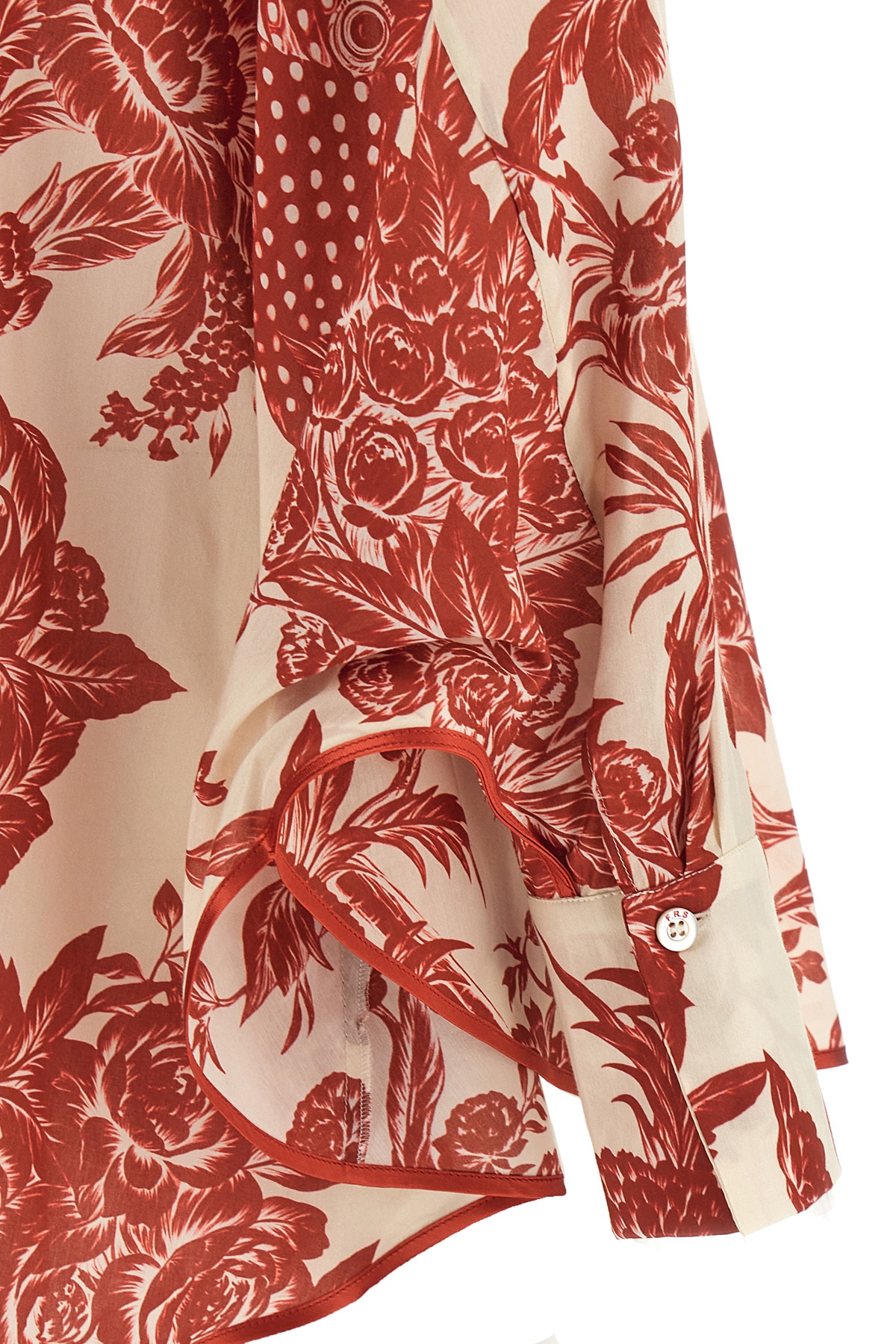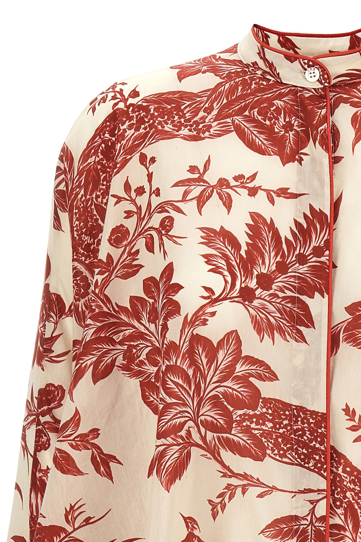 'Areto' shirt in silk muslin and cotton with floral print with solid satin piping, mandarin collar, button closure, long bat sleeves with cuffs, rounded hem.