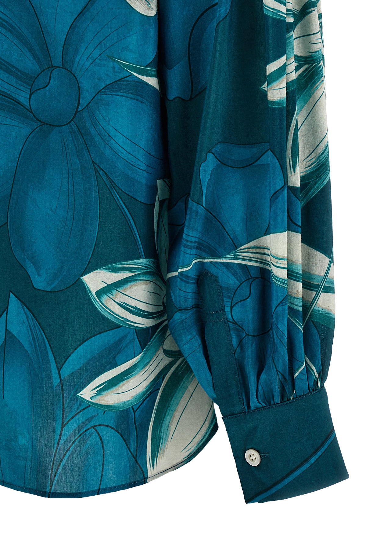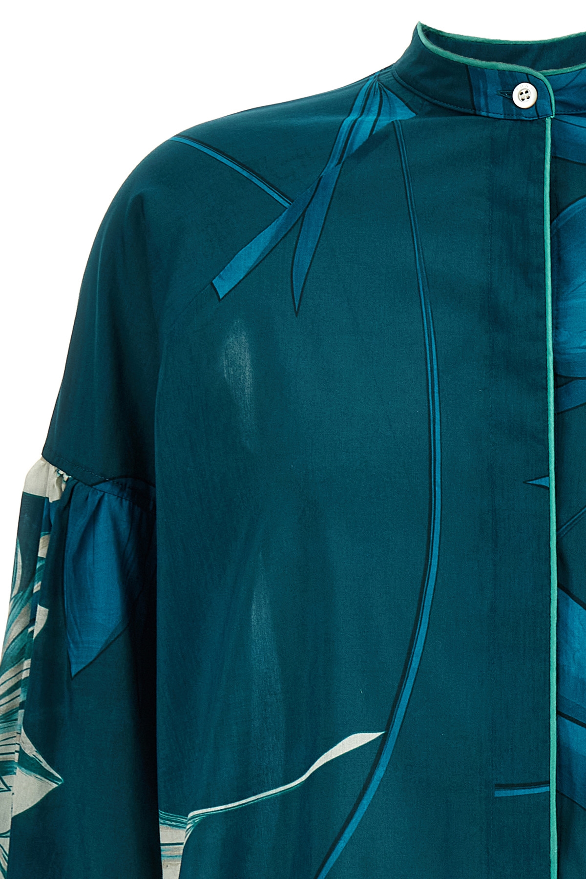 'Talestri' shirt in silk muslin and cotton with floral print with solid satin details, mandarin collar, button closure, long sleeves with cuffs and dropped shoulders, asymmetrical hem with side slits.