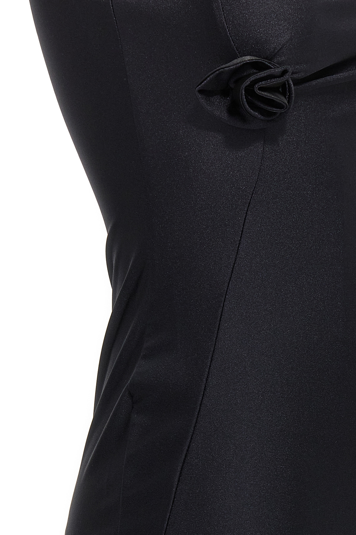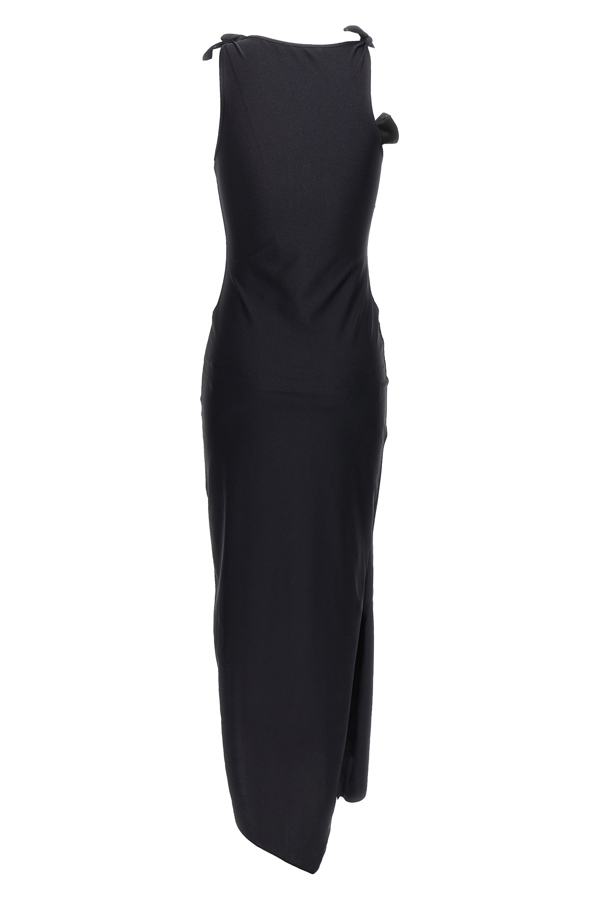 Long sleeveless dress in stretch fabric Asymmetric flower with front cut out detail with roses.
