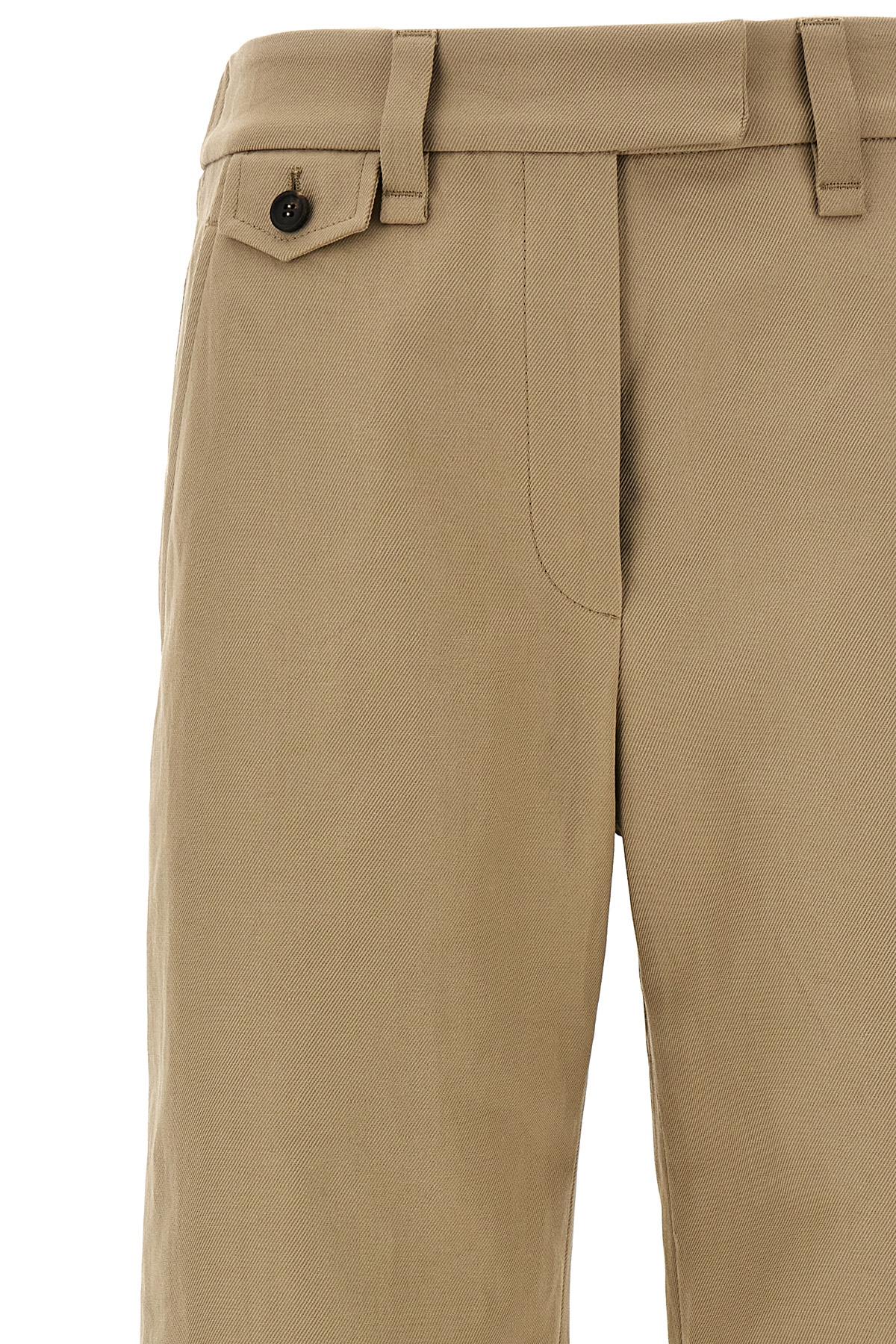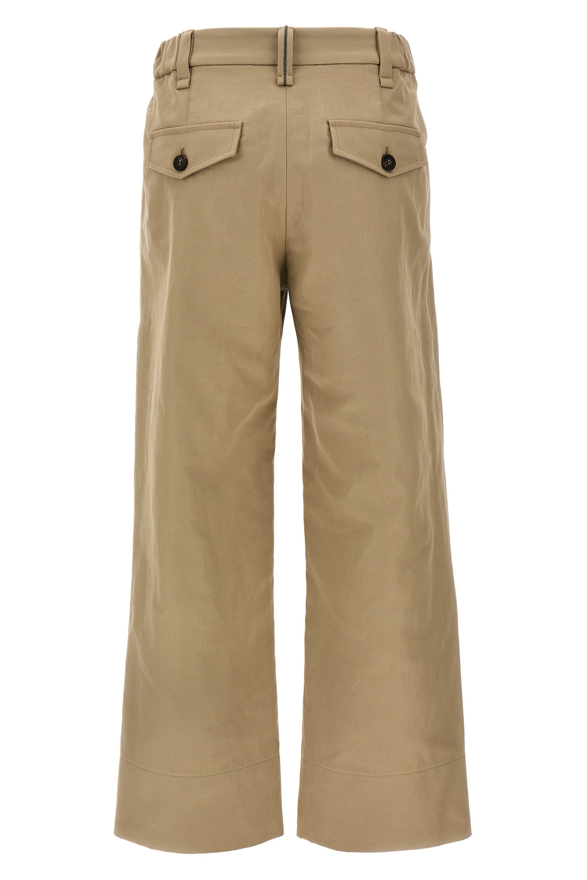 Cotton and linen blend trousers, wide and straight leg, back Monile detail, hook and button zip closure, maxi hem on the leg bottom, pockets.