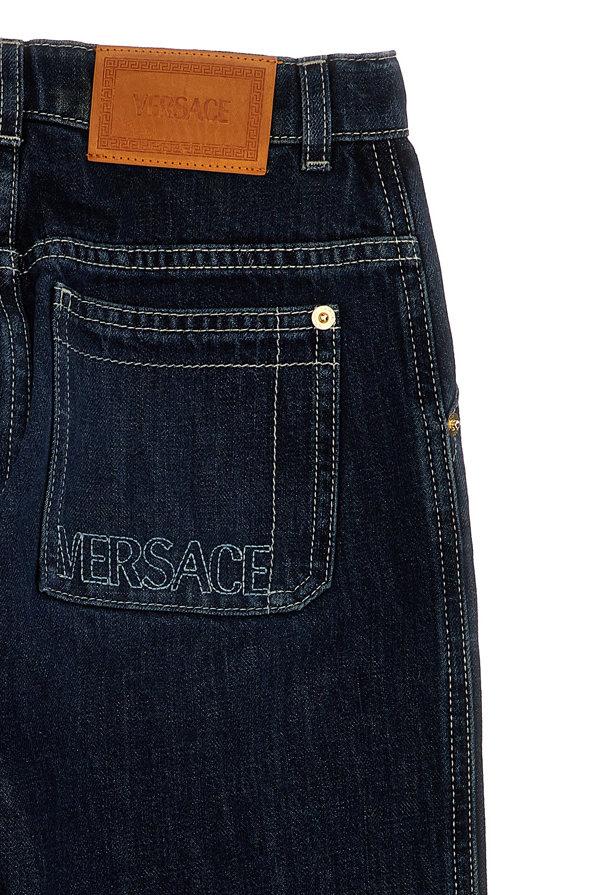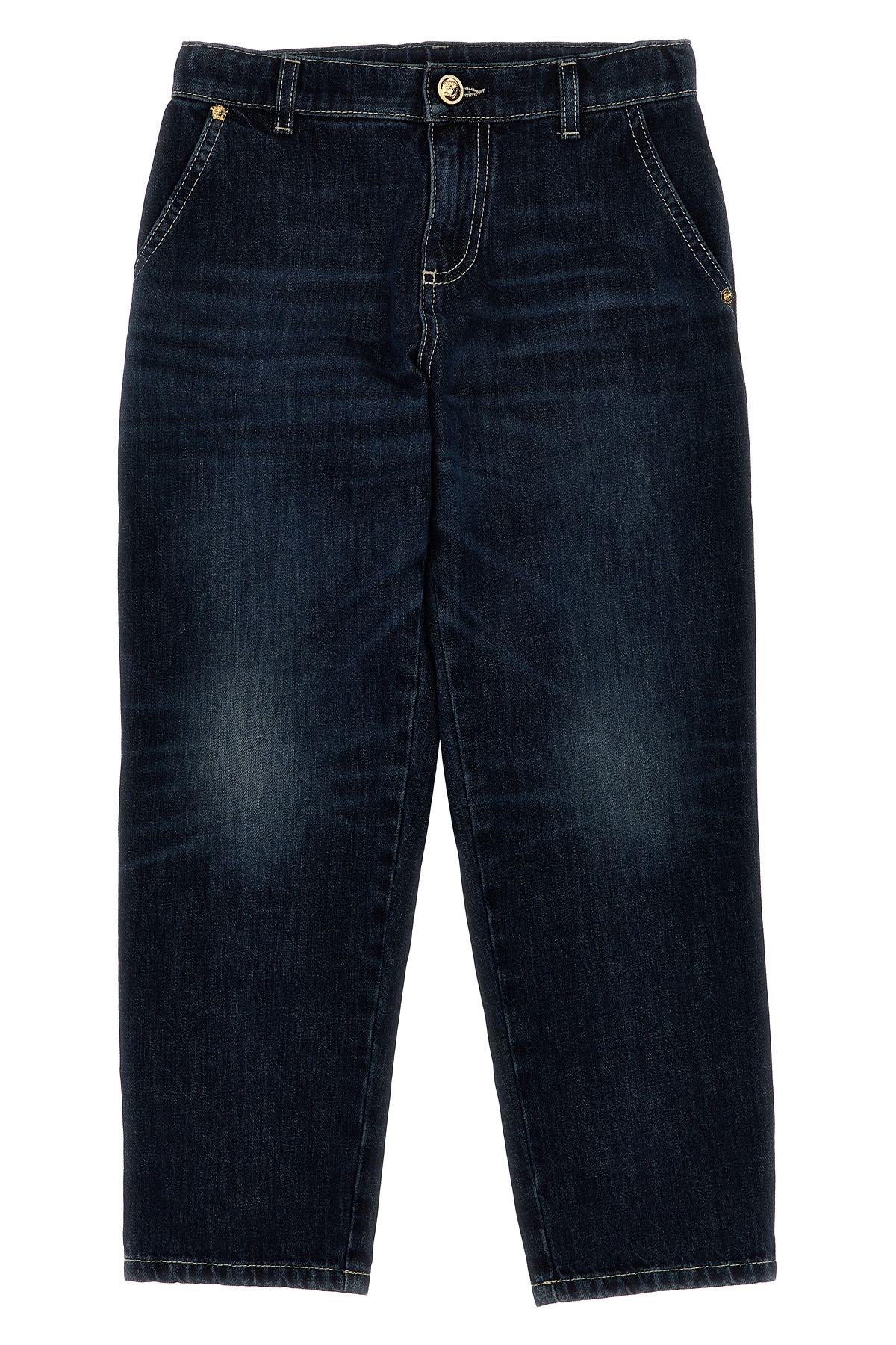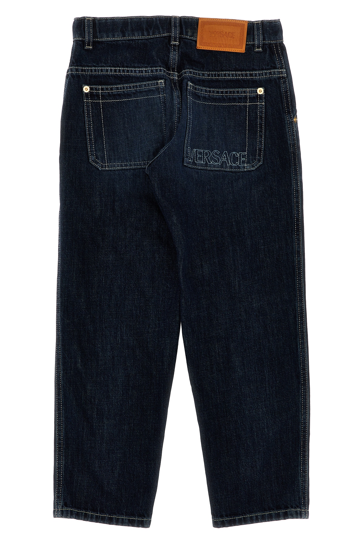 JULIAN KIDS Cotton denim jeans with zip and 'Medusa' button closure, pockets, leather logo tag, and embroidered logo on the back.