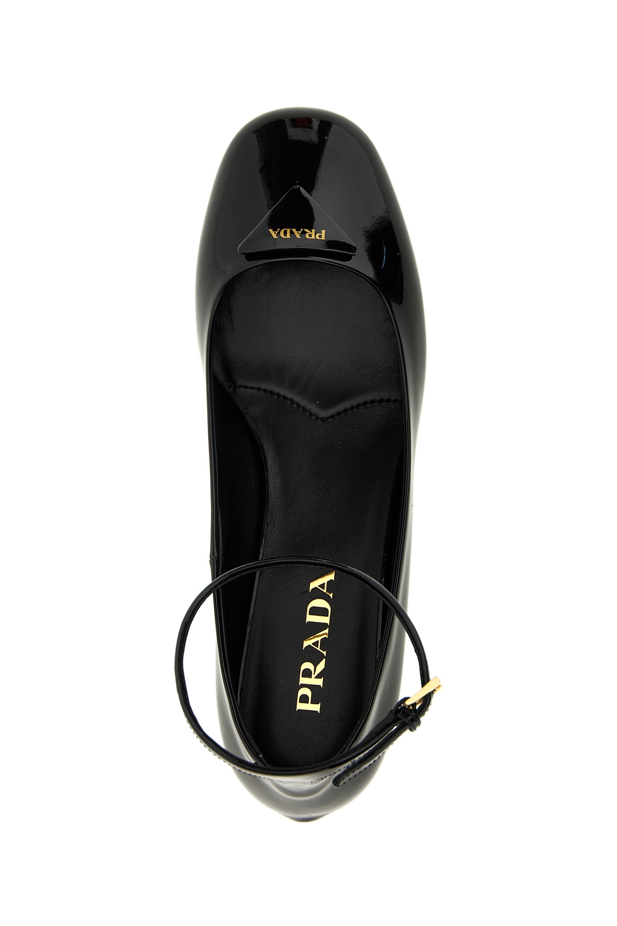 Patent leather ballet flats with front logo applique, adjustable strap, wide heels.