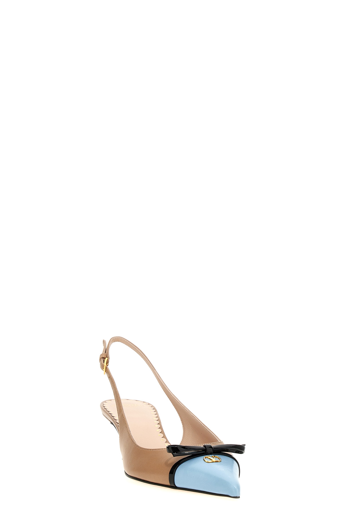 Two-tone leather slingback shoes with patent leather bow detail and metal 'VLogo Signature' on the front, pointed toe, adjustable strap, heel, leather sole.