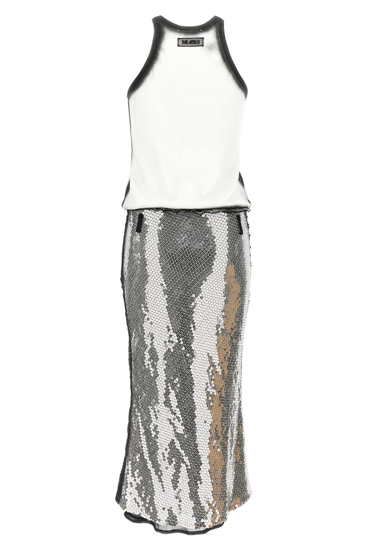 Midi dress with ribbed cotton tank top, contrasting spray can-effect piping, round neckline, back logo patch and all-over sequin skirt, underskirt, belt loops.