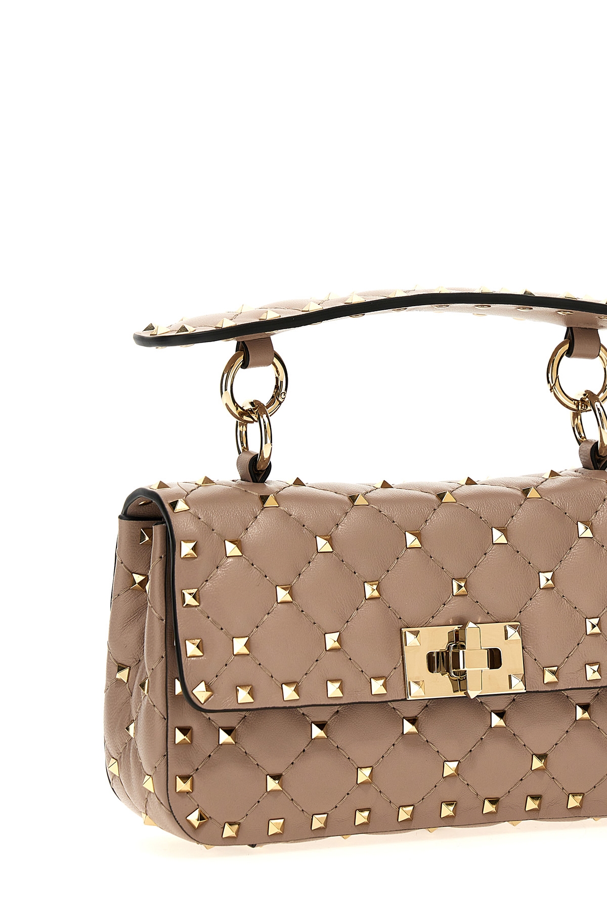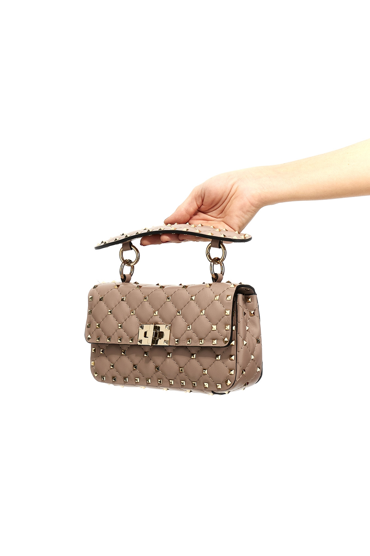 Small 'Rockstud Spike' nappa leather handbag with all-over studs, flap closure with swivel, removable handle, removable chain shoulder strap.