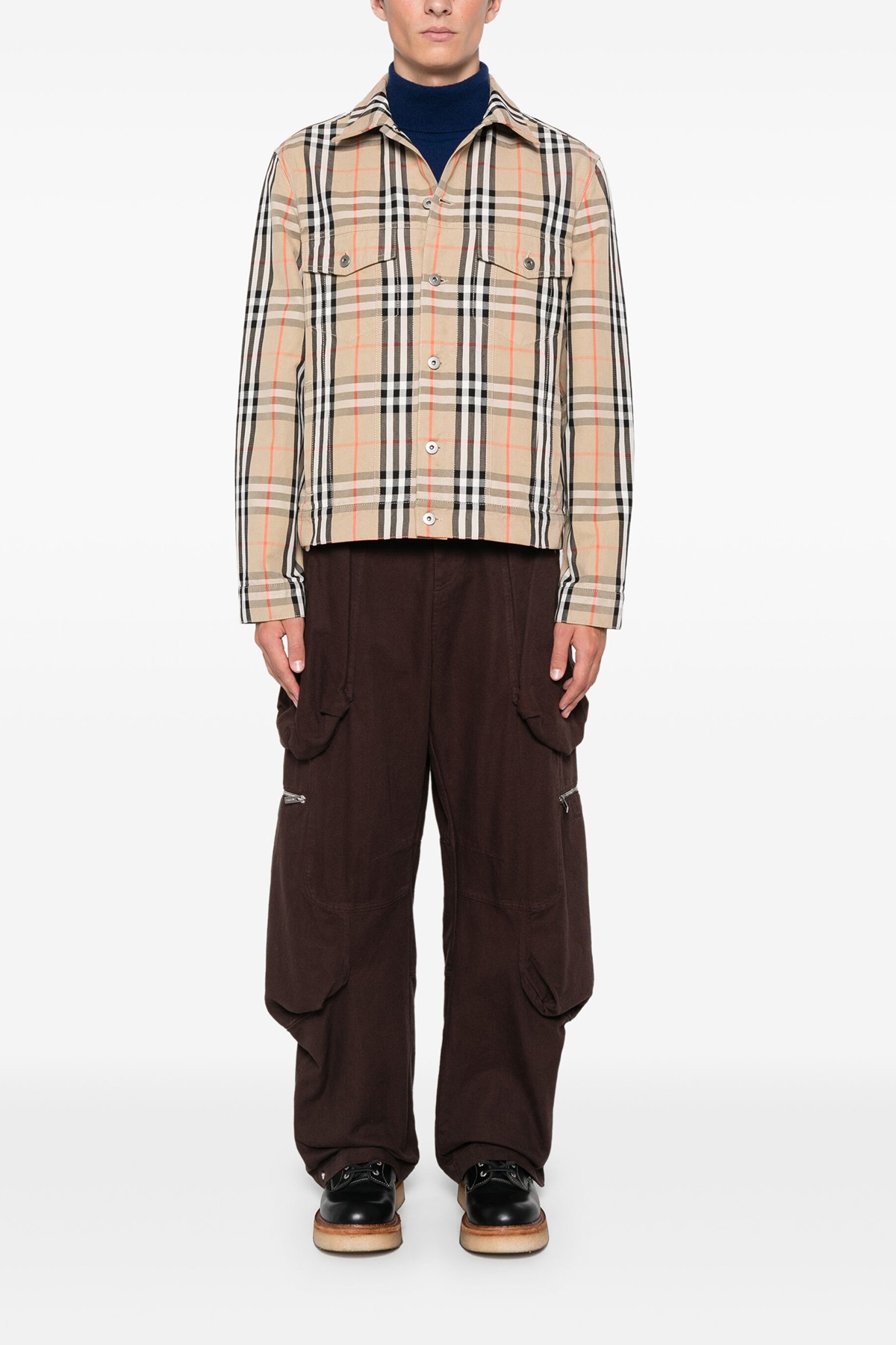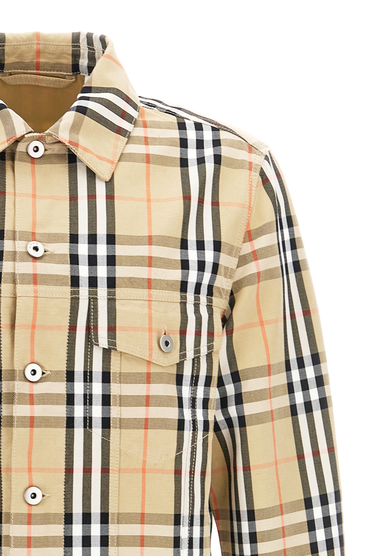 Burberry Check cotton jacket with button closure, pockets, long cuffed sleeves, back suede logo tag.