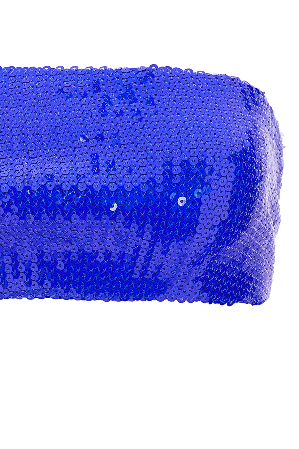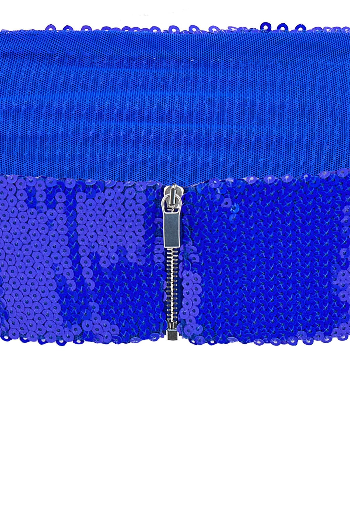 Cropped top, off-the-shoulder style with ll-over sequin applique and a back zip closure.