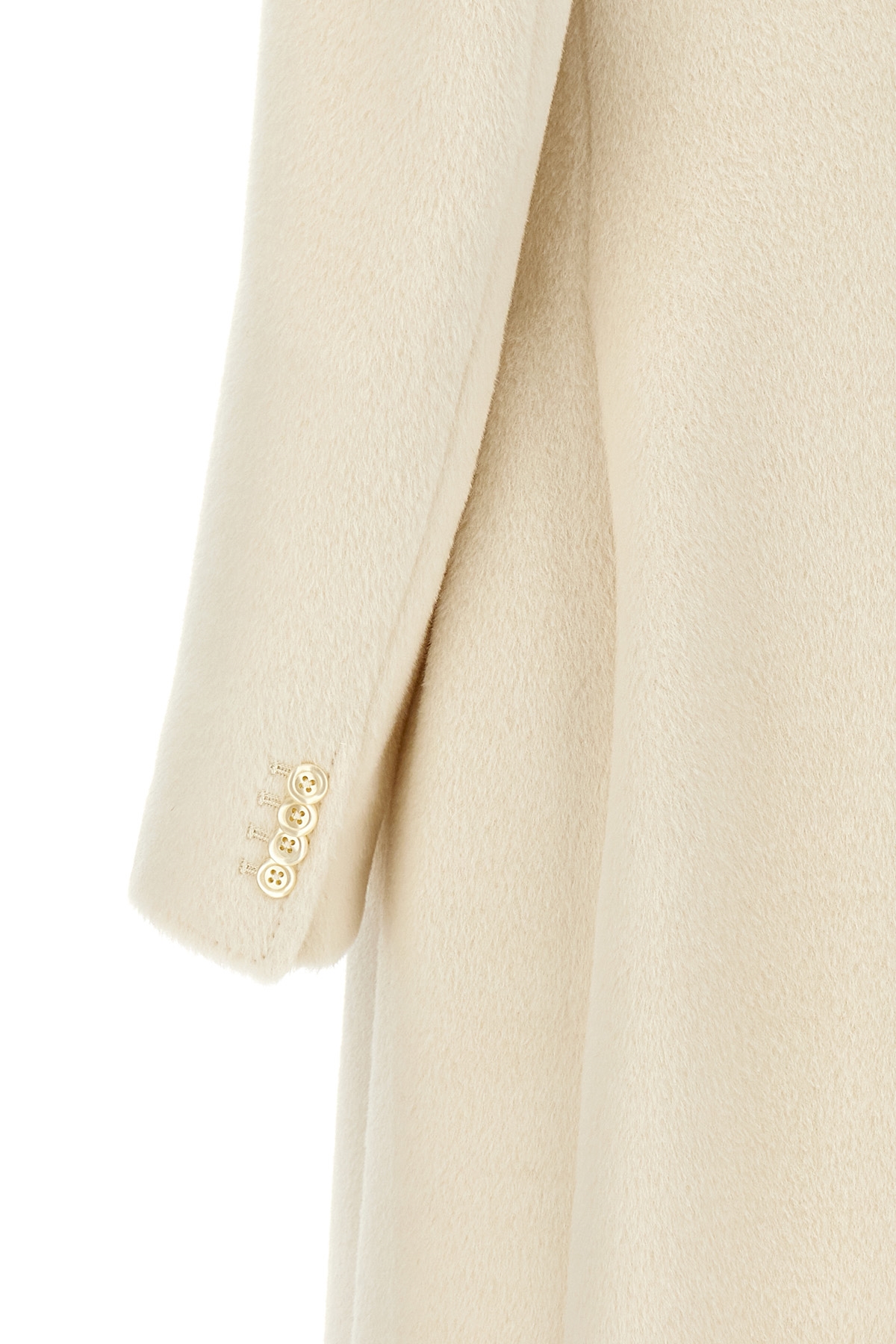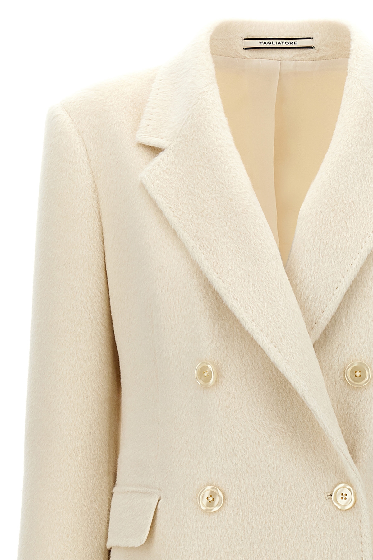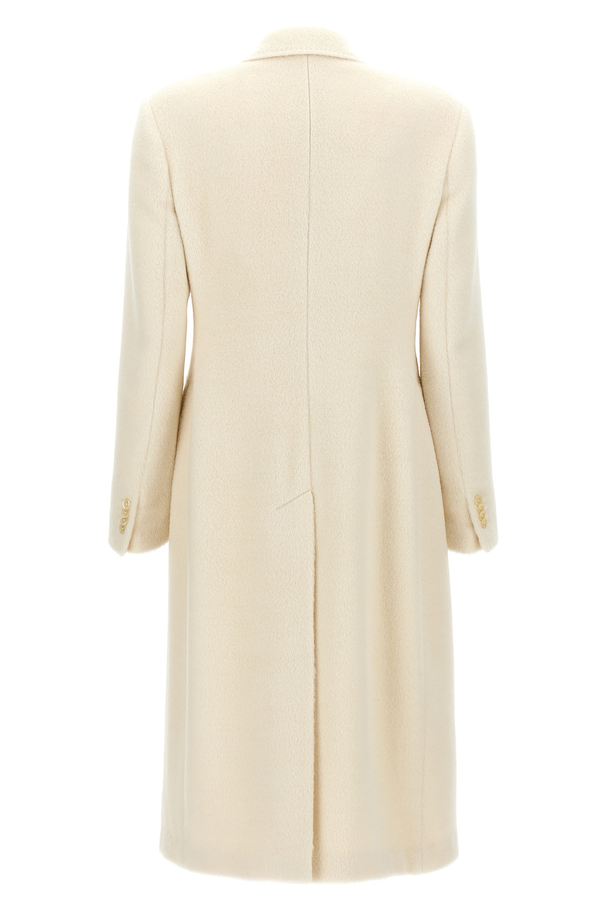 Double-breasted alpaca and wool coat with button closure, flap pockets, structured shoulder strap, back split, and long sleeves.