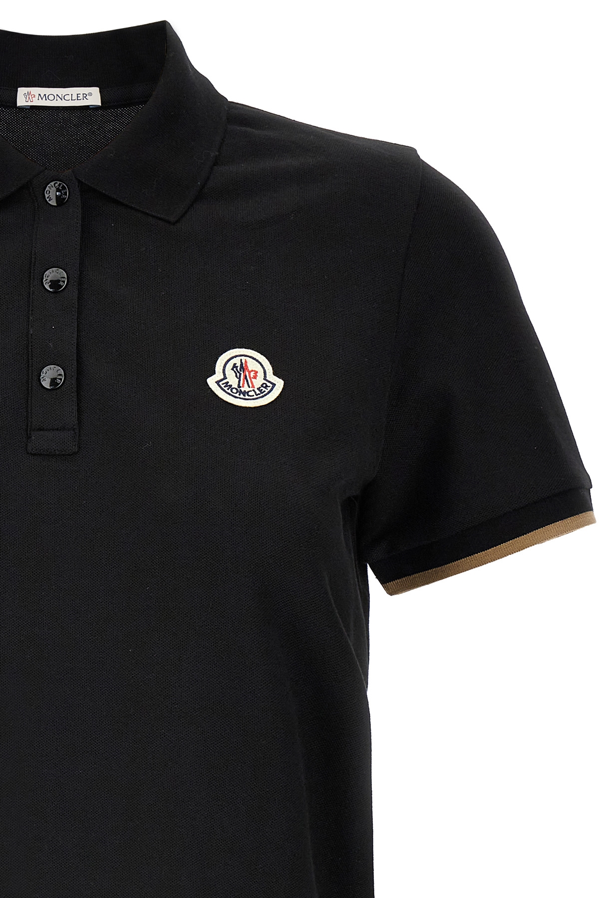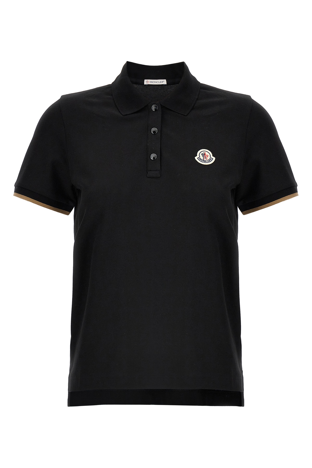 Cotton pique polo shirt, collar, snap buttons, front logo patch, side splits, and short sleeves.