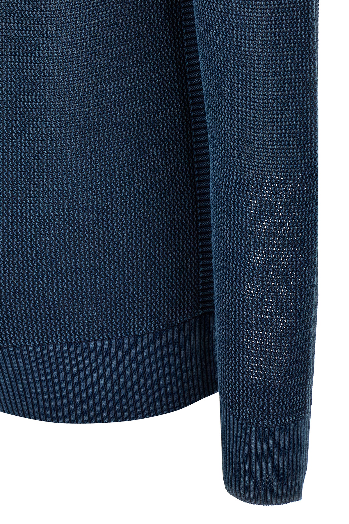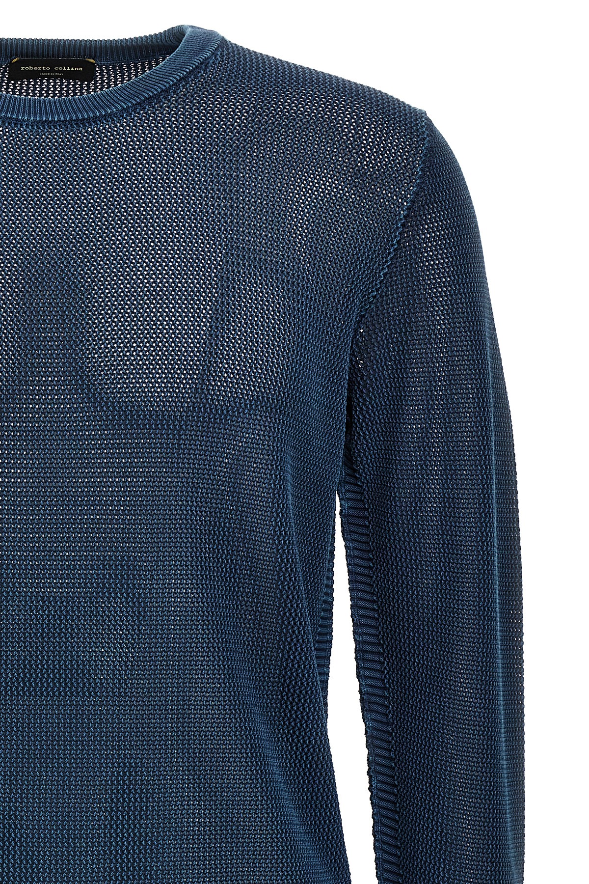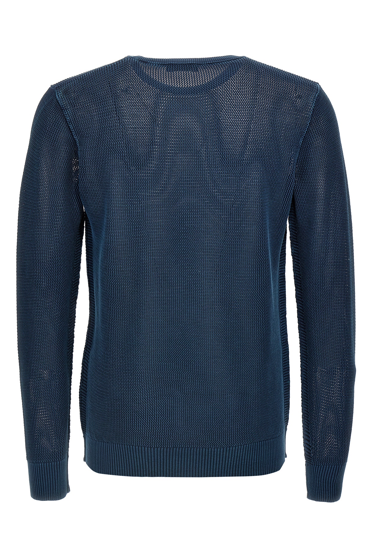 Delave netted cotton sweater with delave mesh effect, crew neck, long cuffed sleeves. Any color irregularities are not to be considered a defect but a characteristic of the yarn.