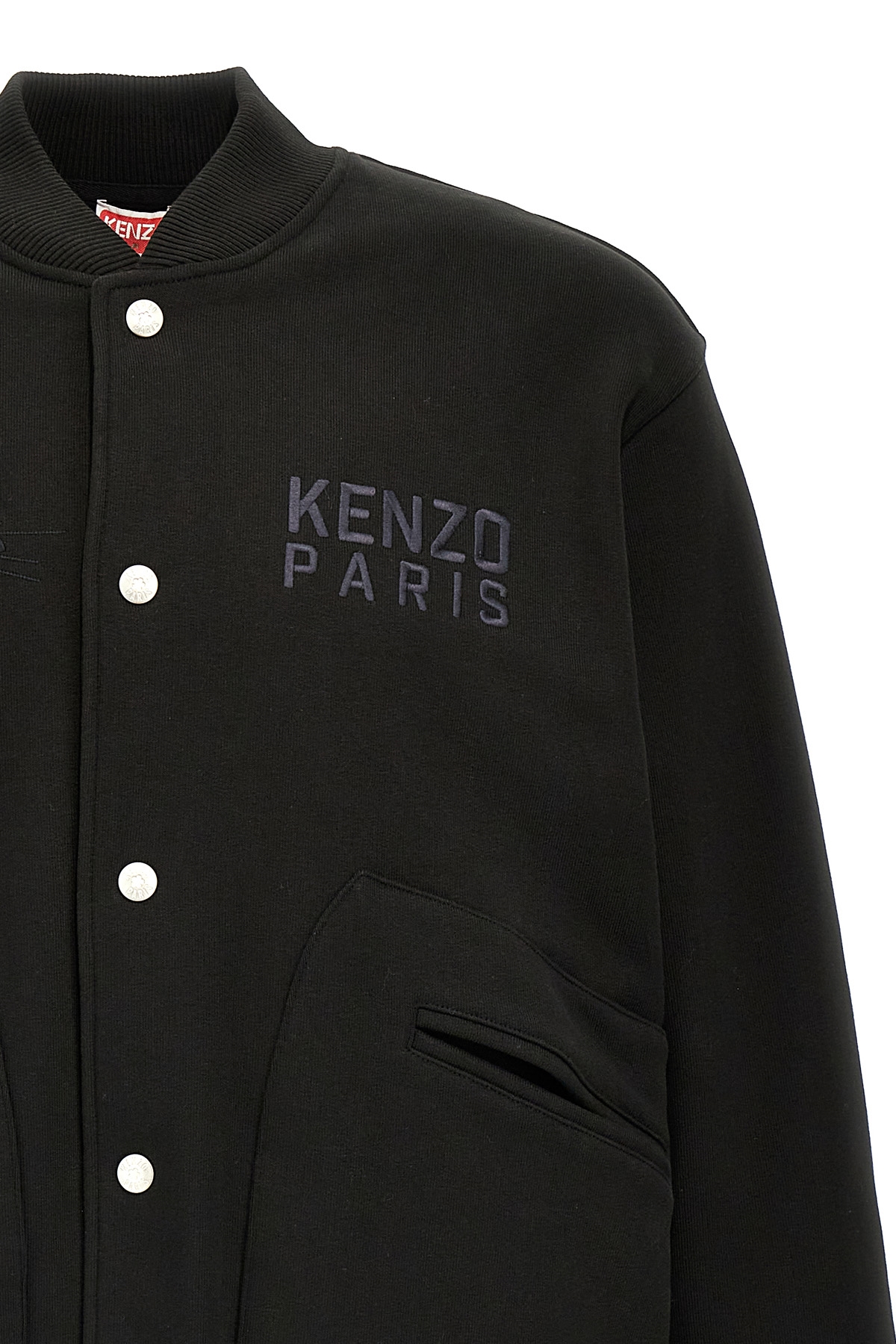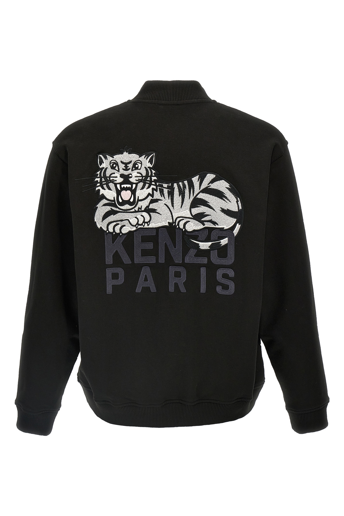 'Gots Happy Tiger' heavy cotton bomber jacket, patch and logo embroidery front and back, snap button closure, pockets, long cuffed sleeves.