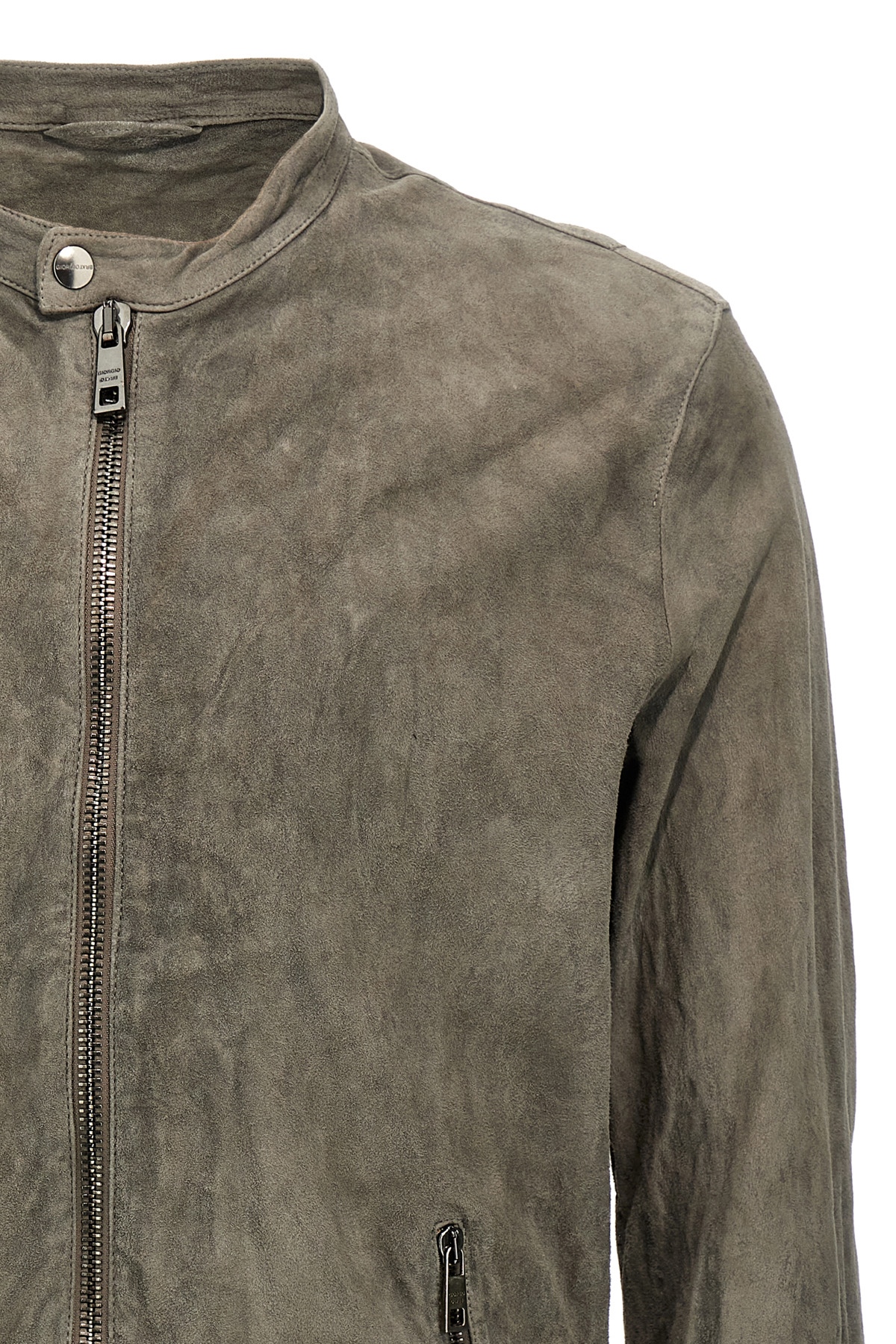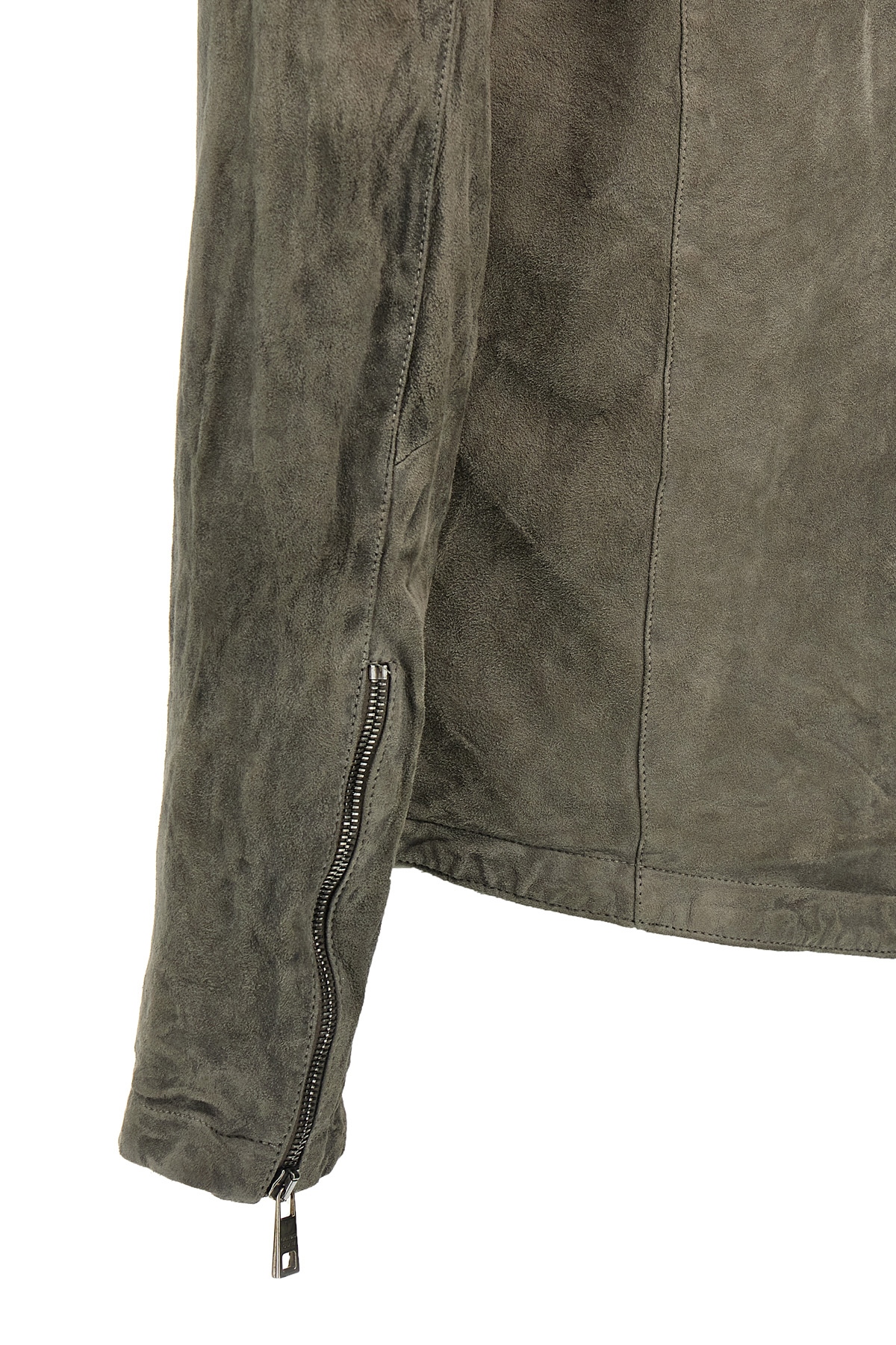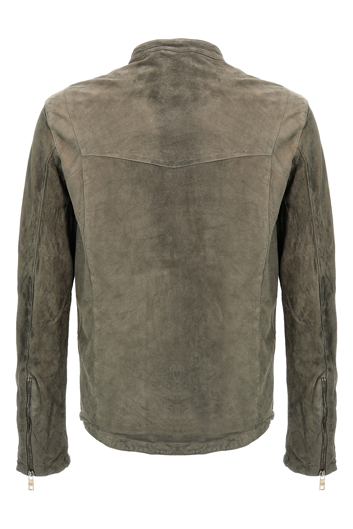 Vegetable-tanned suede jacket with zip closure, zip pockets, crew neck with snap button, long sleeves with zip on the bottom.