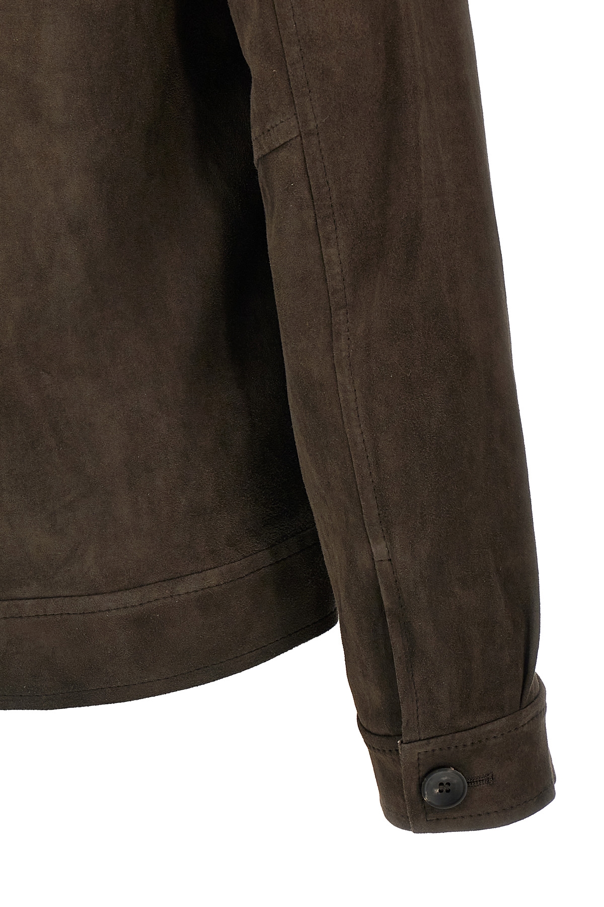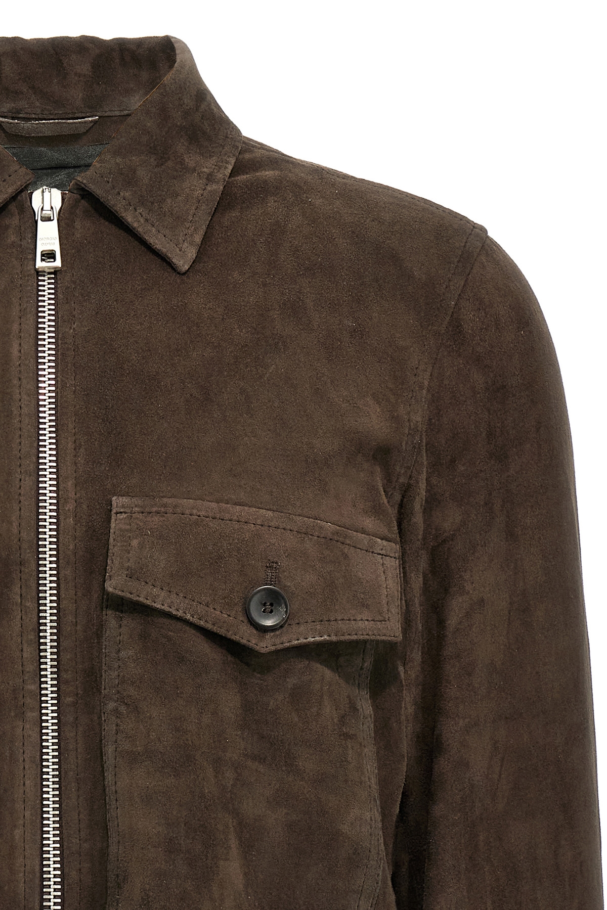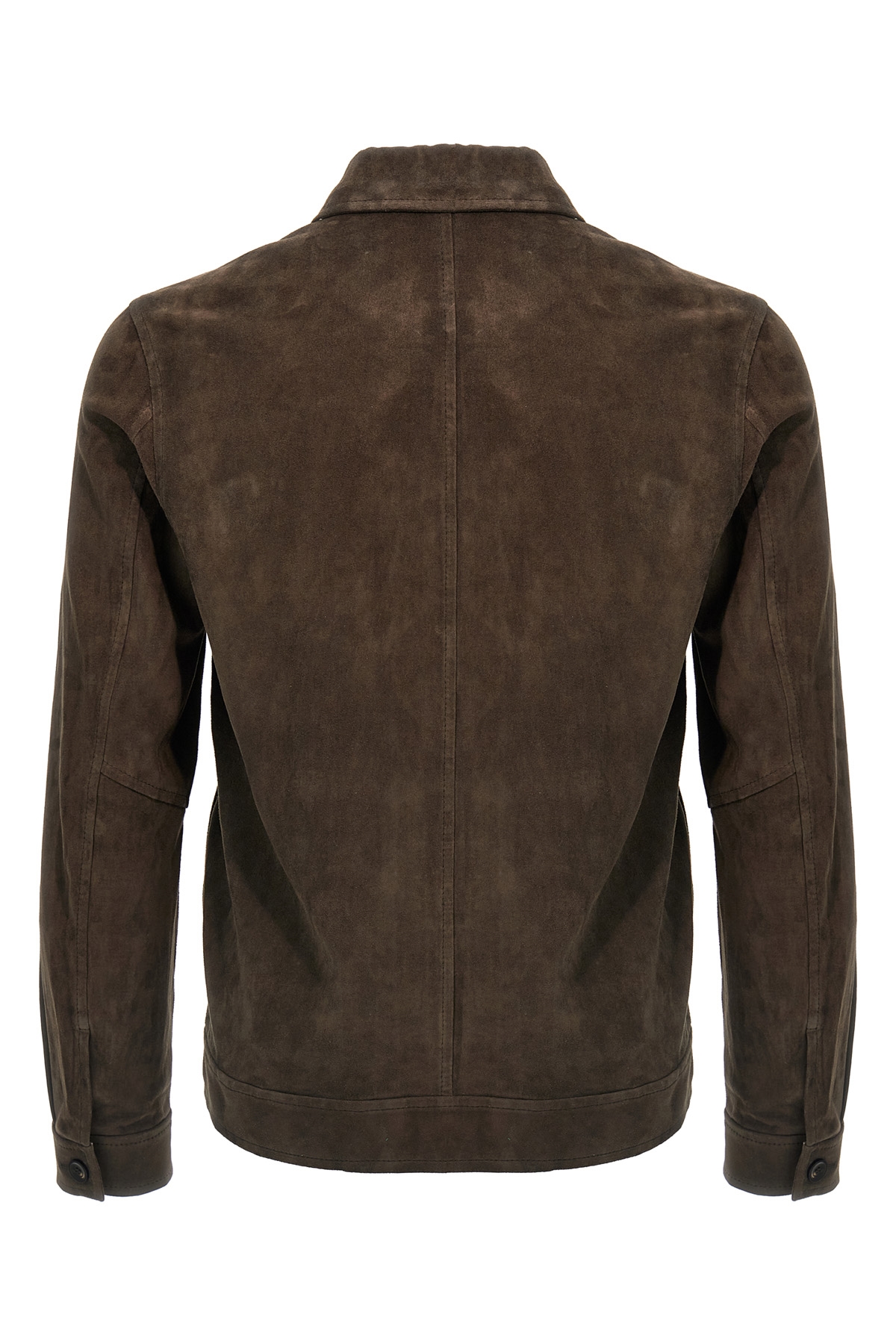 Vegetable tanned suede jacket, collar, pockets, zip closure, long cuffed sleeves.