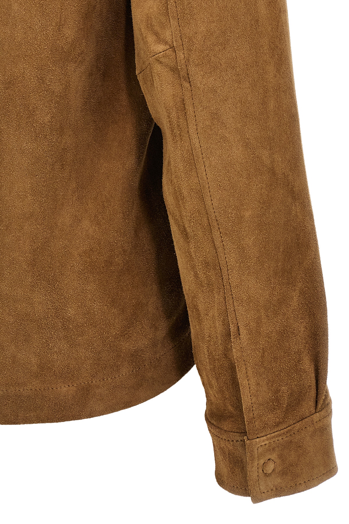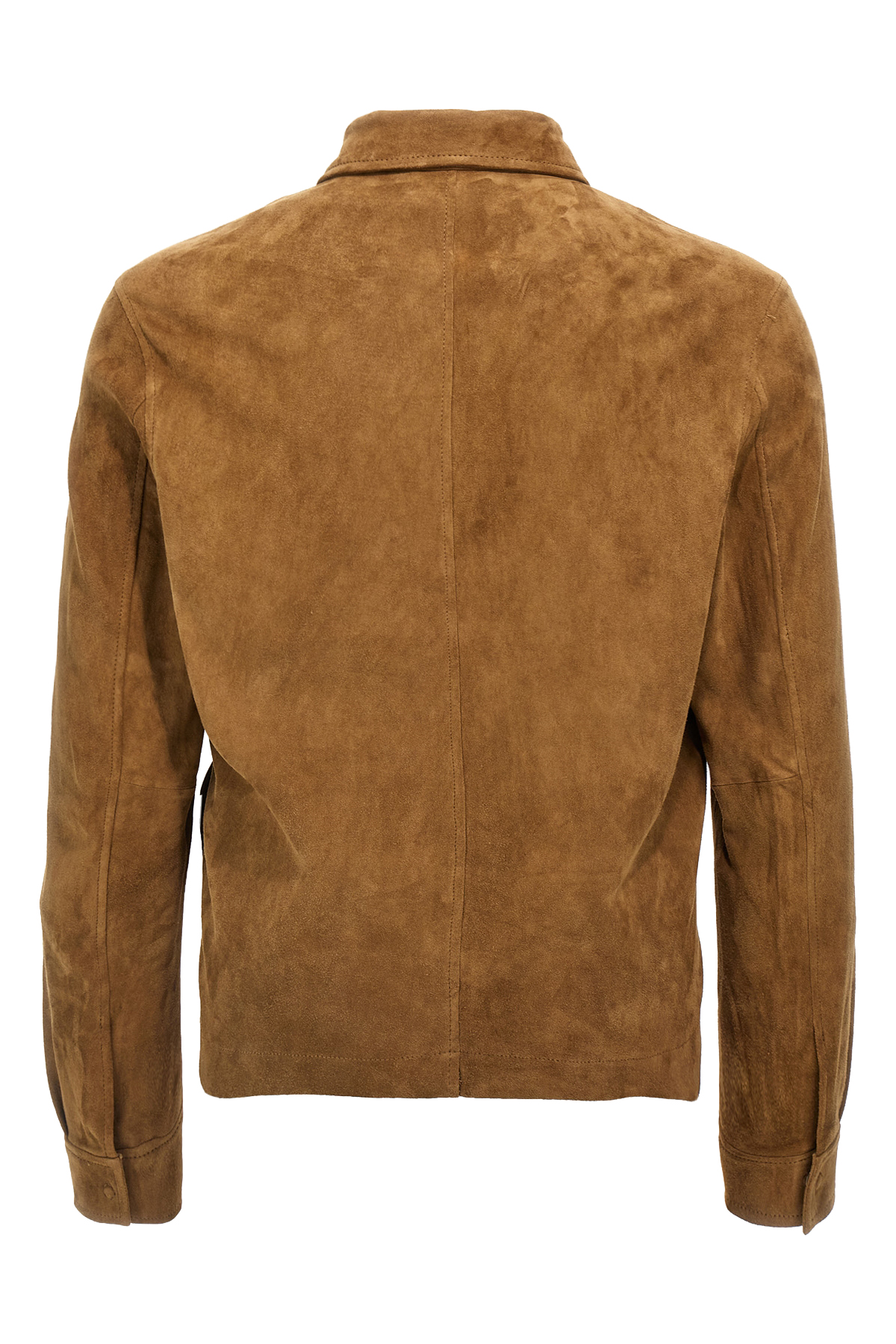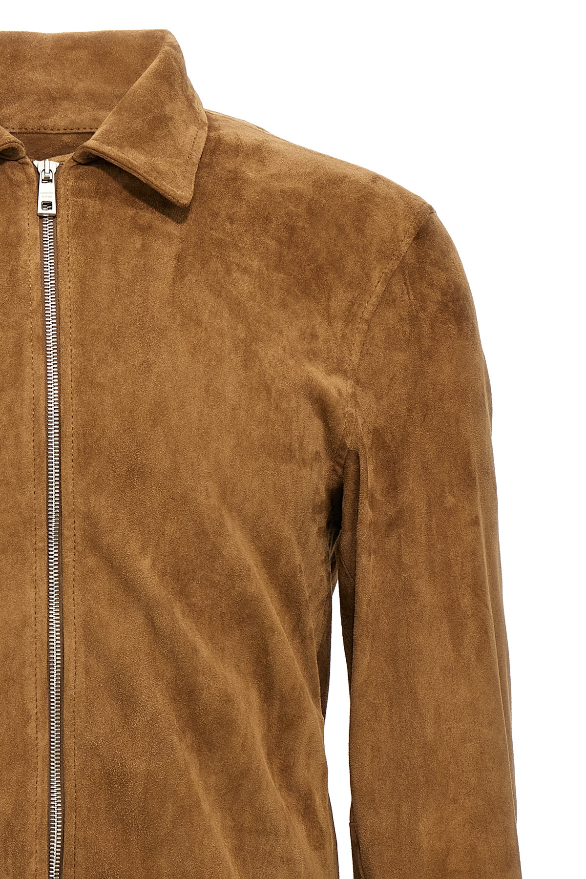 Vegetable tanned suede jacket, collar, pockets, zip closure, long cuffed sleeves.
