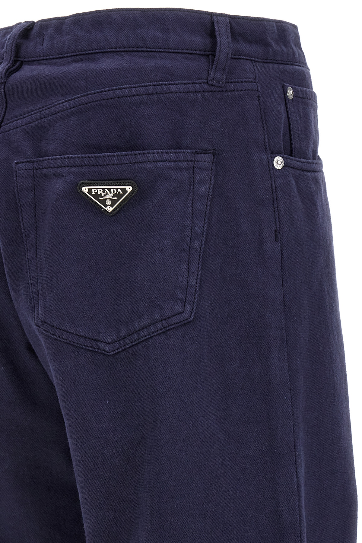 Garment-dyed cotton denim jeans, triangle logo in enameled metal on the back, five pockets, straight leg, button closure.