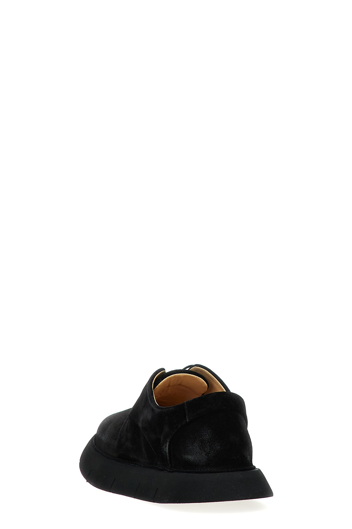 'Intagliata' reverse leather derby shoes with bag structure, rounded toe, laces closure, microrubber sole.