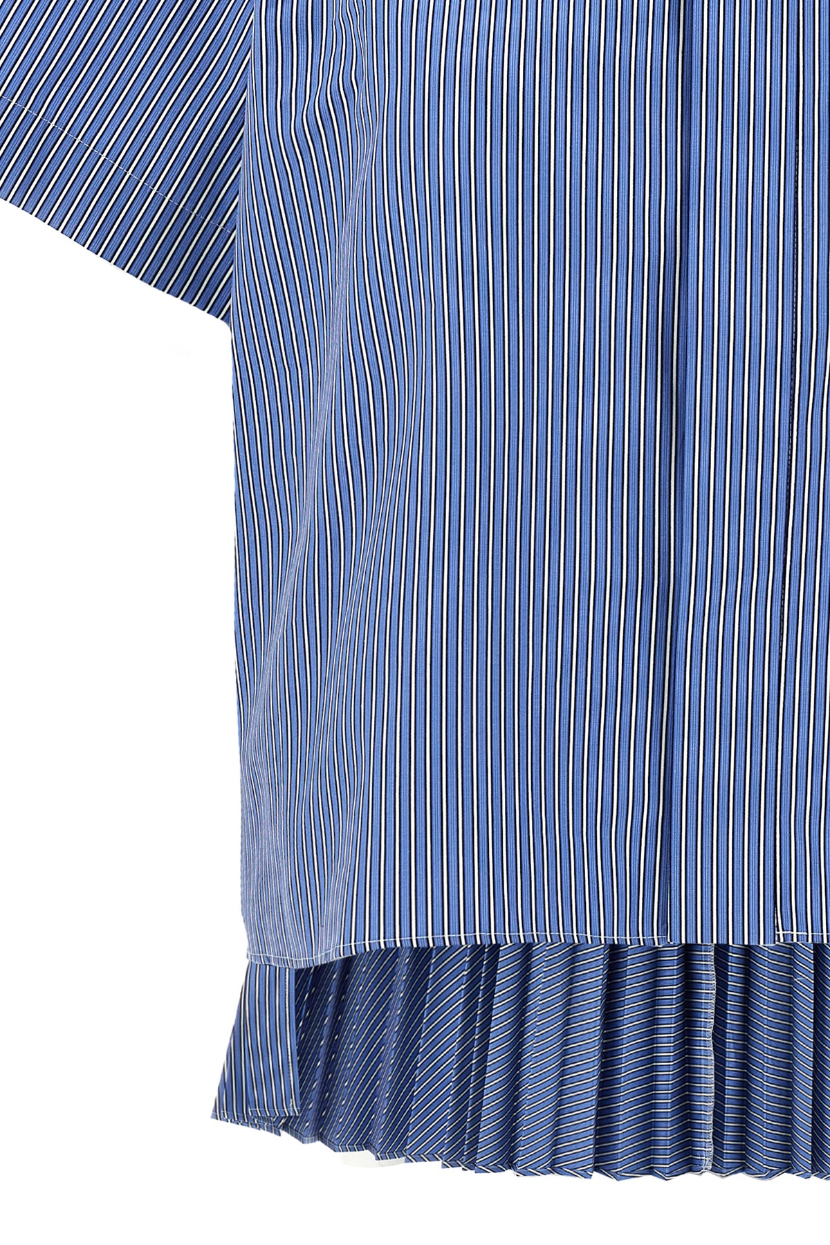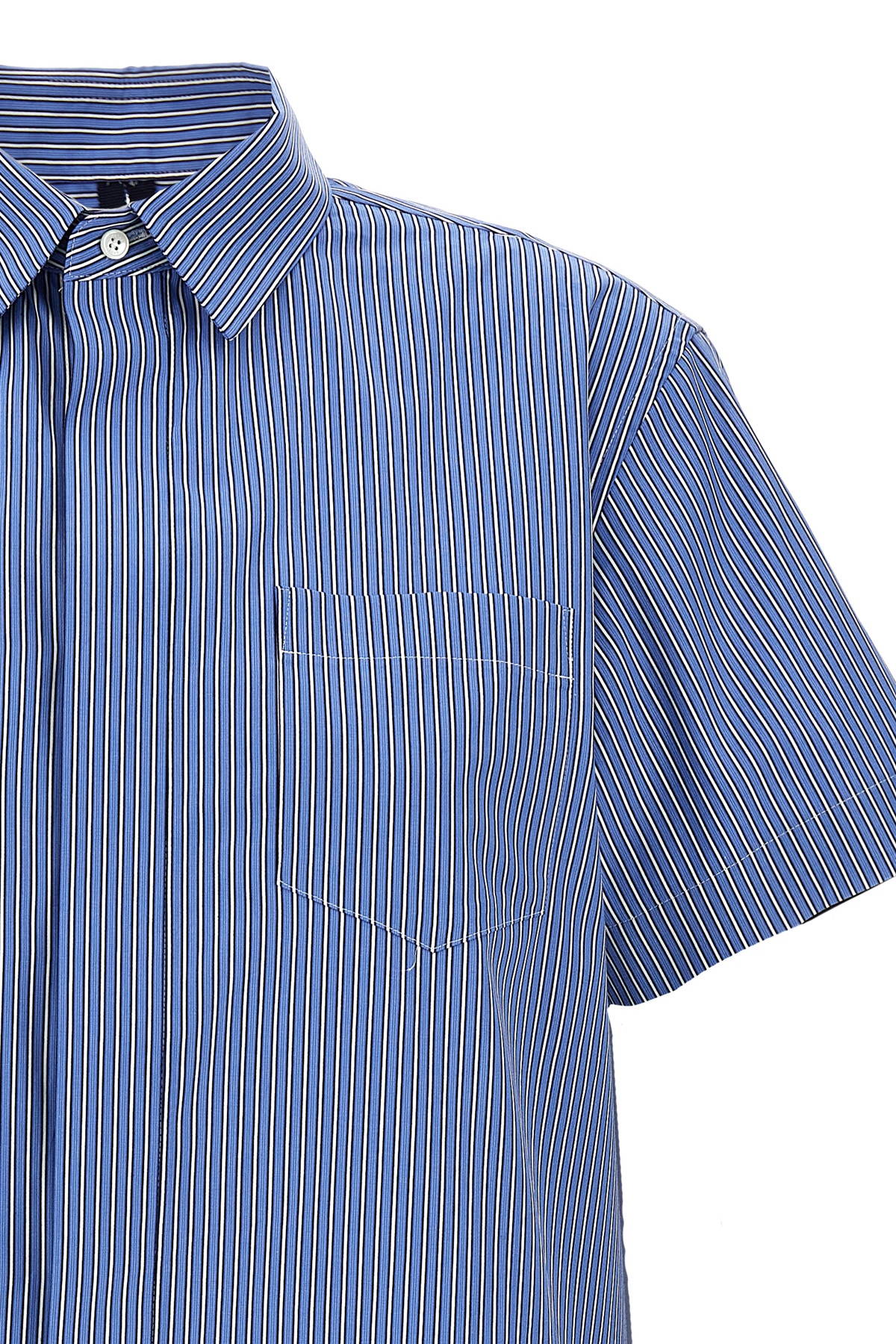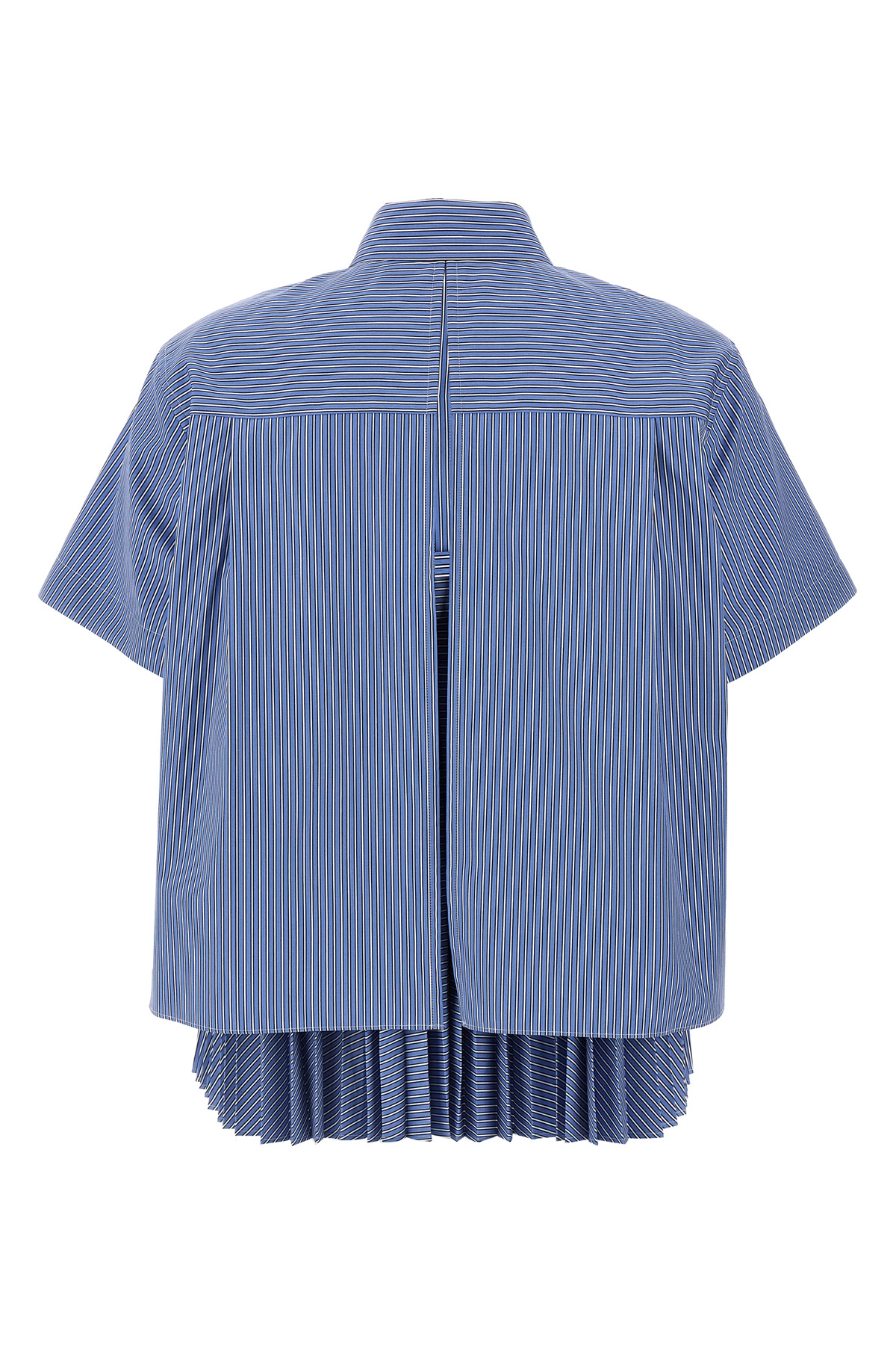 Striped cotton poplin shirt, chest pocket, button closure, short sleeves, crop style with back opening with asymmetric flounced insert.